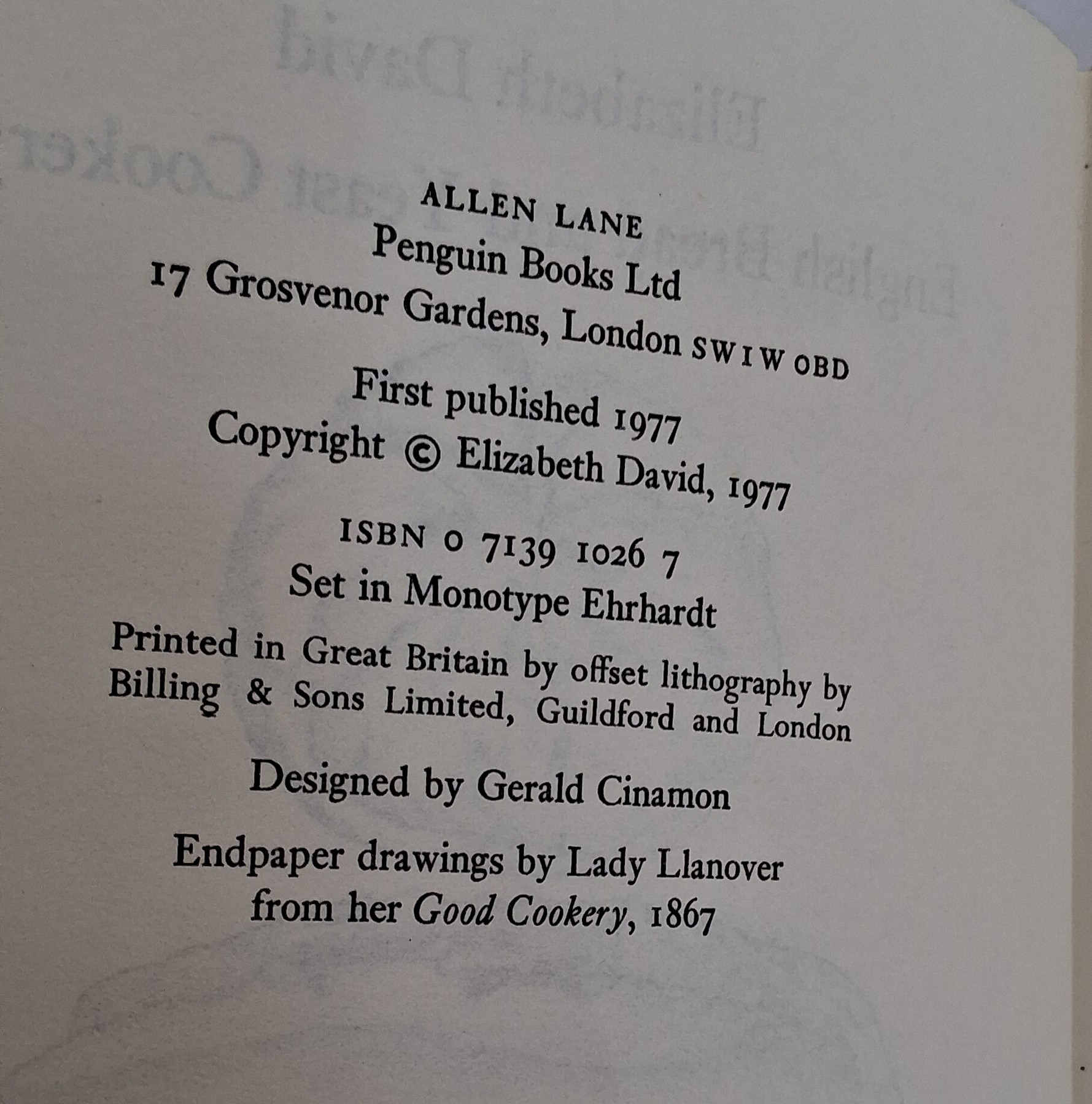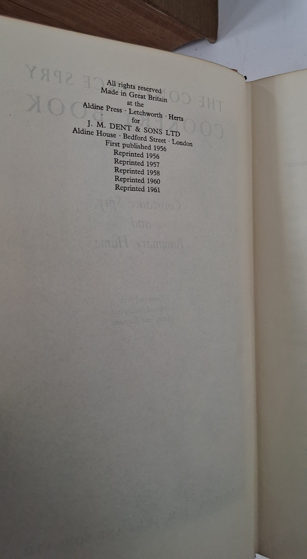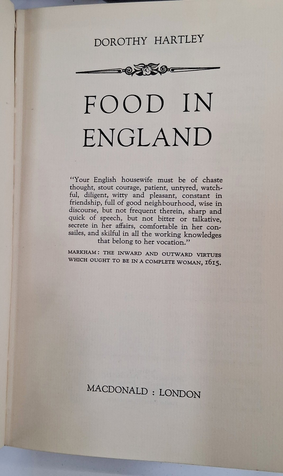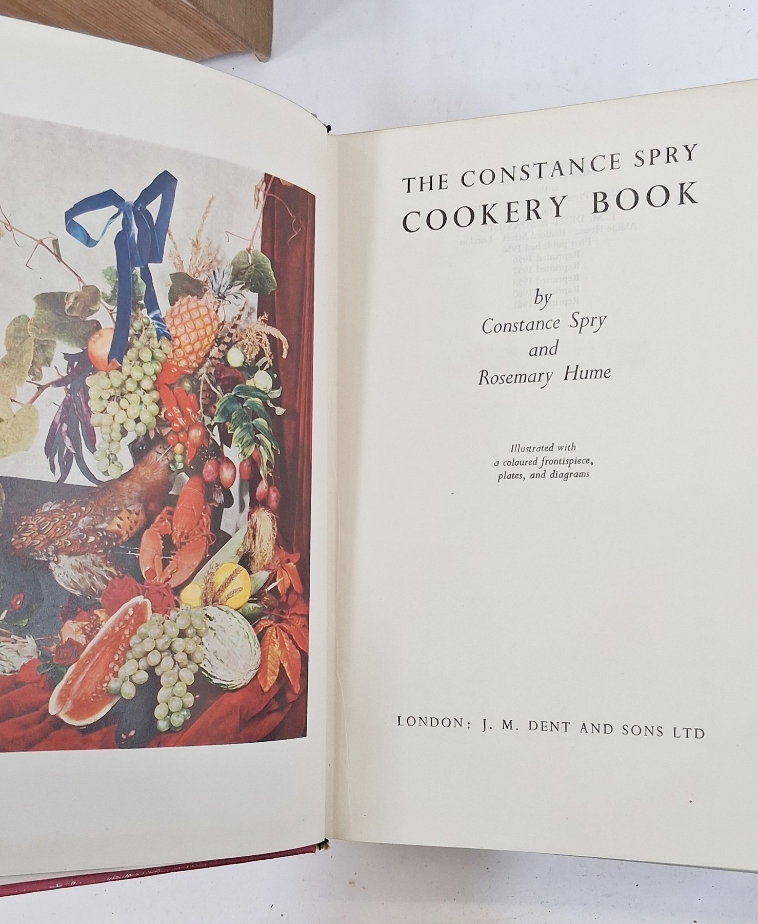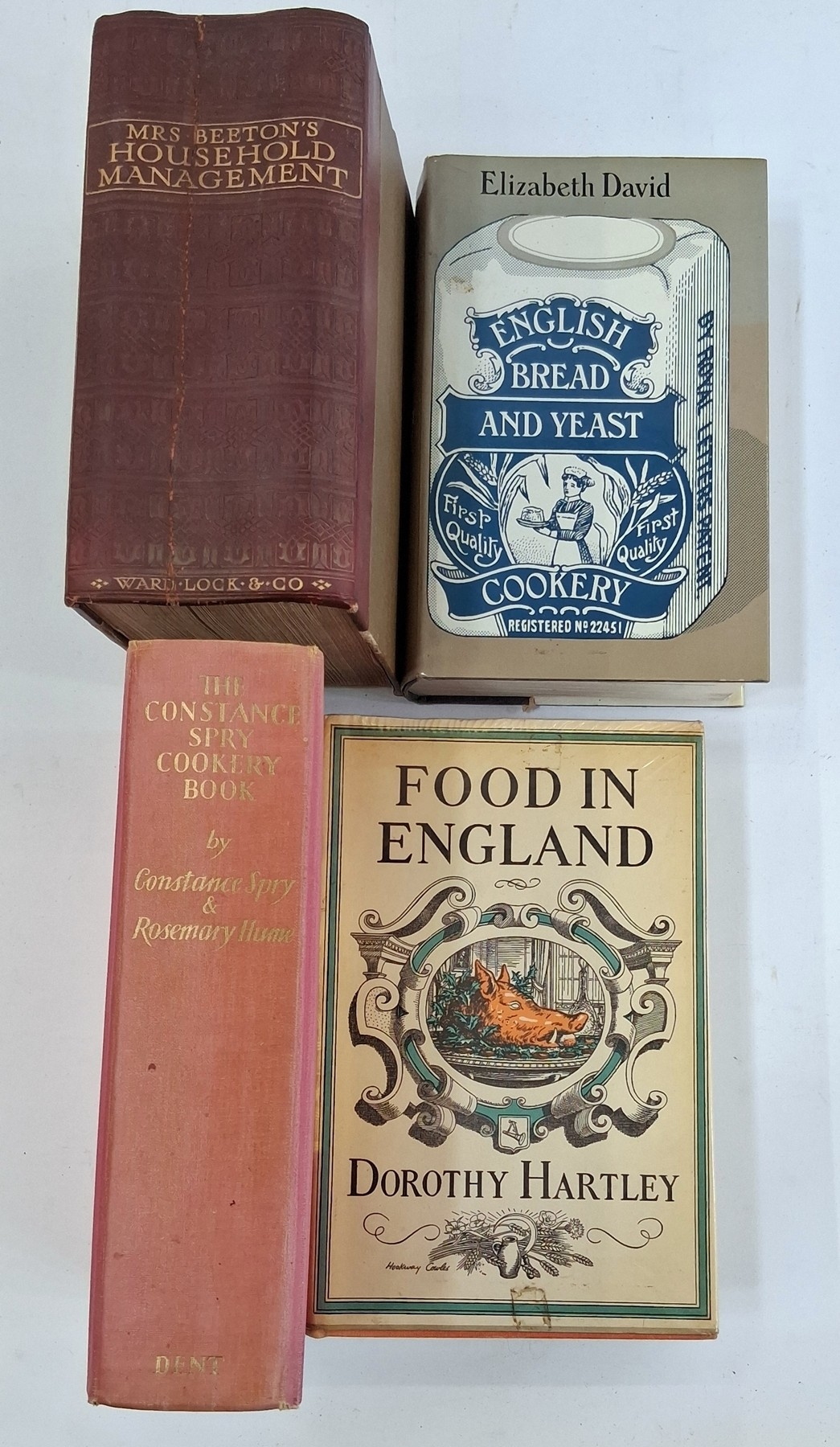 "Mrs Beeton's Household Management - a Complete Cookery Book ...", new edition, Ward Locke & Co, London and Melbourne, colour frontis, plates, photographic illustrations and colour plates throughout, half-leather over grey boards with gilt titles, Sprye, Constance and Hulme, Rosemary "The Constance Sprye Cookery Book", JM Dent & Son 1961, numerous photographic illustrations, colour frontis, purple cloth with gilt decorations, David, Elizabeth "English Bread and Yeast", David, Elizabeth "Bread and Yeast", illustrations by Wendy Jones, published Alan Lane 1977, photographic illustrations, blue cloth, d-w not price clipped, Hartley, Dorothy "Food in England", Macdonald 1962, sellotape damage to ffep, illustrations photographic and other, d-w (4)