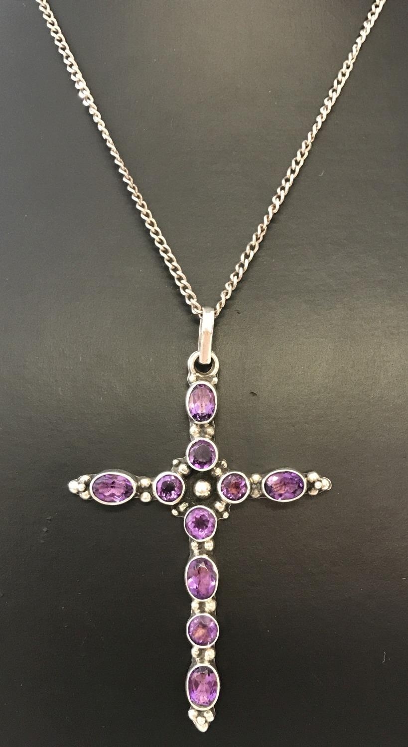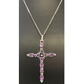 A silver cross pendant set with oval and round cut amethyst stones on a fine curb chain. Chain length approx. 24".