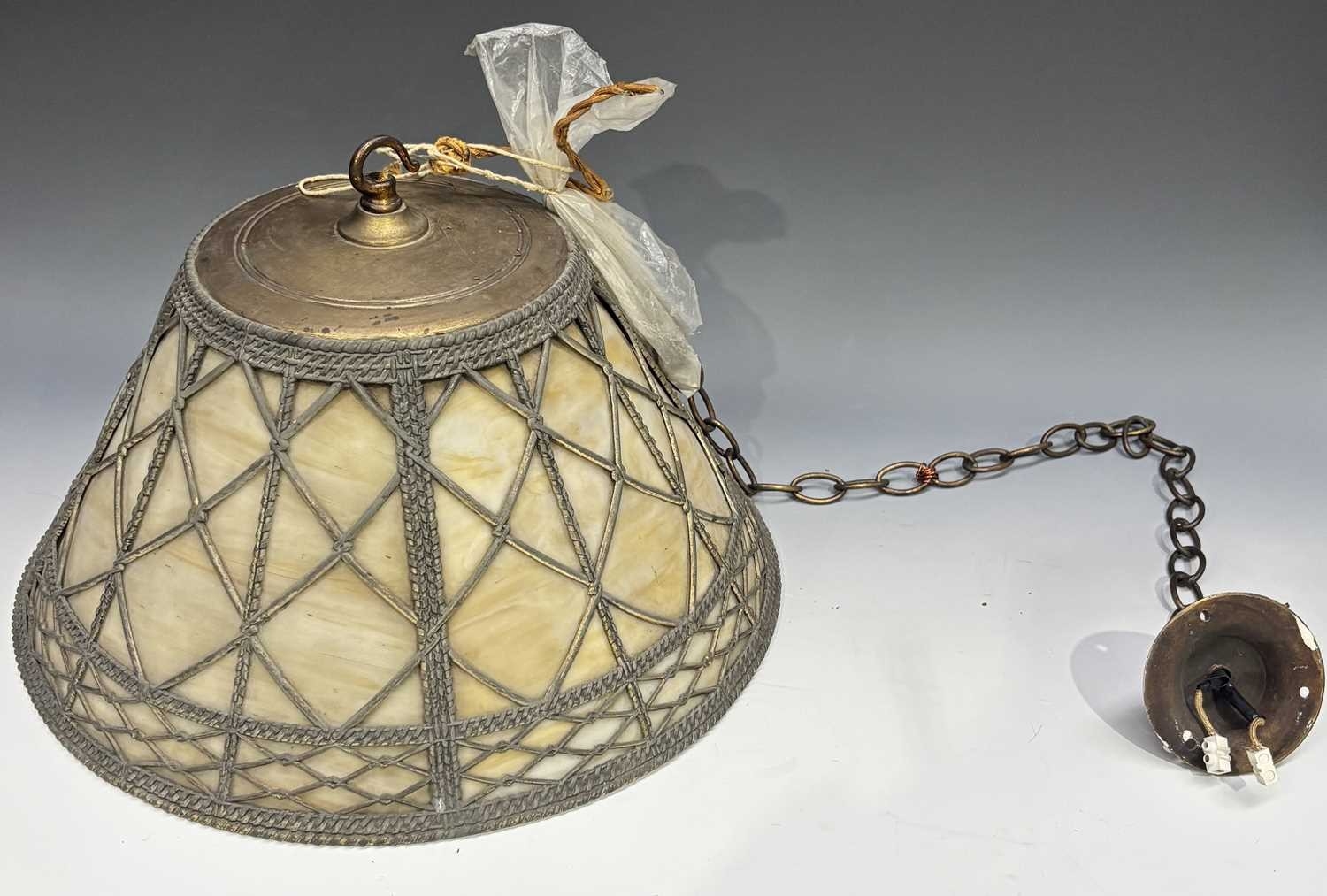 A ceiling pendant light, flared form, slag glass panels with brass wire overlay, 20cm high, 39cm diameter