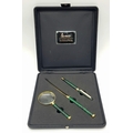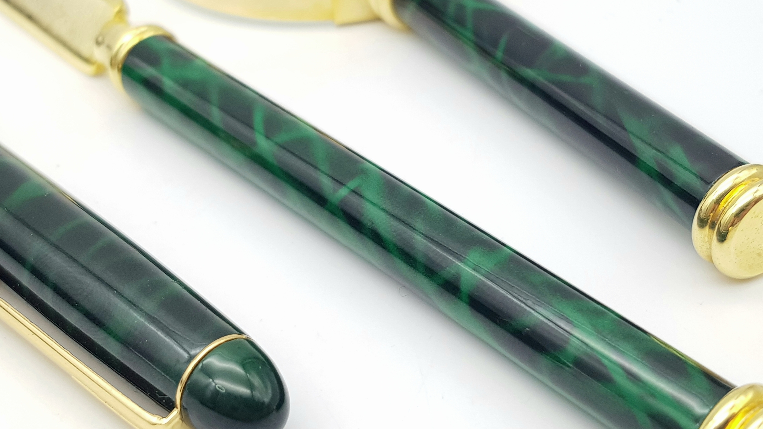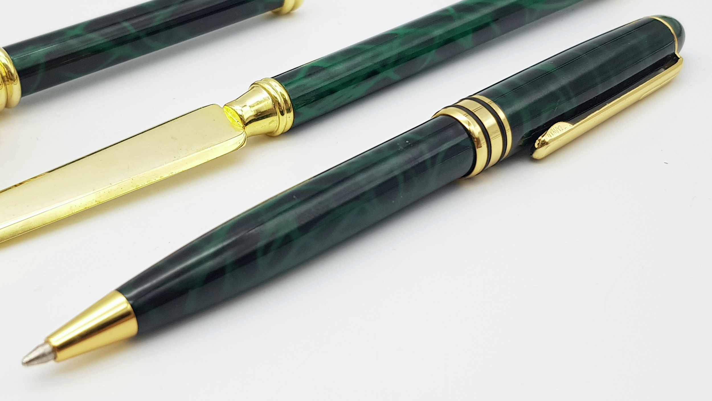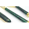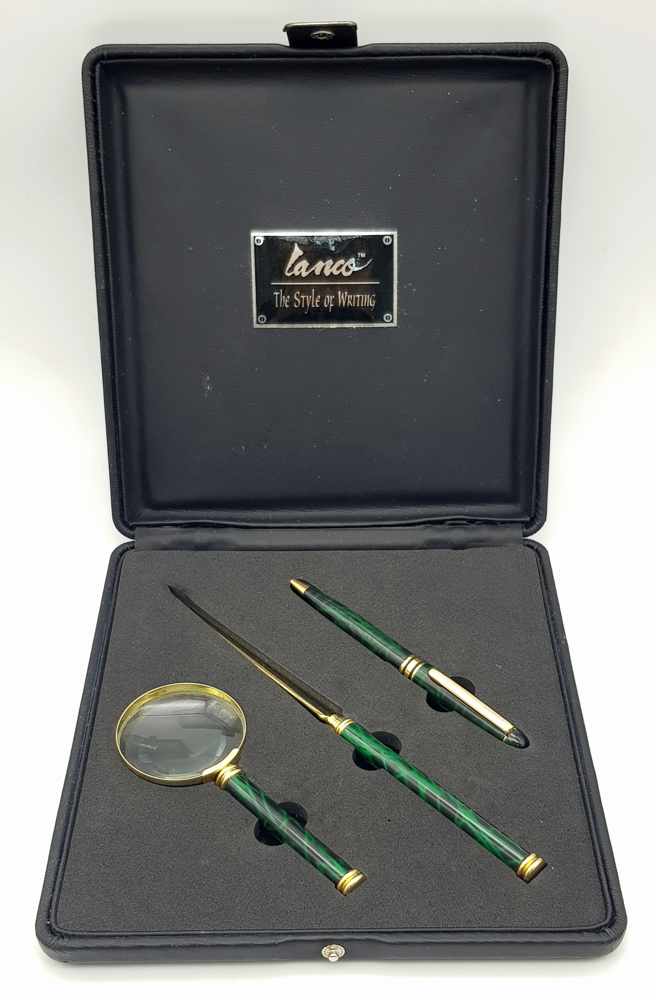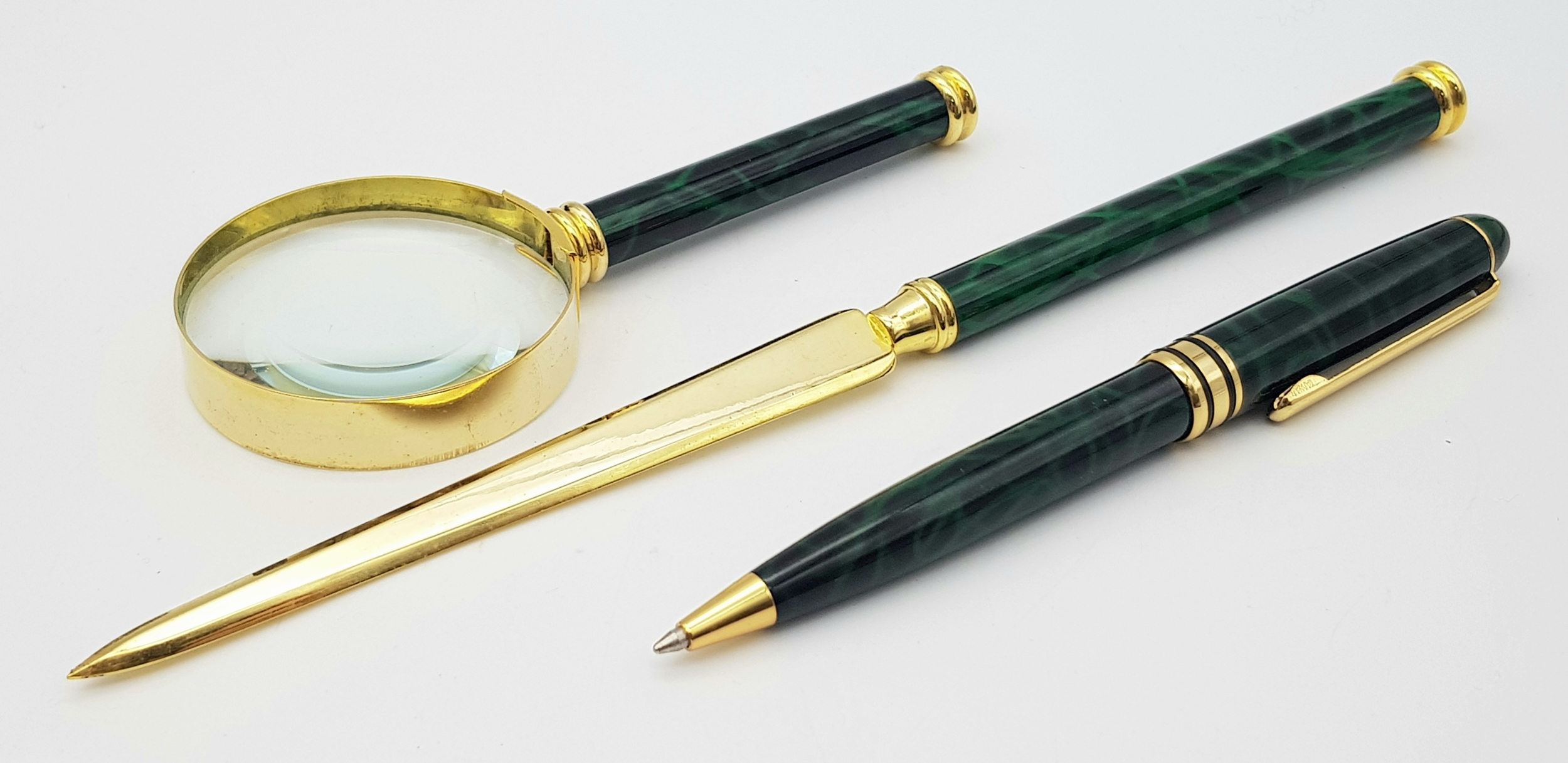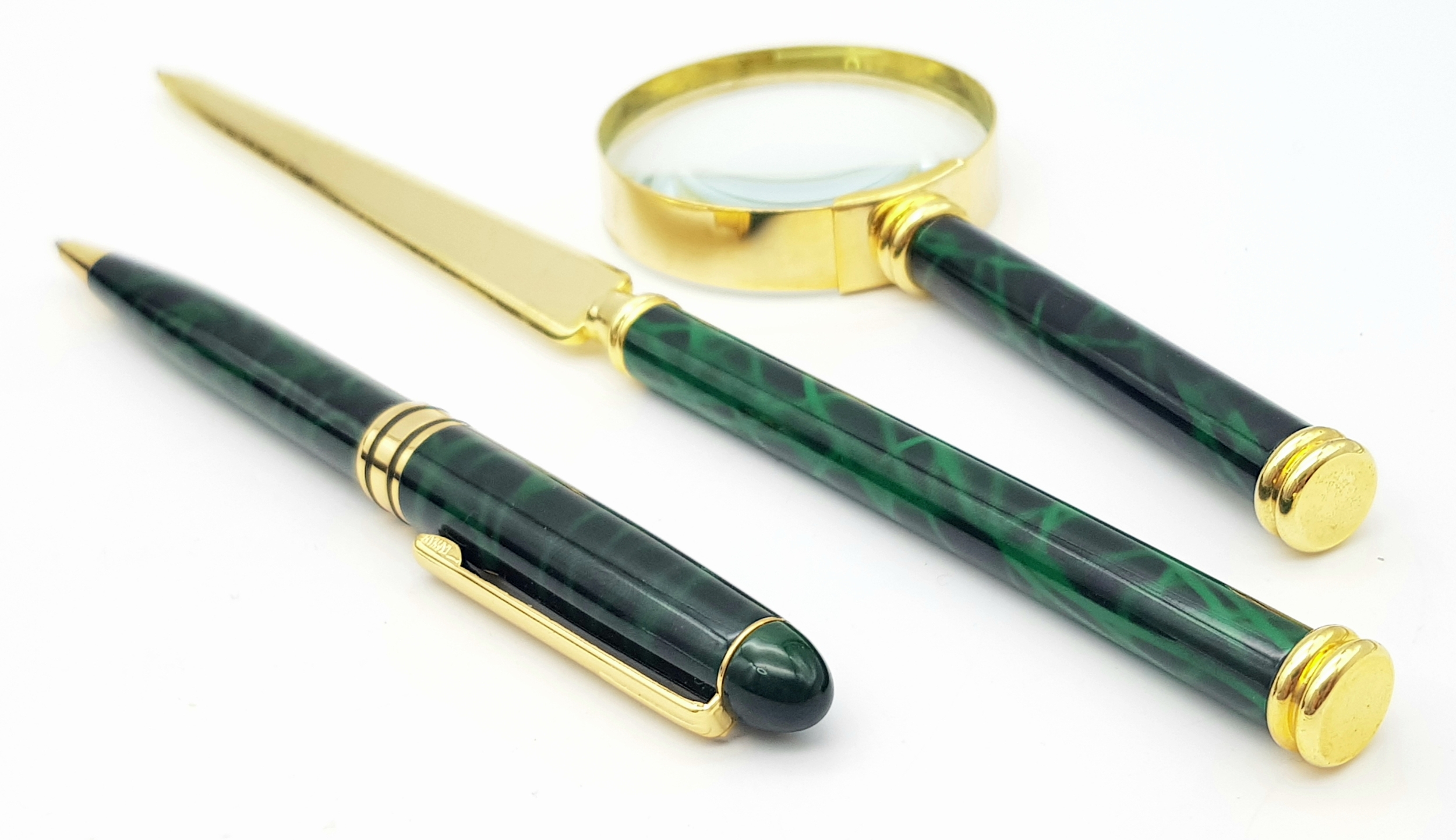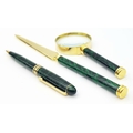 A Lanco Vintage Stationary Set. Ballpoint pen. letter opener and magnifying glass. Malachite and gilded finish. Original fitted case.