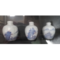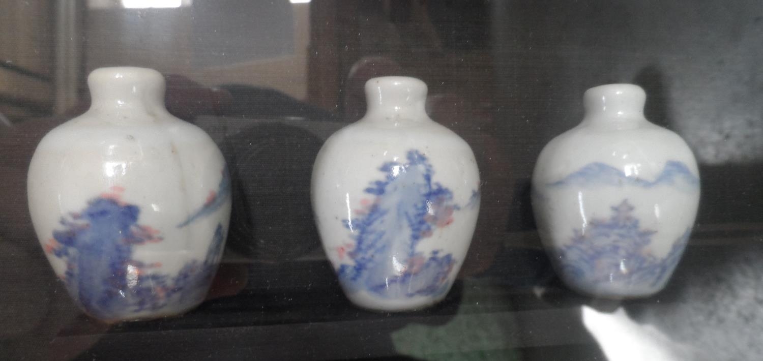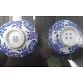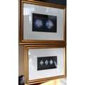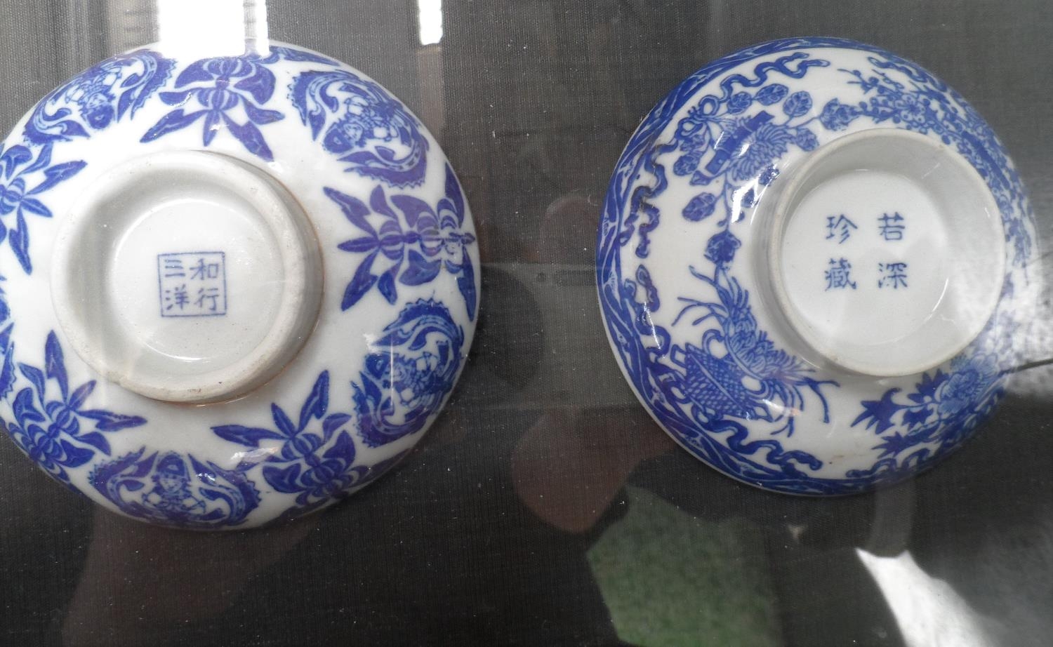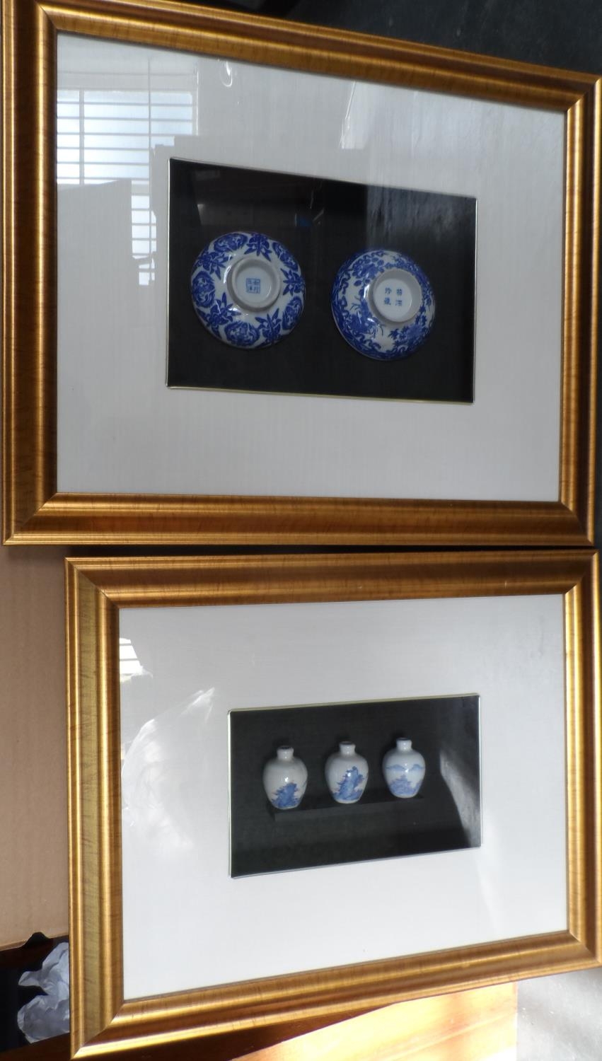 Two gilt framed pictures, one containing two Chinese blue & white signed bowls together with another that contains 3 small Oriental vases (2)