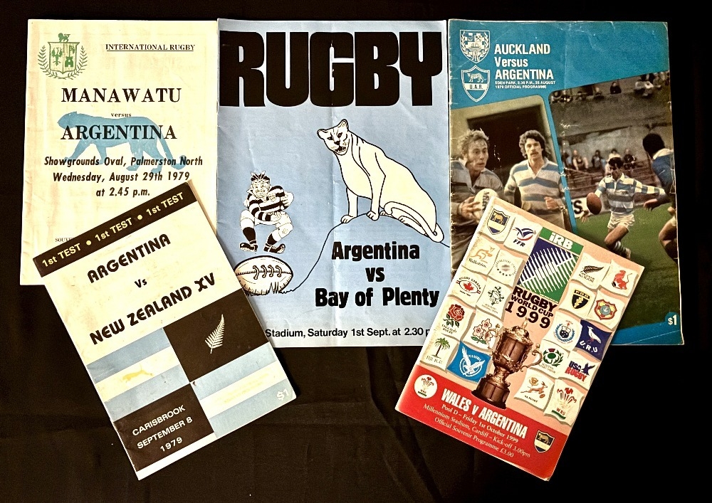 1979 and 1999 Argentina in NZ and Wales Rugby Programmes (5): 79 in NZ v Manawatu, Auckland, Bay of Plenty and a NZ XV; RWC 99 v Wales. VG