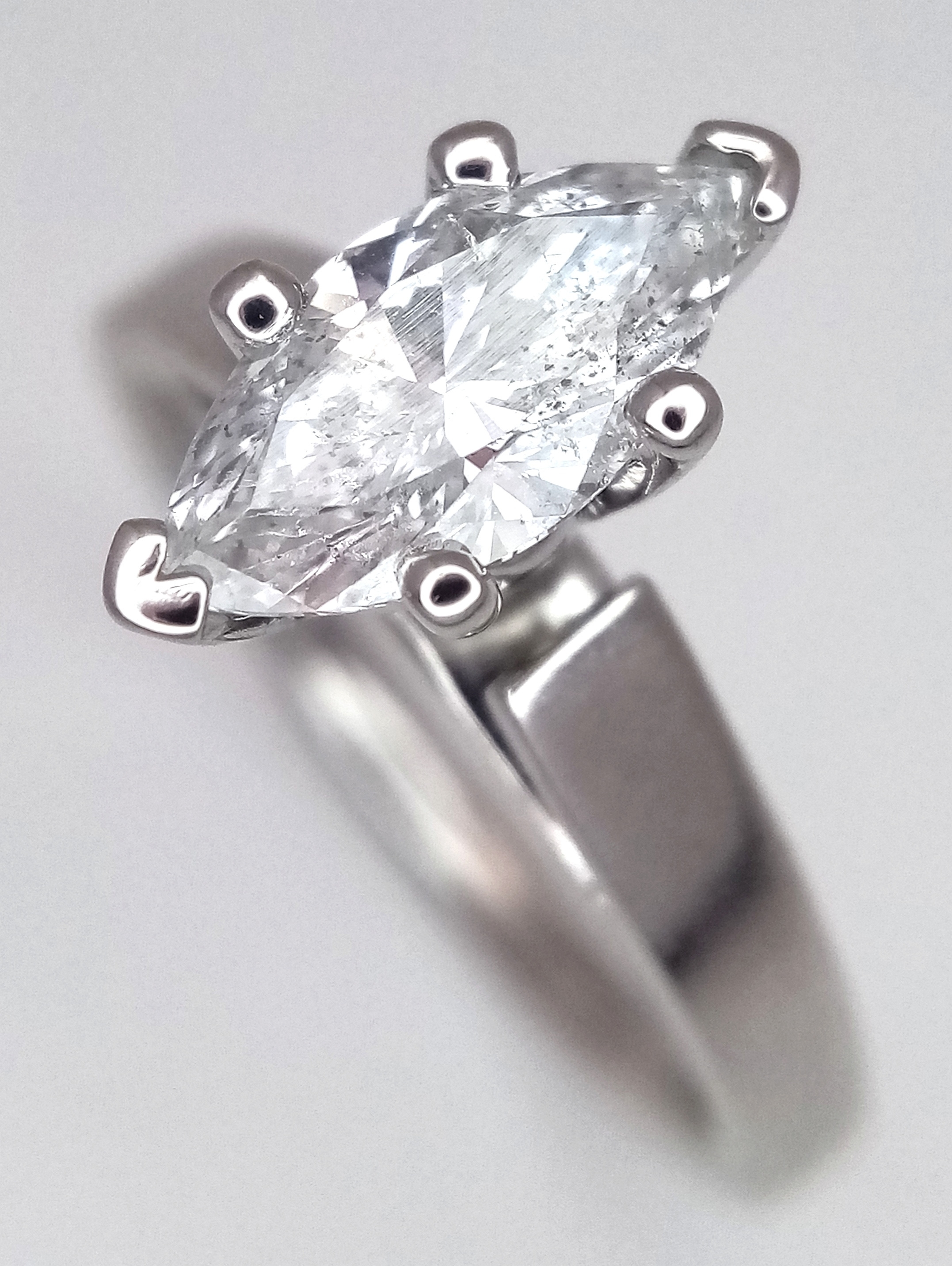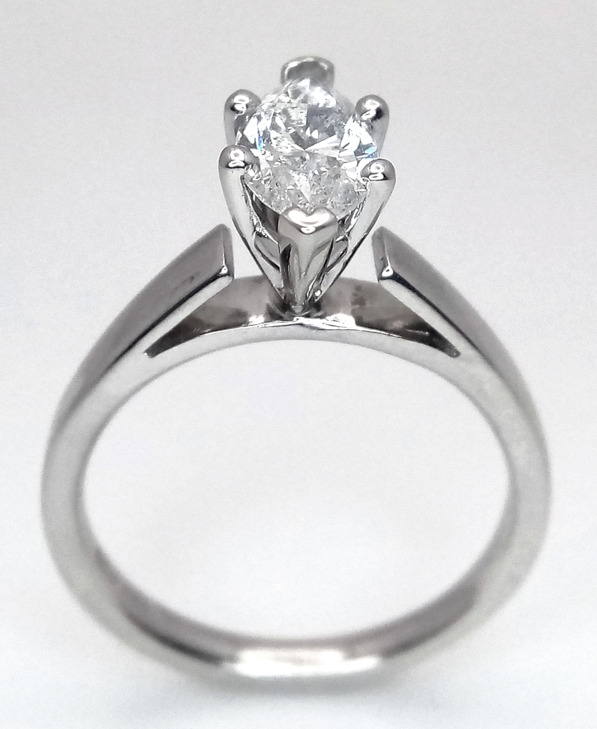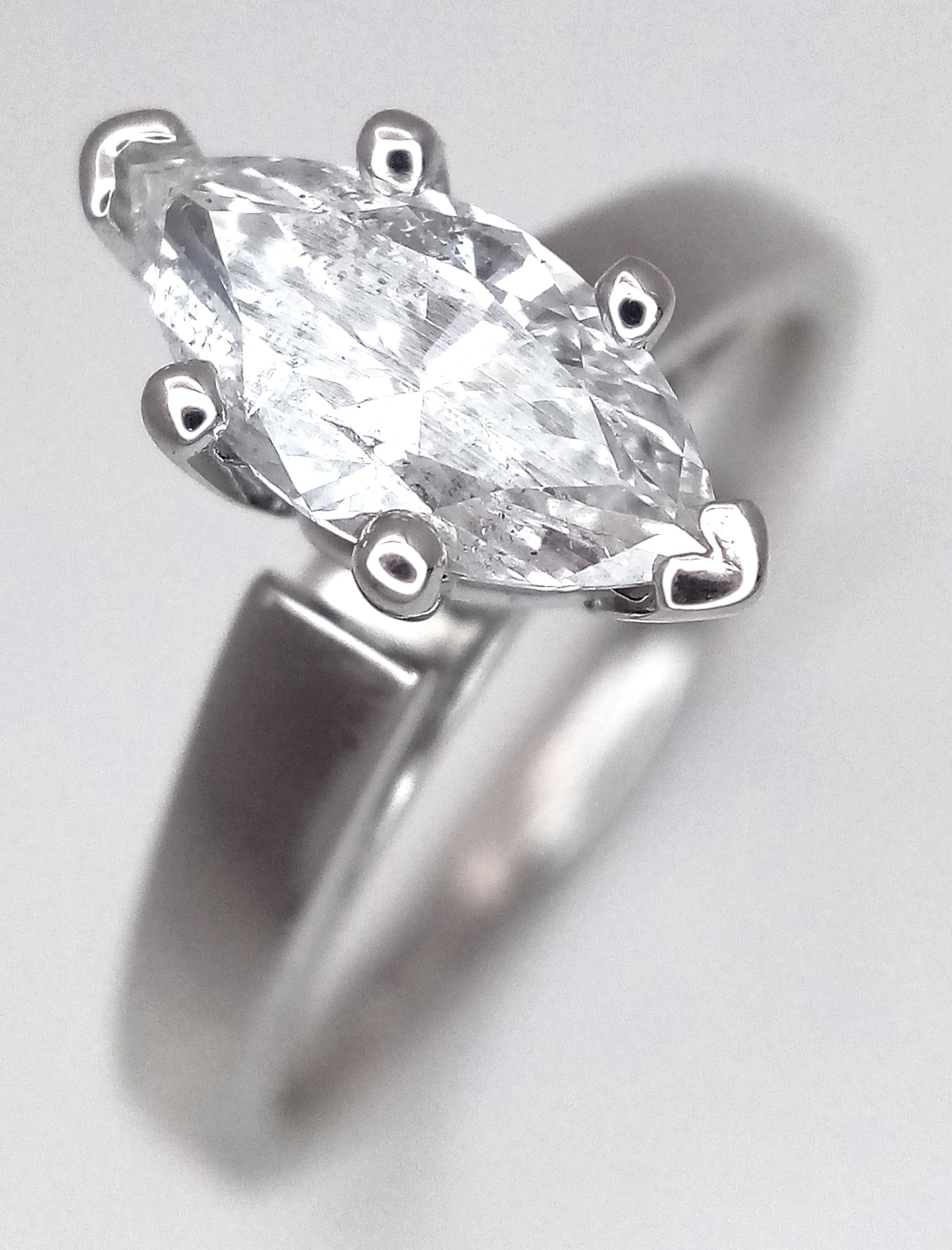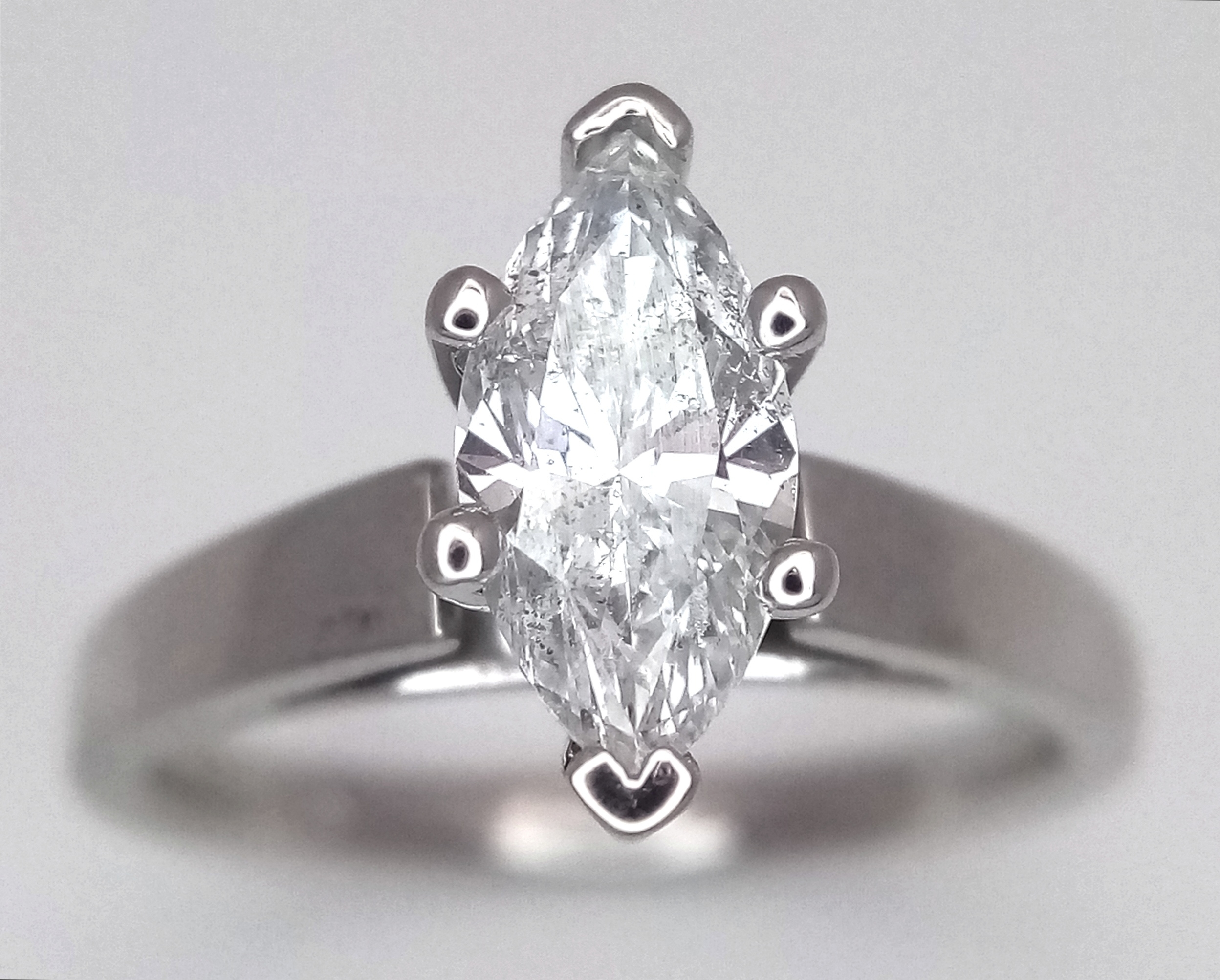 A 14K WHITE GOLD DIAMOND SOLITAIRE RING MARQUISE CUT 1.06CT DIAMOND 4.4G SIZE N. Ref: SPSA 7014