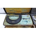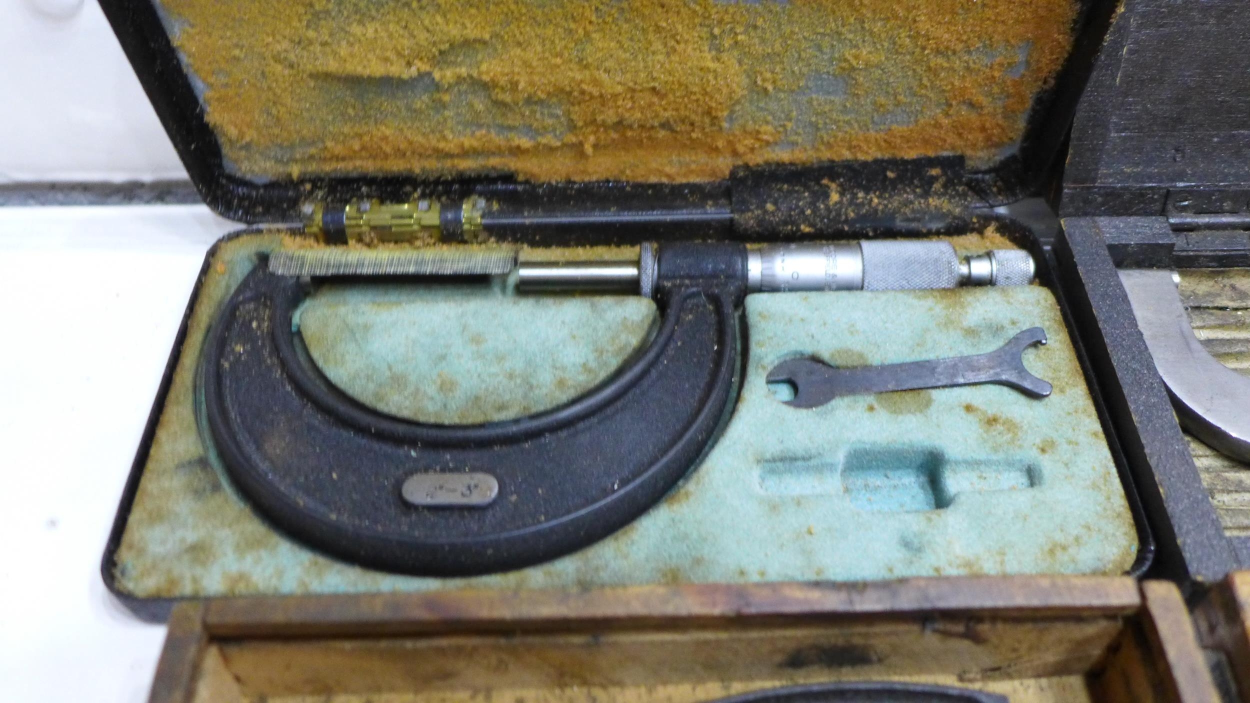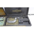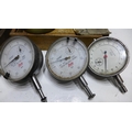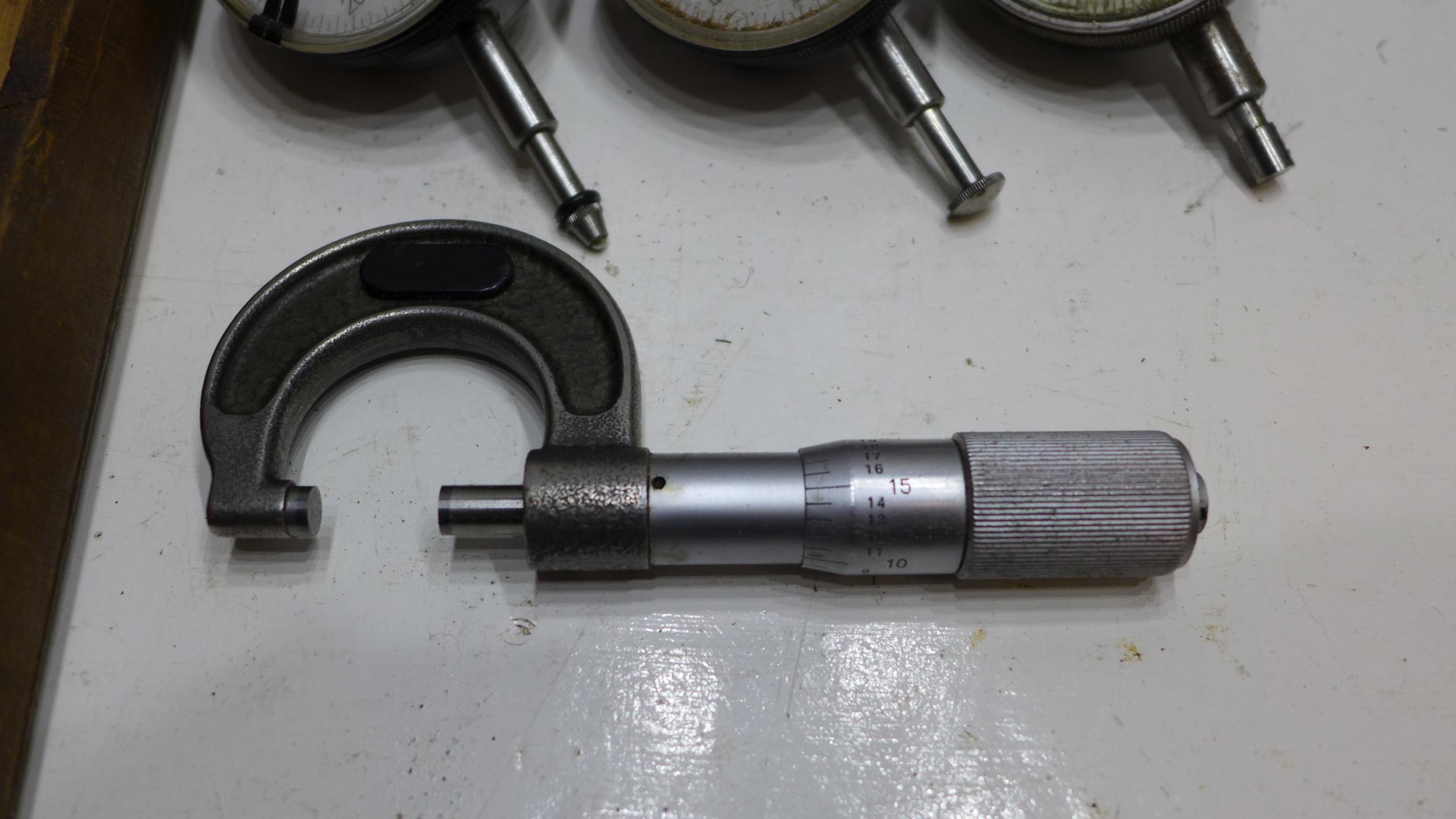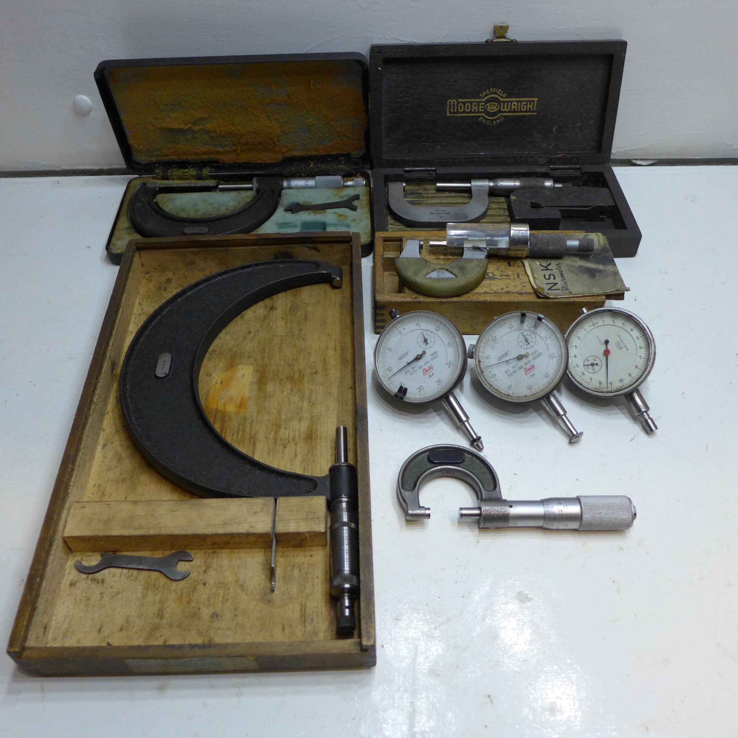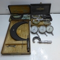 Box containing 5 micrometers & 3 dial gauges (outside, Brown and Sharp, M & W, etc.)