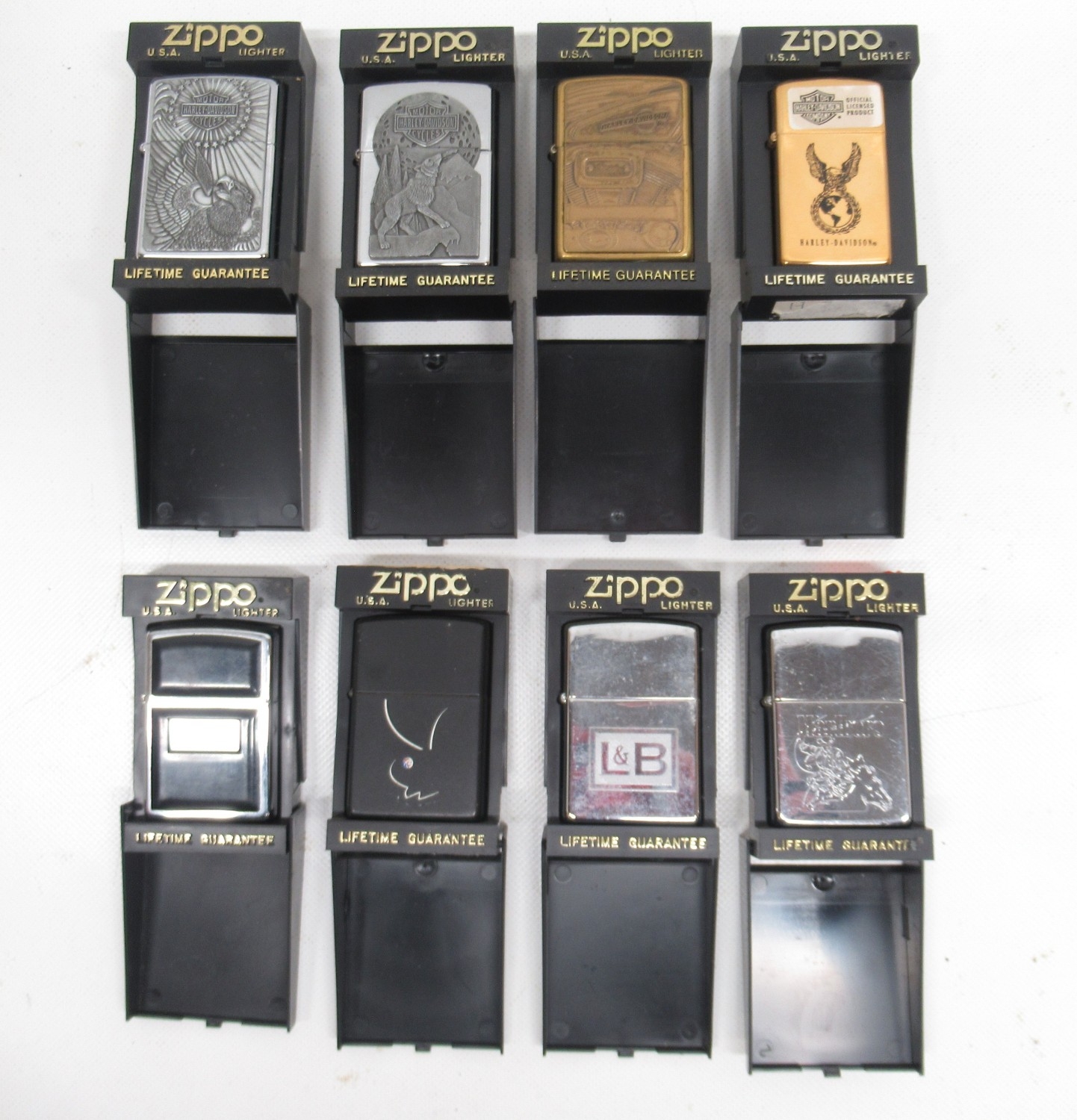 Four Zippo Harley Davidson lighters and four other Zippo lighters