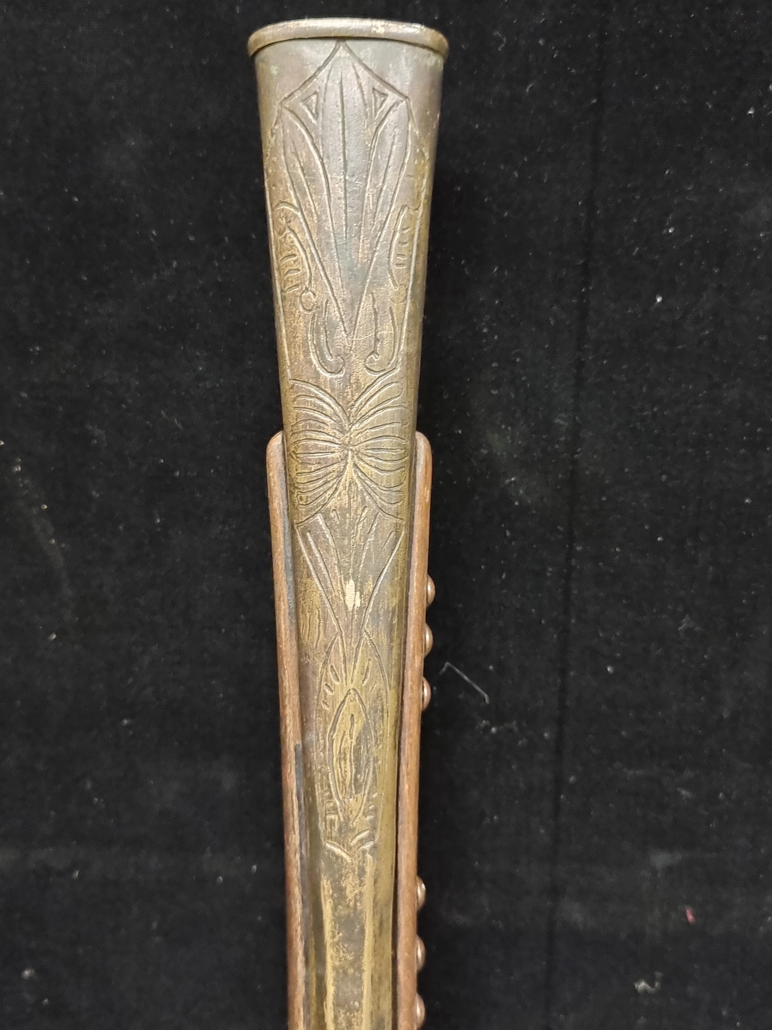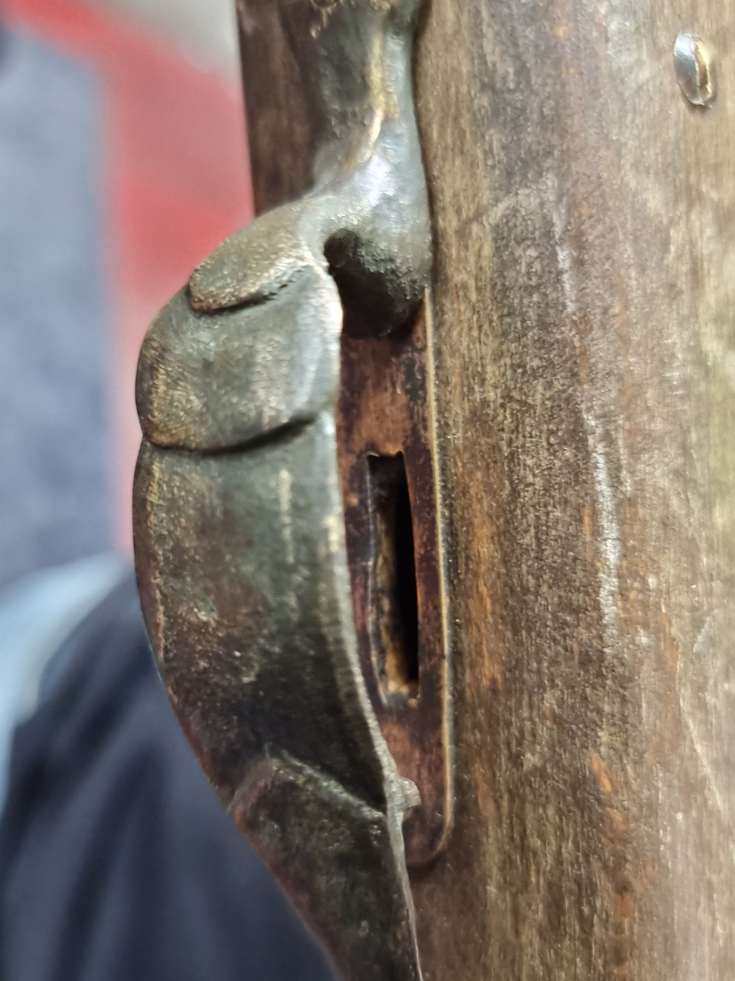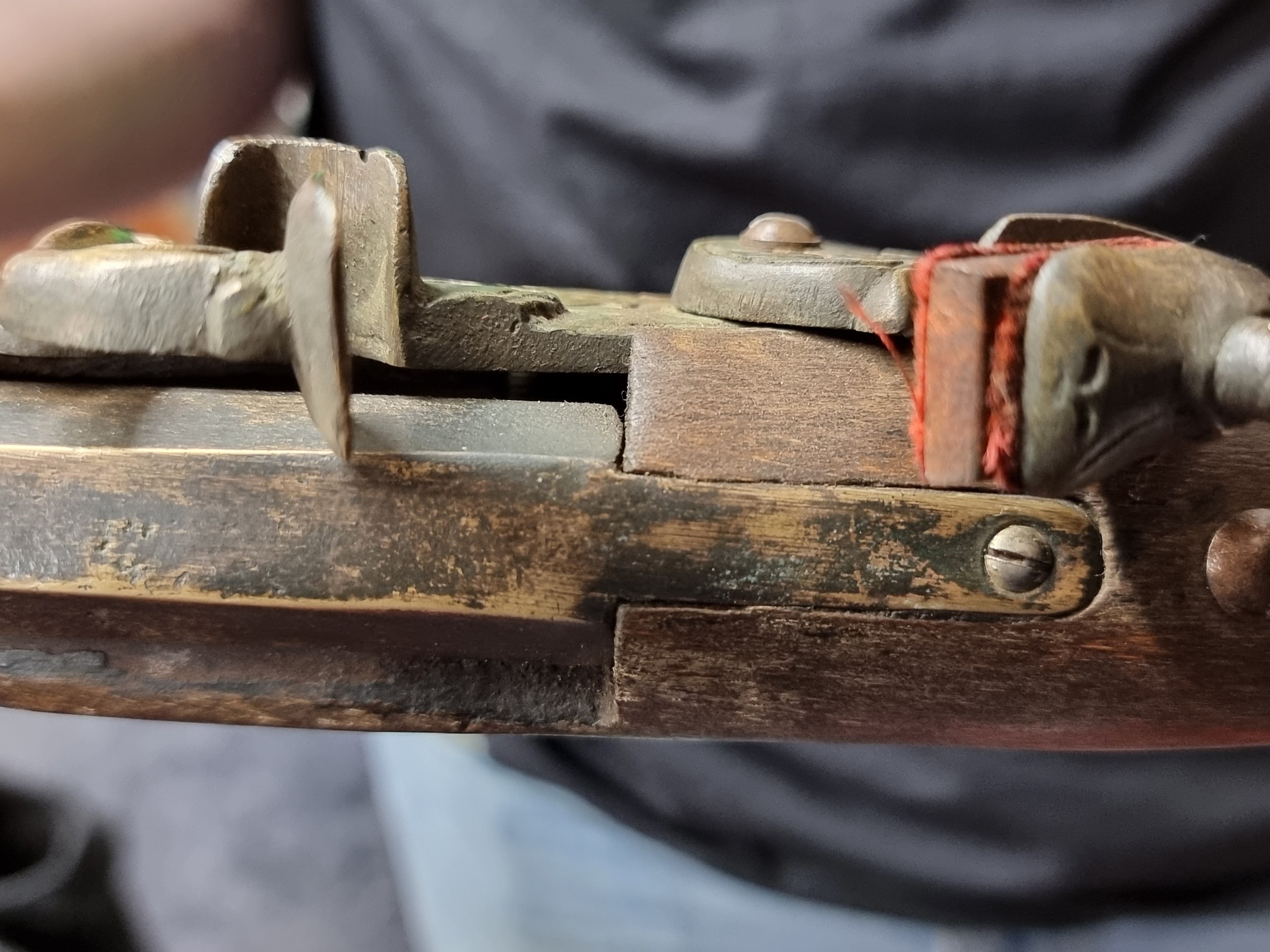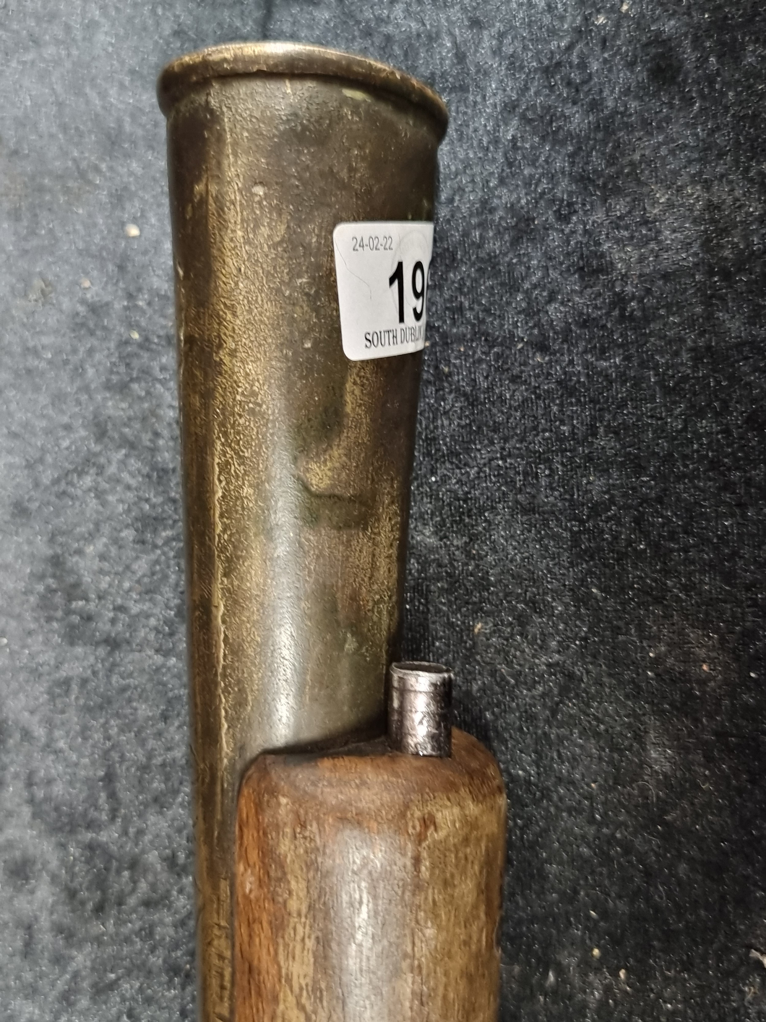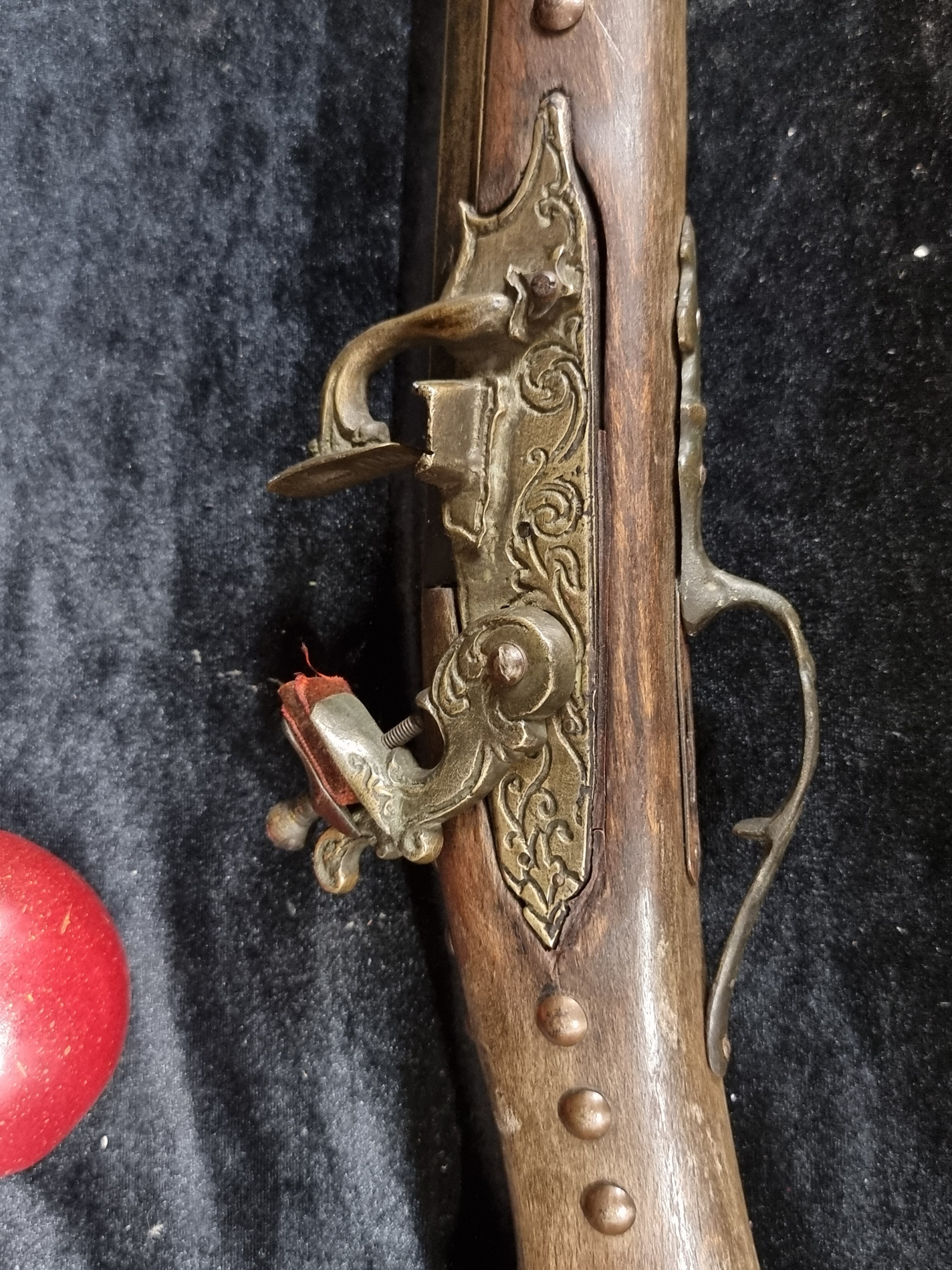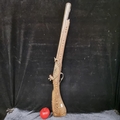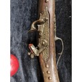 A heavy wooden and brass Flintlock Blunderbuss with a short, large caliber barrel which is flared at the muzzle. L 85cm. Looks to have age but probably a wall hanger.