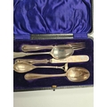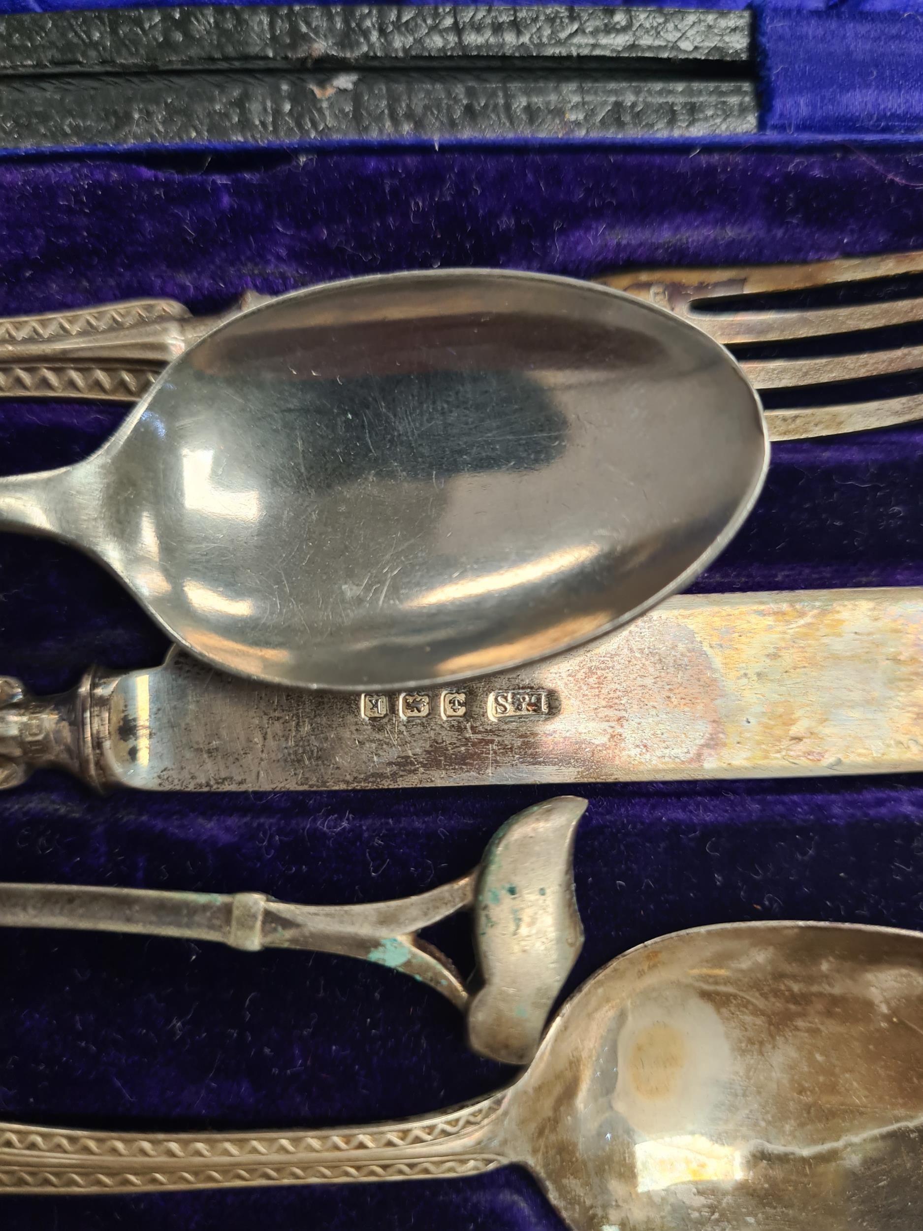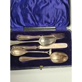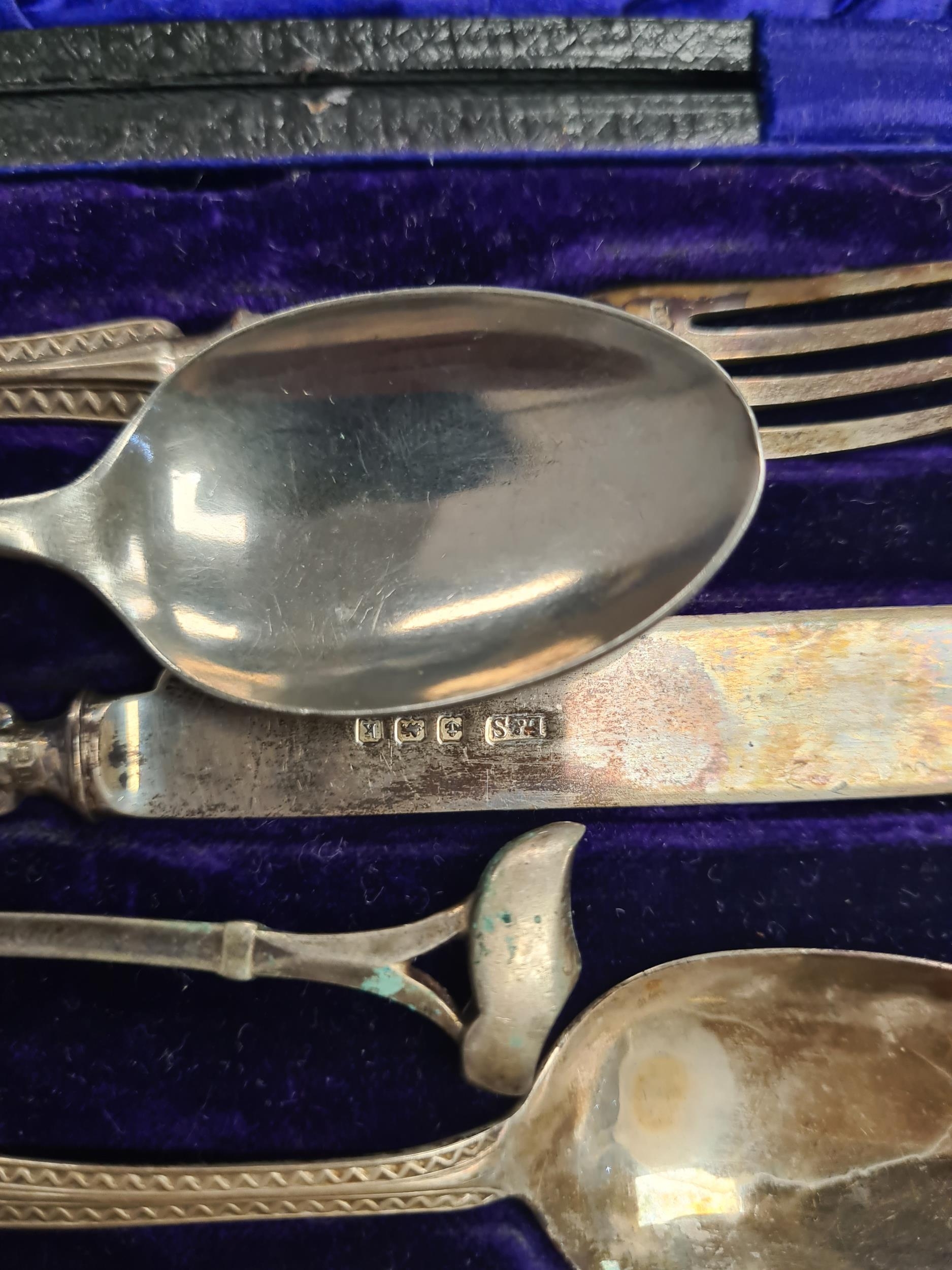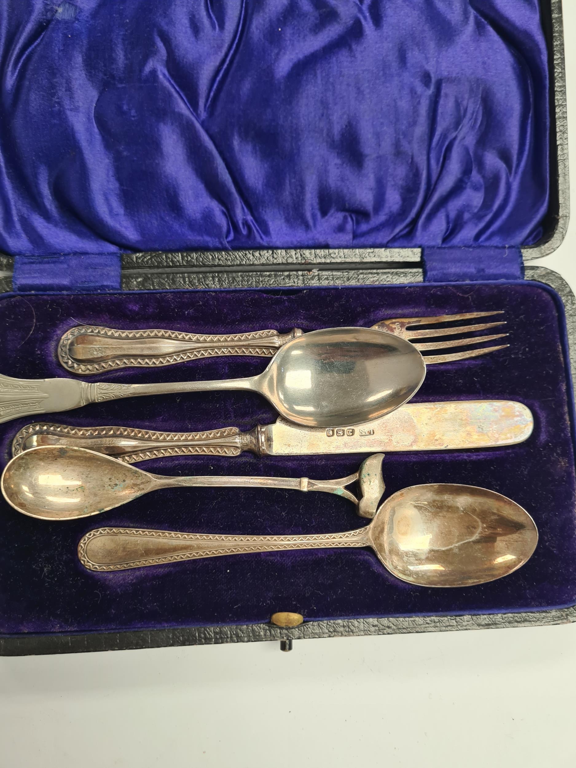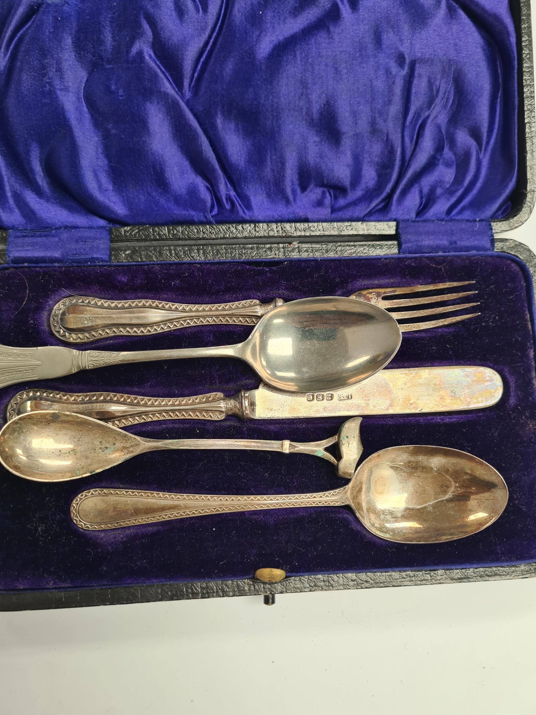 A cased christening set by Levi and Salaman, Birmingham 1908 - 1909. Patterned bordered handle. 1.55ozt approx. Condition Report: Some bending to items