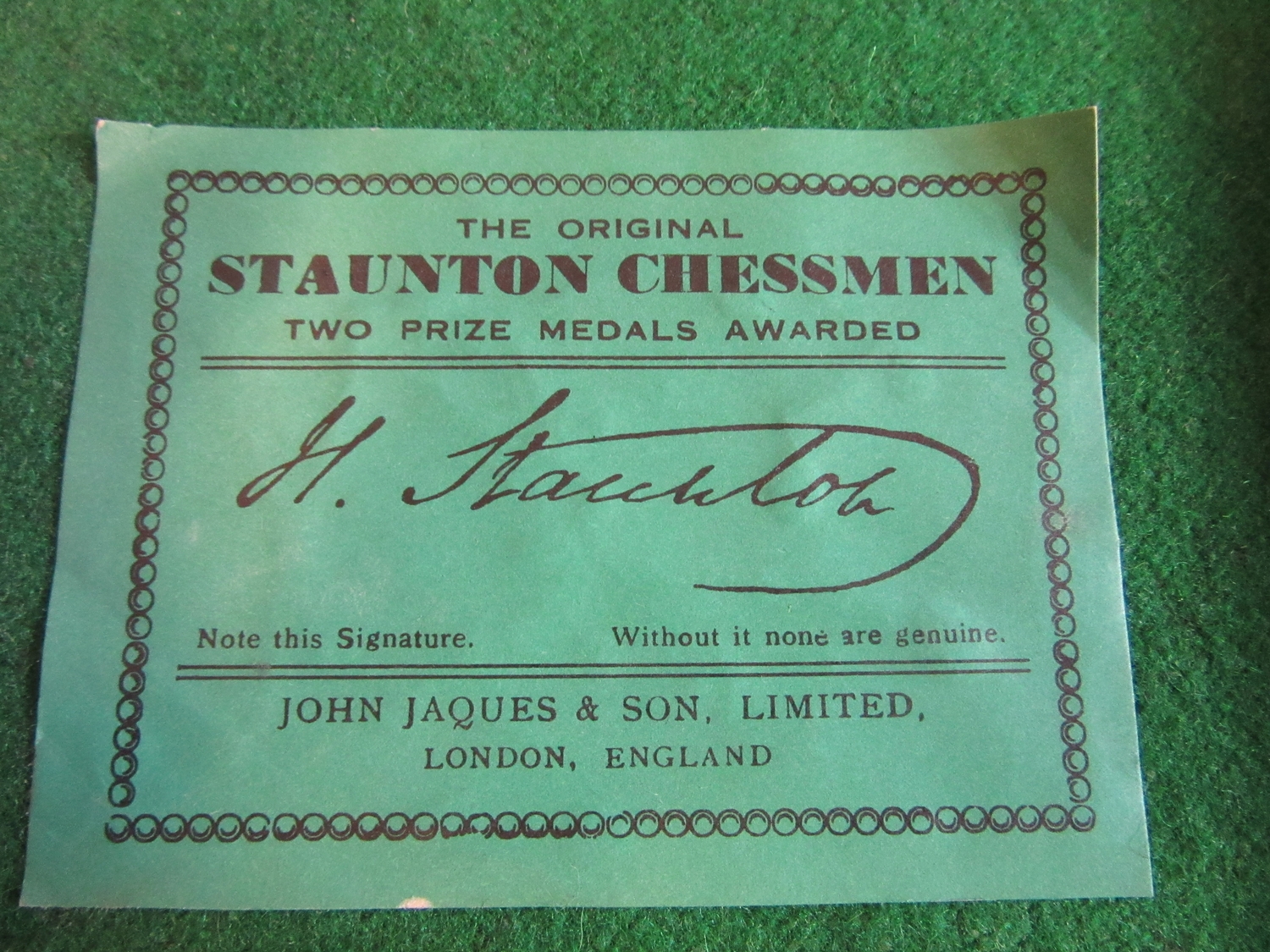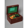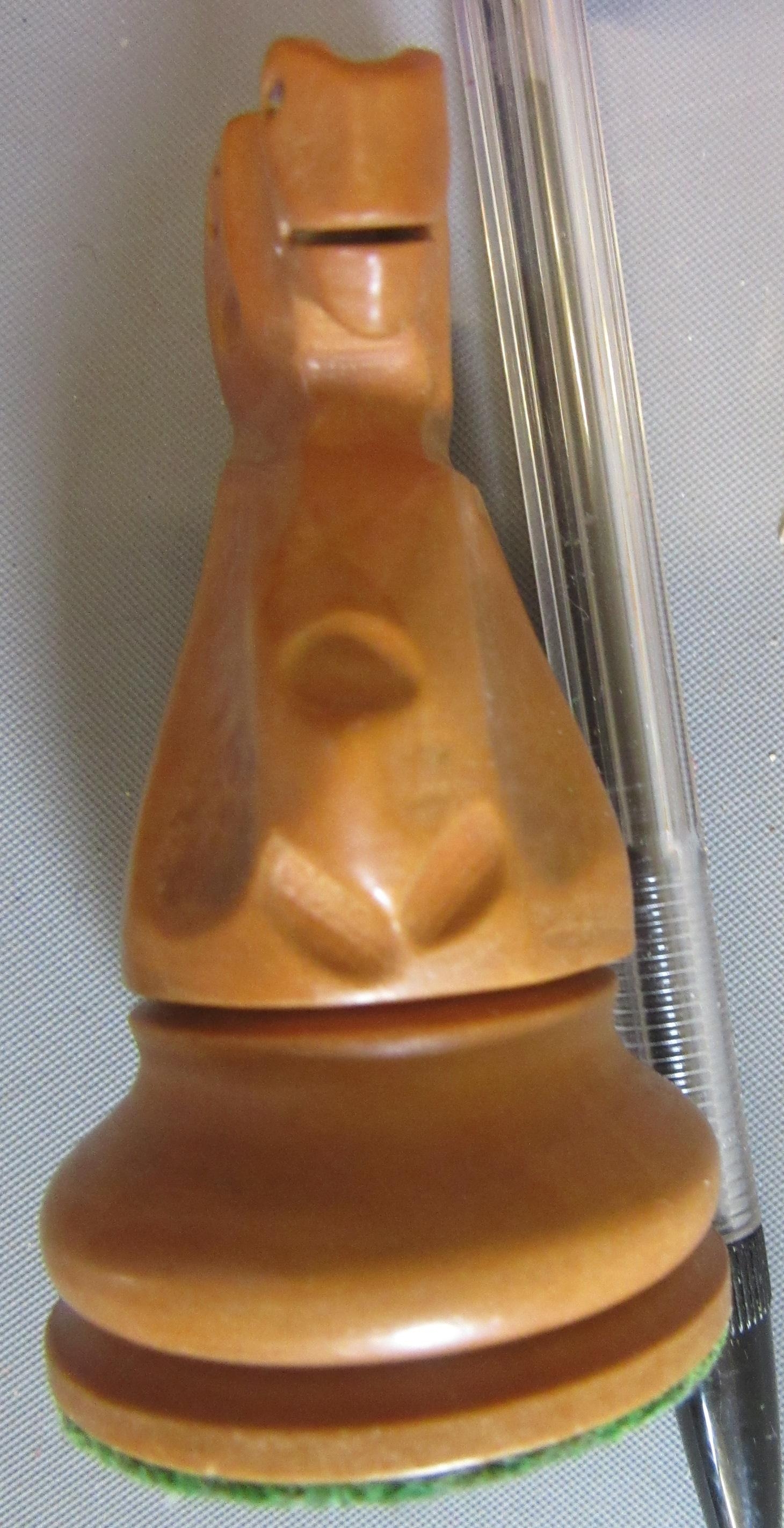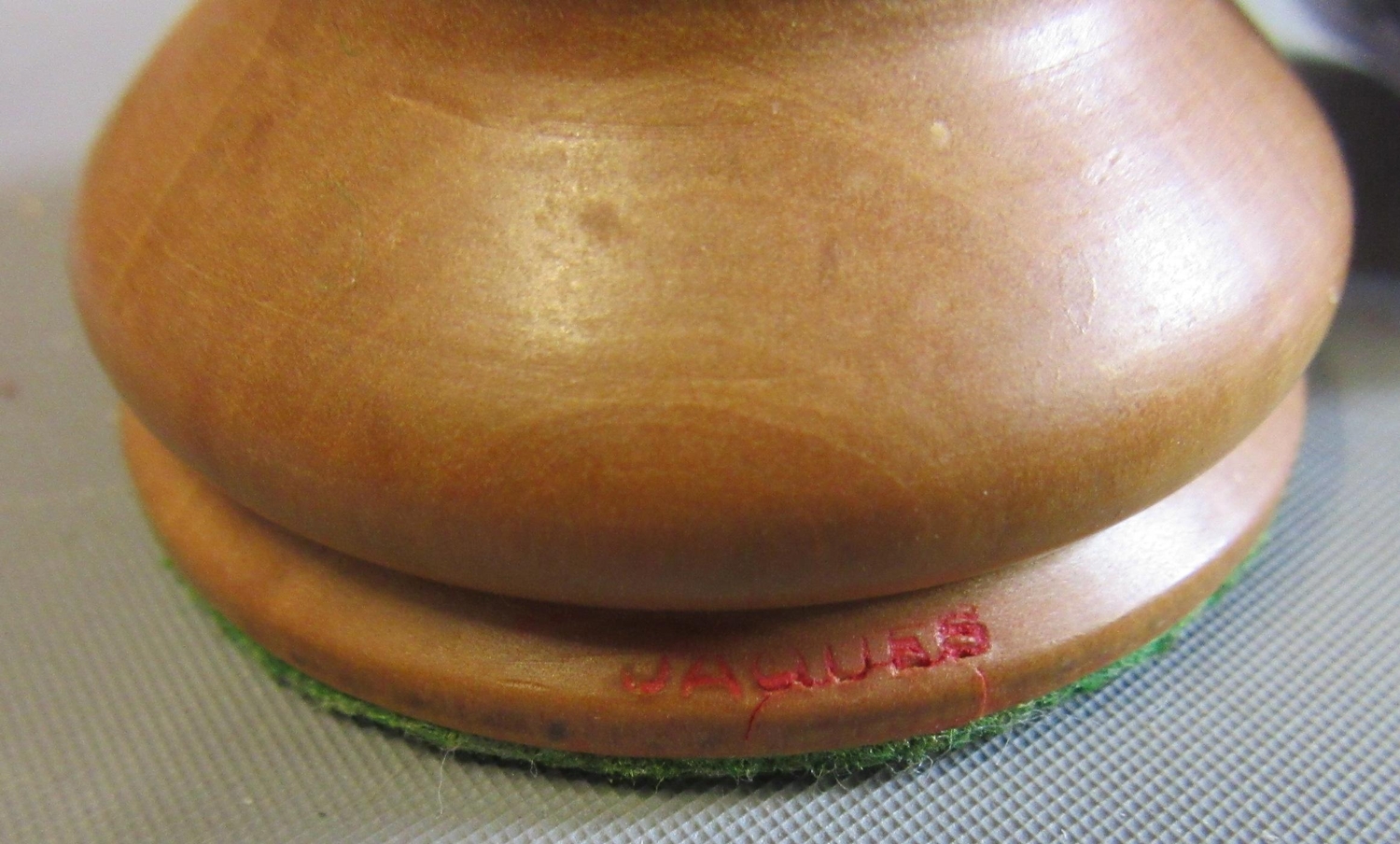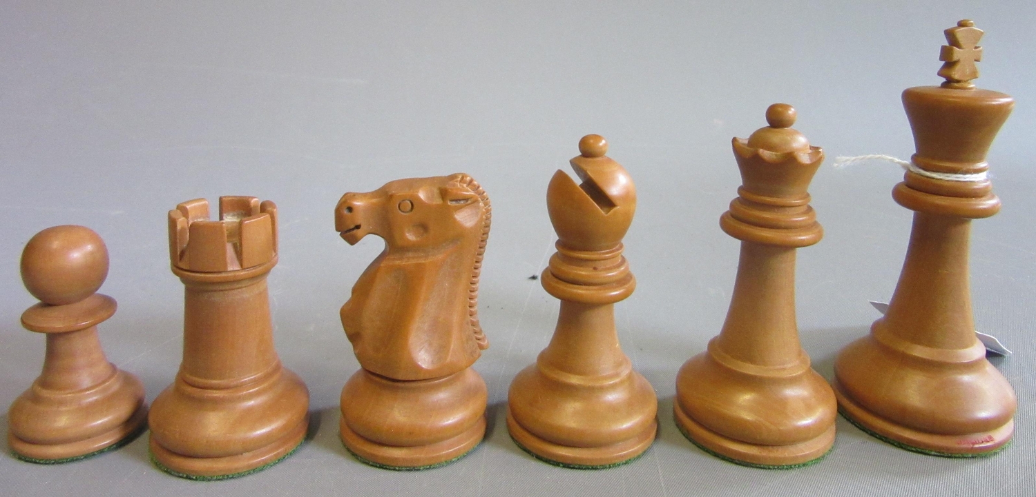 Excellent, purchased new by the vendor (a chess champion) in 1981. White King only stamped JAQUES in red. Black king has a split to base. Kings are more precisely 3 7/8" high