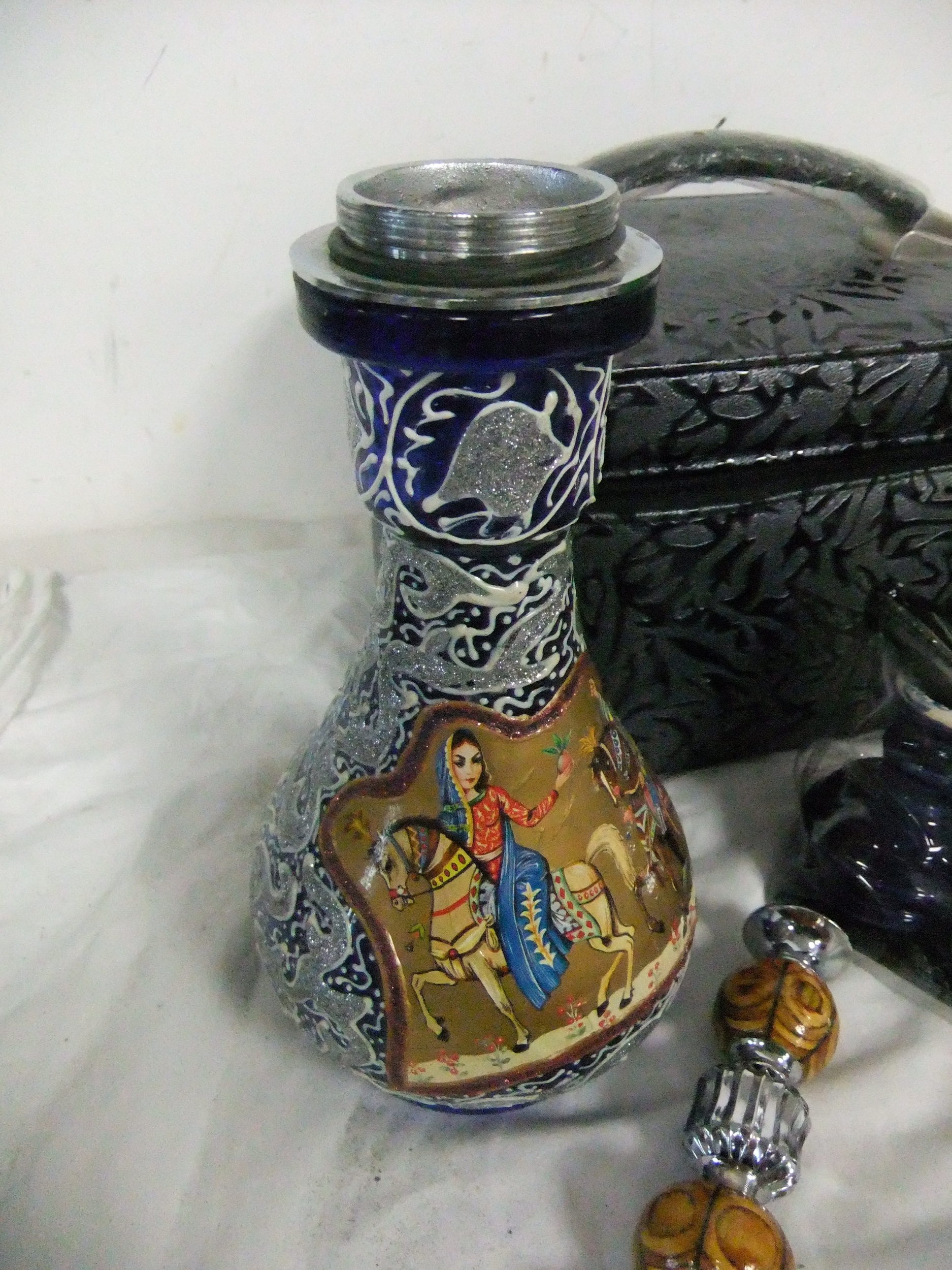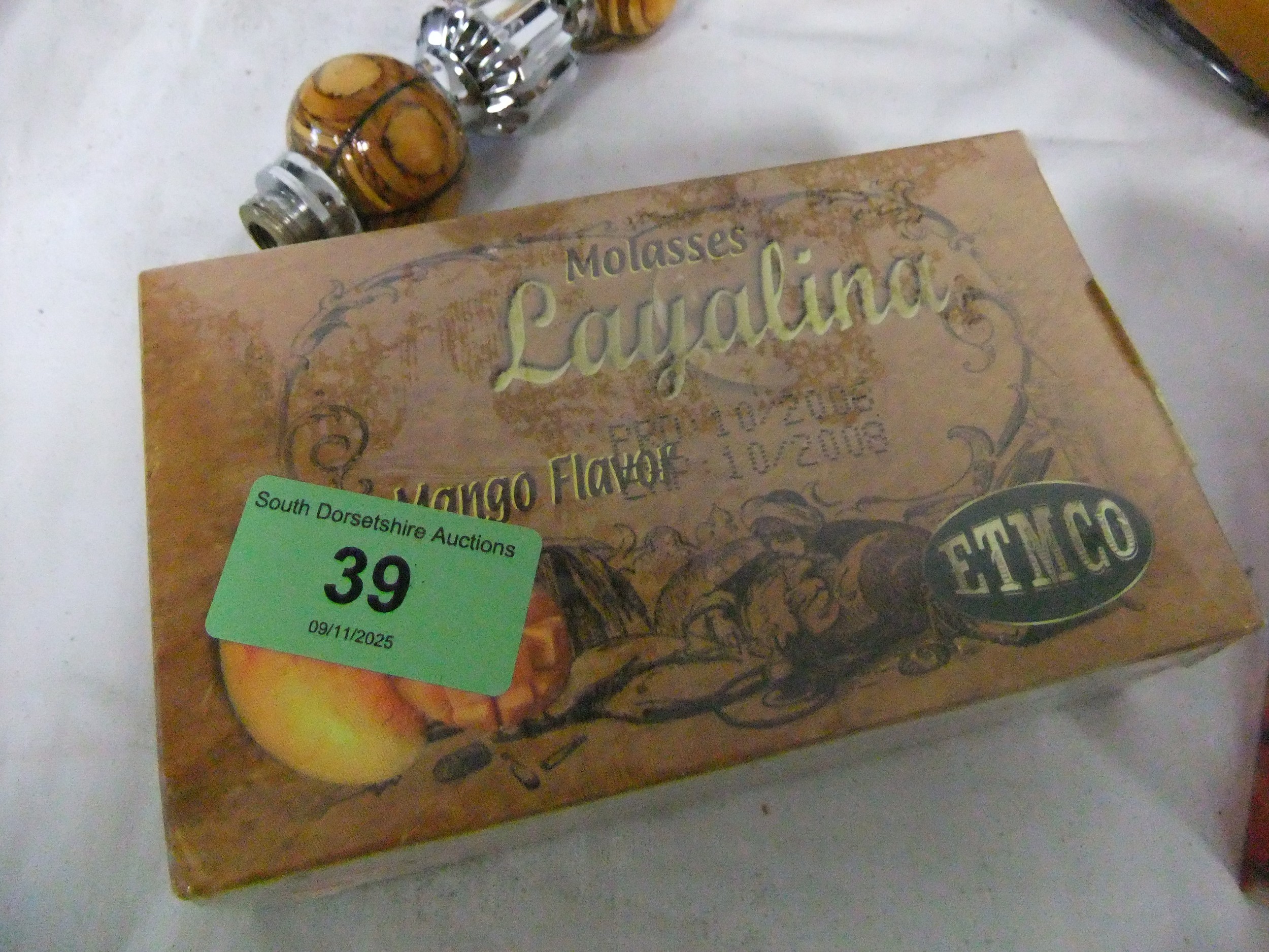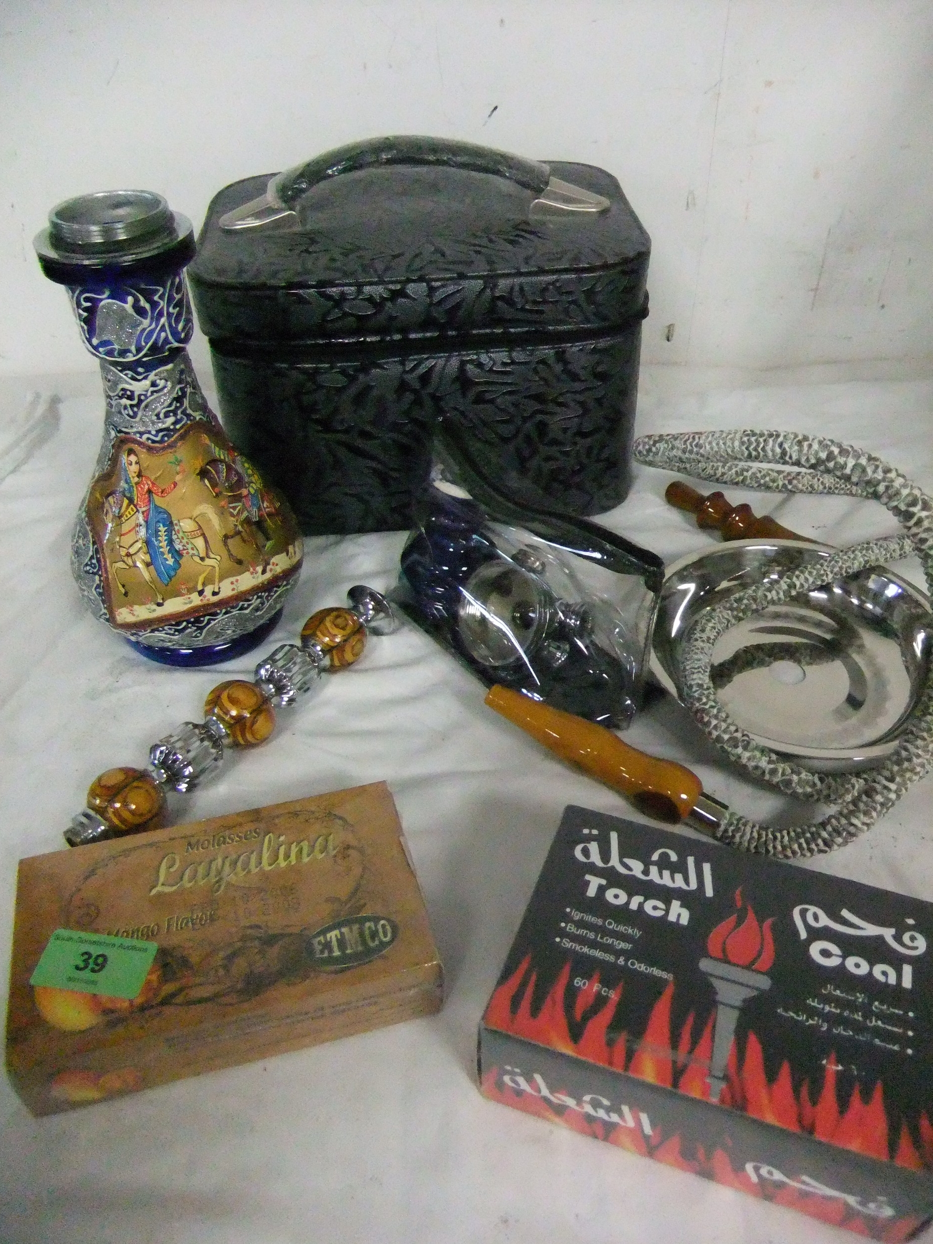 A Shisha pipe in carry case, appears unused and in very good order, plus a sealed box of torch coal for the same and a sealed box of Layalina mango flavour tobacco