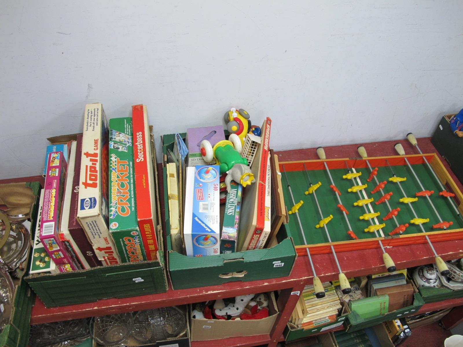 Vintage Toys and Games, to include a fold up table football set, World Cup Cricket, Yahtzee, and various jigsaw puzzles: Two Boxes, plus one.