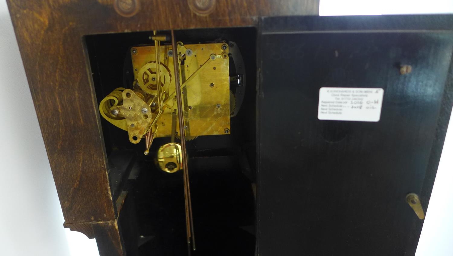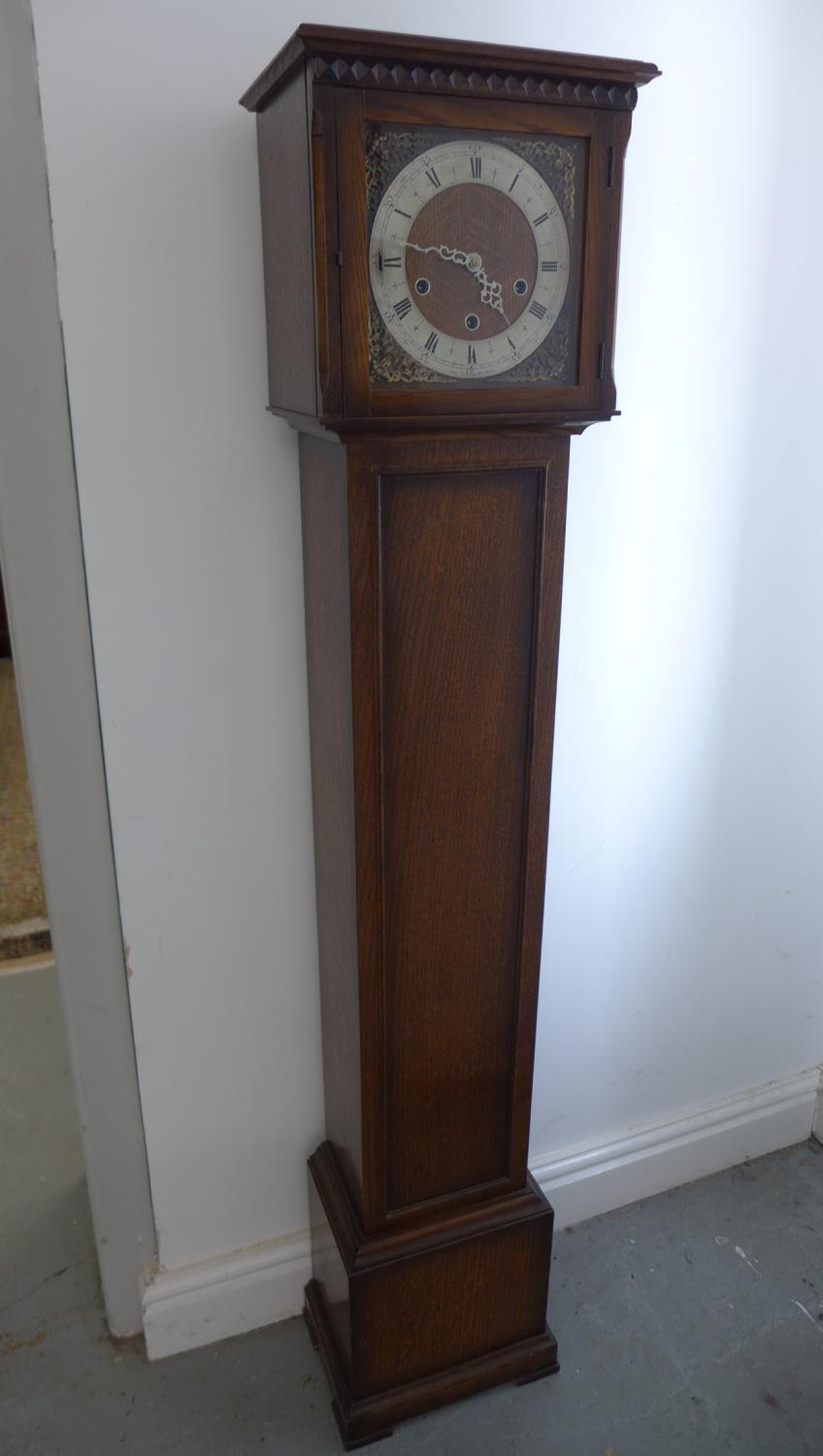 An Oak grandaughter clock with a smiths movement striking on 4-rods. Last oiled in 2018.