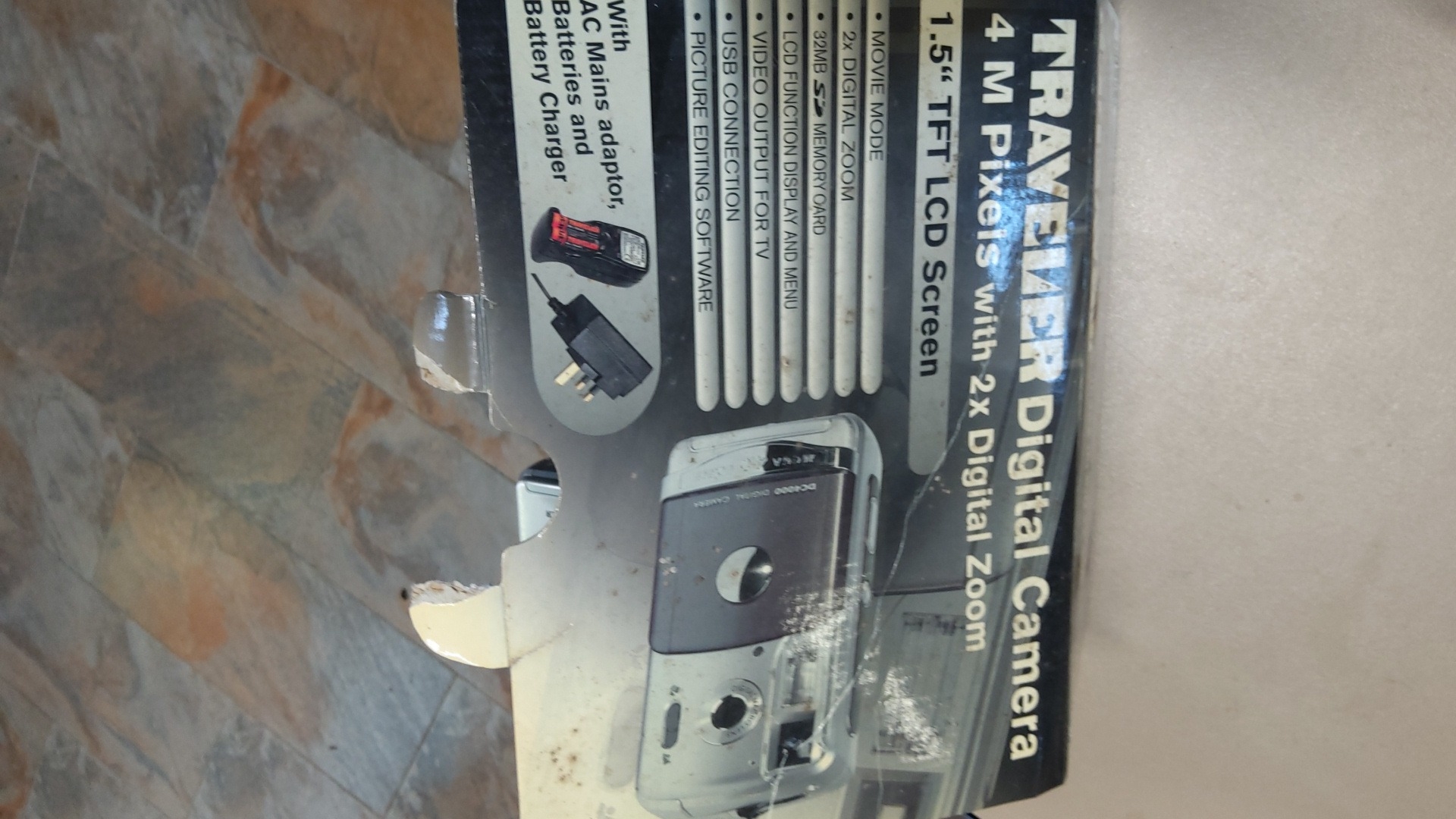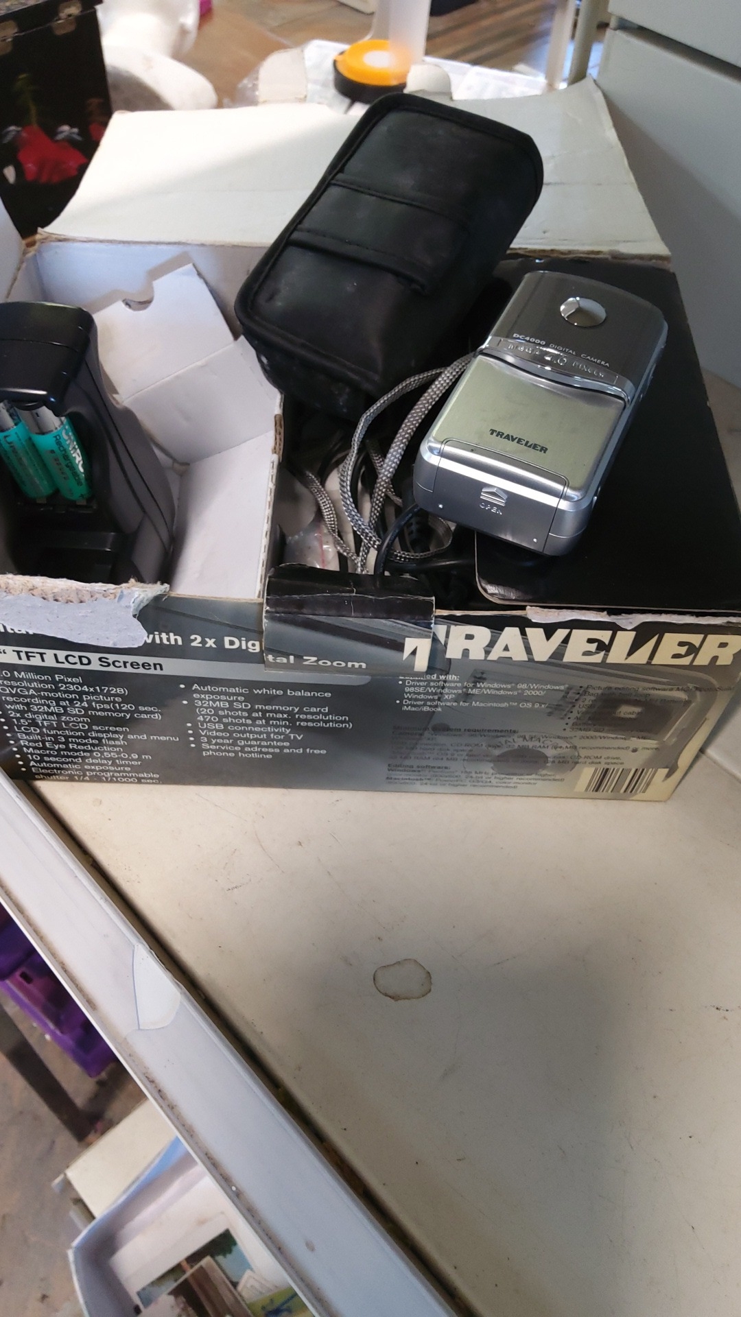 Group of Traveler DC-4000 digital camera & accessories, including original retail box, compact zip case and battery charger with rechargeable AA cells; camera present.