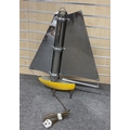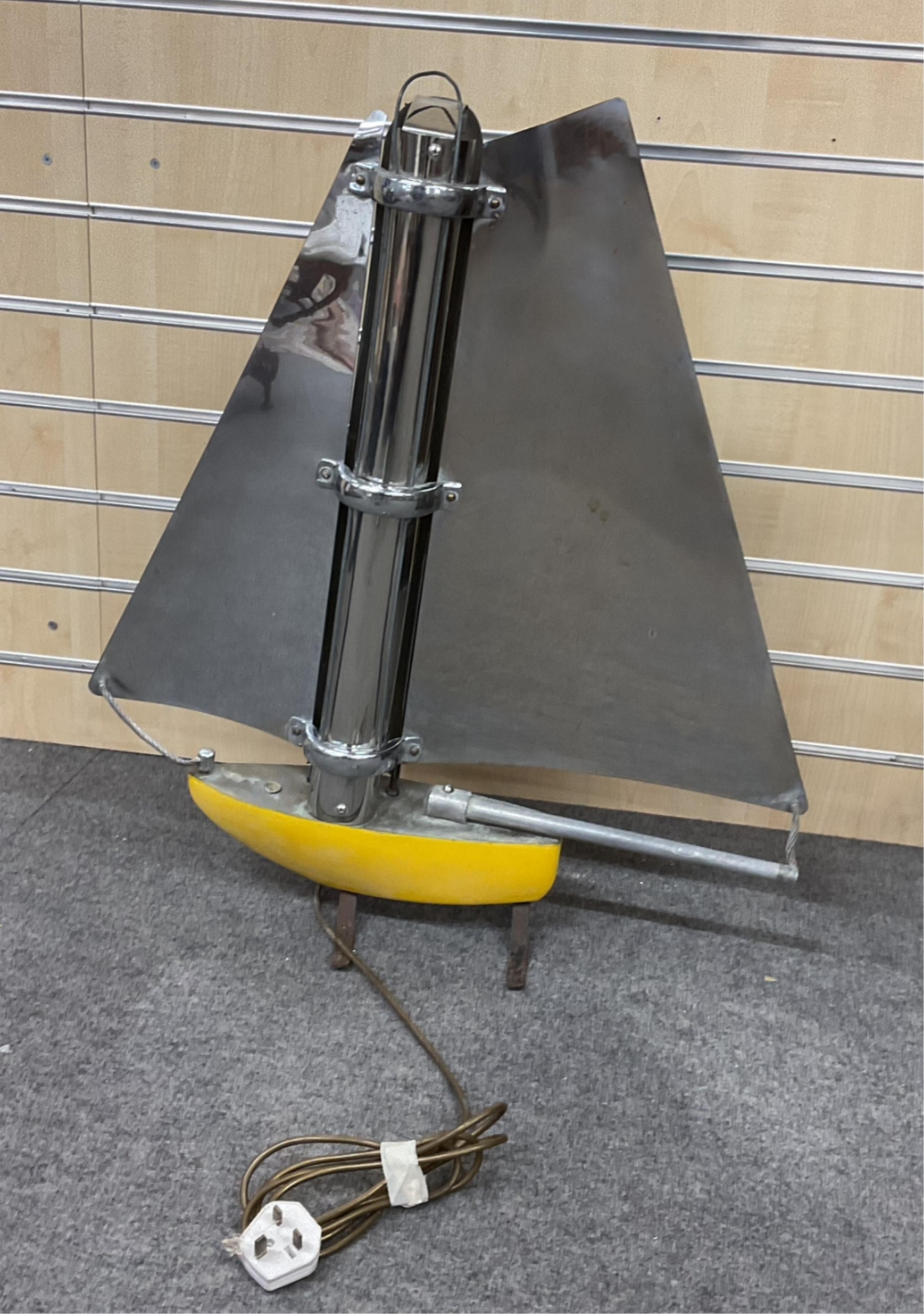 Bunting yacht fire - A Bunting 'Yacht' sailing yacht shaped heater, with sheet metal sails, manufactured by Bunting, McConnell & Co Ltd, the hull in yellow, standing 76cm. high, at widest 70cm.