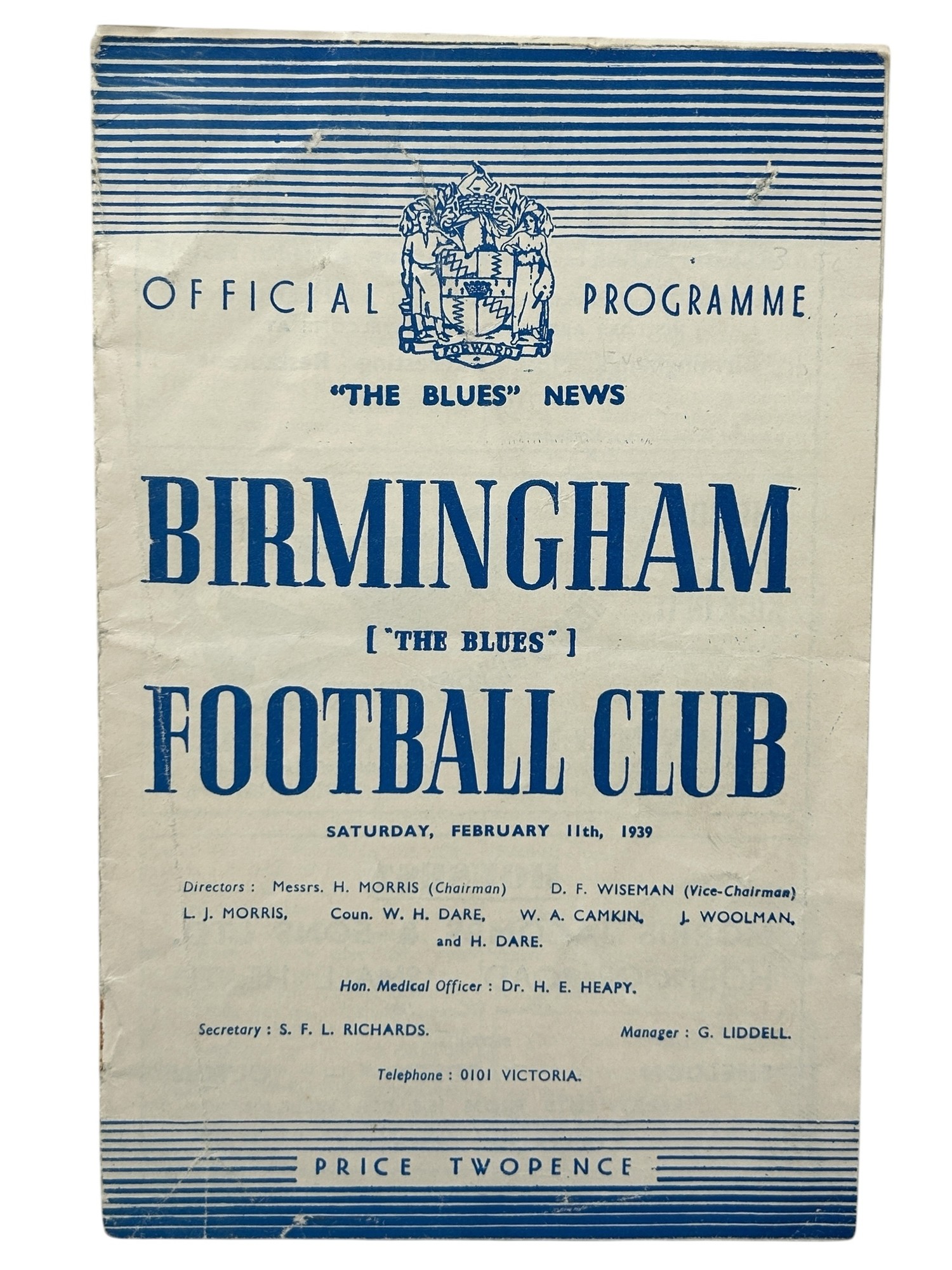 BIRMINGHAM CITY VERSUS EVERTON 1938/39 FOOTBALL PROGRAMME, 11/2/1939. STAPLES REMOVED.