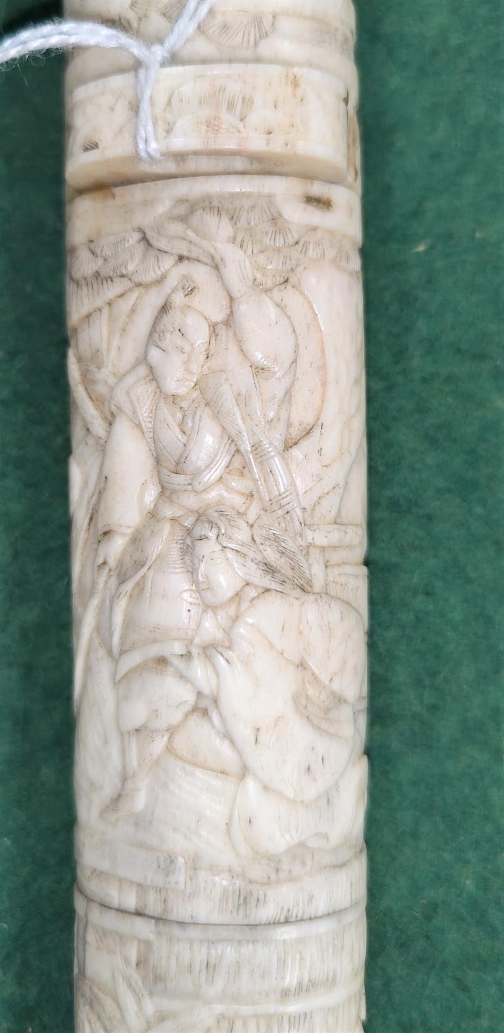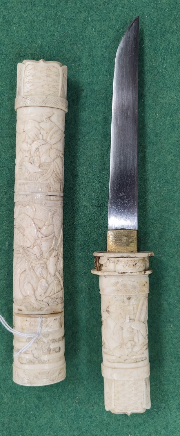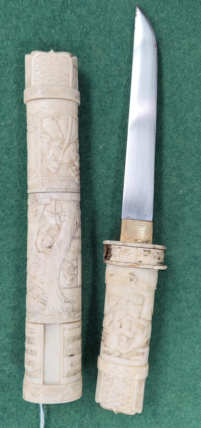 A Japanese dagger in carved sectional case with figured decoration
