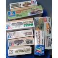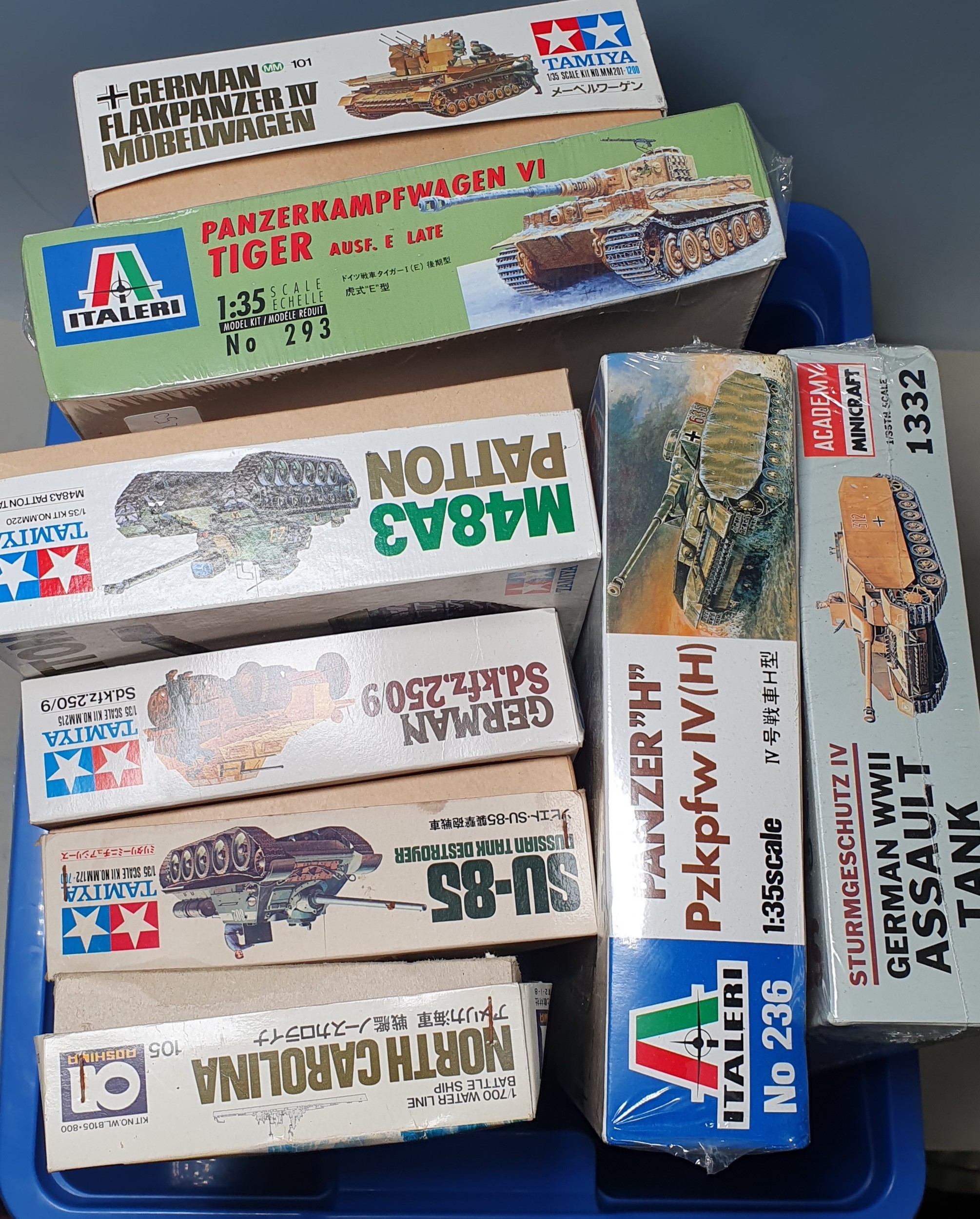 Seven boxed 1:35 scale Tank and Armoured Vehicle plastic Kits comprising Academy Sturmgeschutz IV, Italeri Panzer 'H' IV, Tiger VI, Tamiya SU-85, Sd.kfz.250/9, M48A3 Patton and Flakpanzer IV, all appear complete with some sealed in cellophane from new, together with a boxed Roshima 1:700 scale Water Line Series U.S. Naby Battleship North Carolina, opened but appears complete