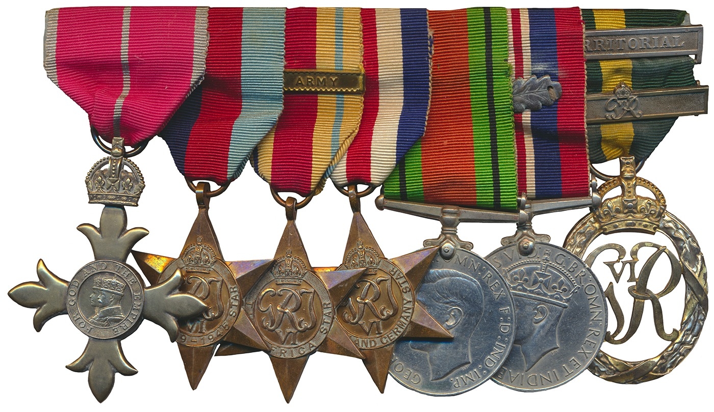 WWII group with OBE, 1939-45, Africa (with war clasp), France and Germany stars, BWM, Defence Medal with Oak leaf and GVIR Efficiency Decoration with 2 clasp Territorial and GVIR, attributed to Colonel Stephen Terrell, very fine and better, swing mounted as worn.