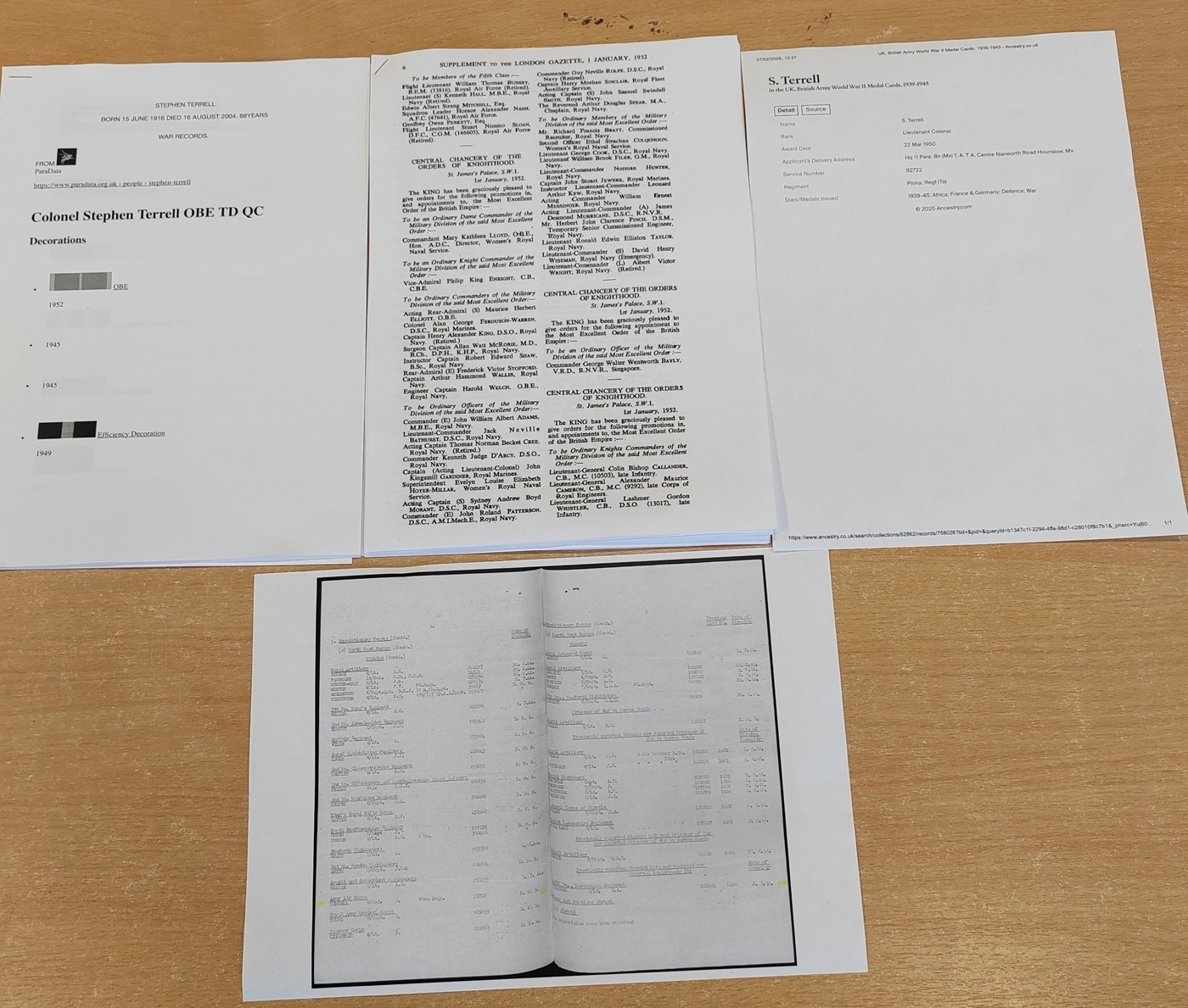 After the war he became a barrister, and also served as a senior officer for nine years in 16 Airborne Division (TA). He was later appointed Queens Counsel and also served as president of the Liberal Party, with copies of London Gazette articles and printed details of Terrells service. (R)