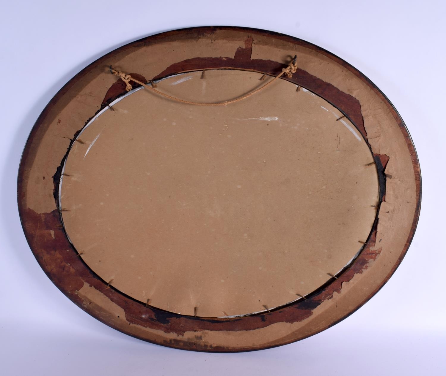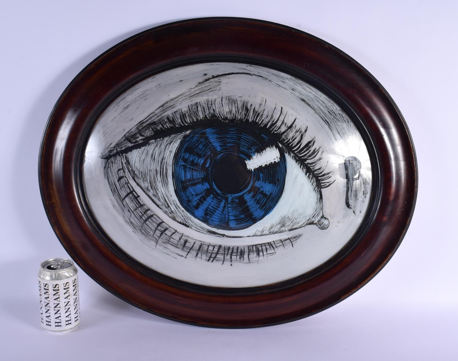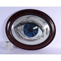A VINTAGE REVERSE PAINTED GLASS PANEL OF AN EYE. 62 cm x 52 cm.