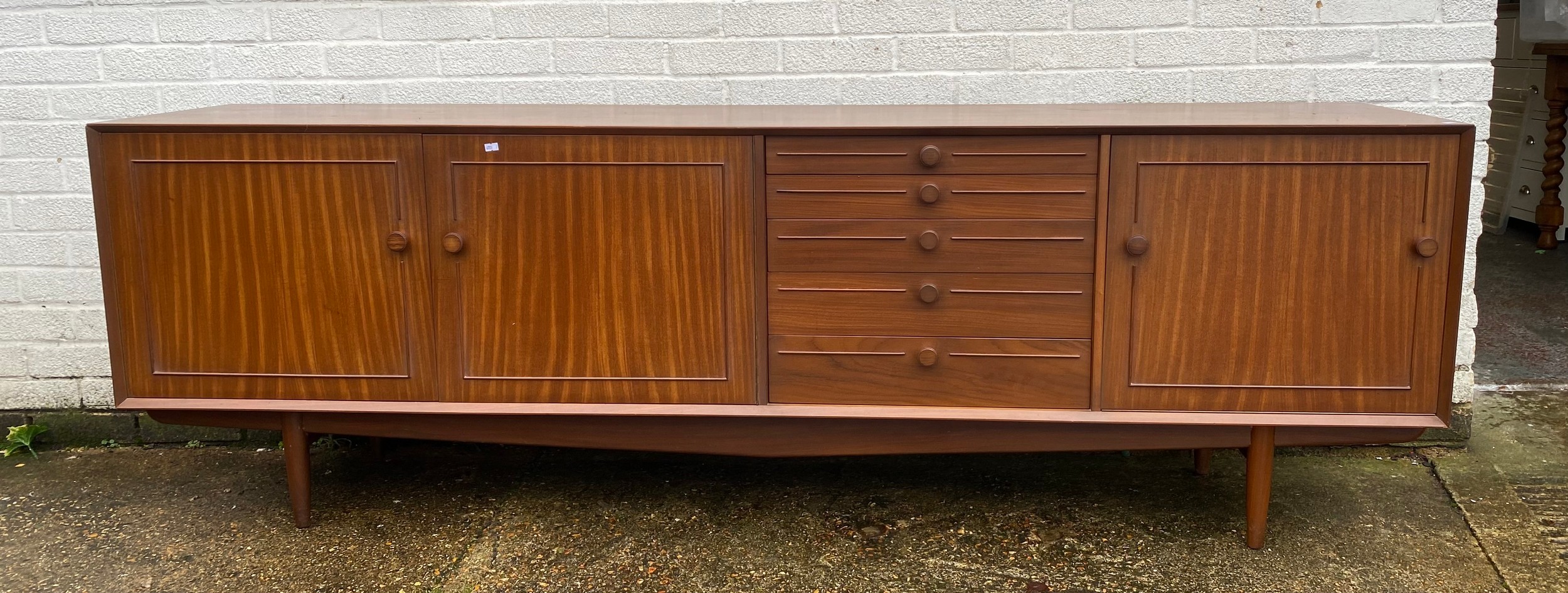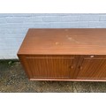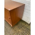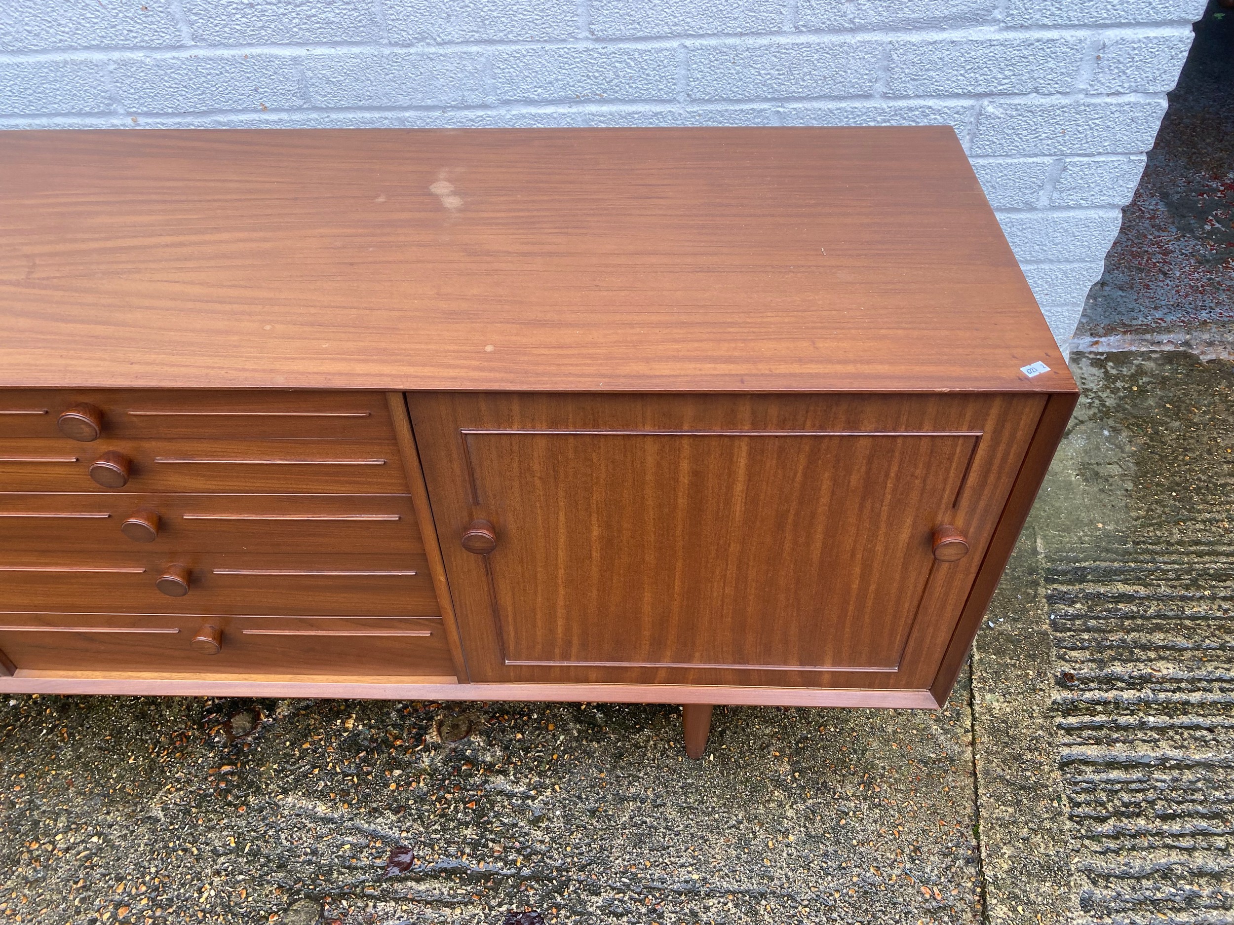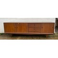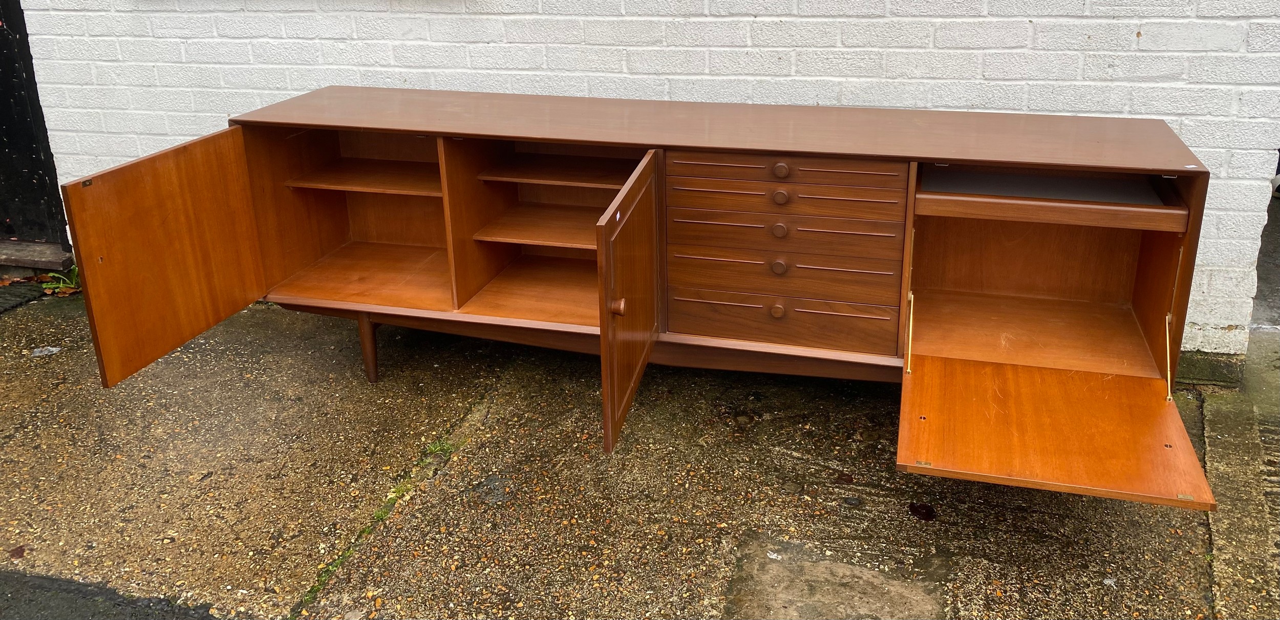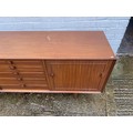 A vintage teak sideboard, fitted with a pair of cupboard doors, five graduated drawers and a pull down door, on short legs -