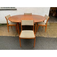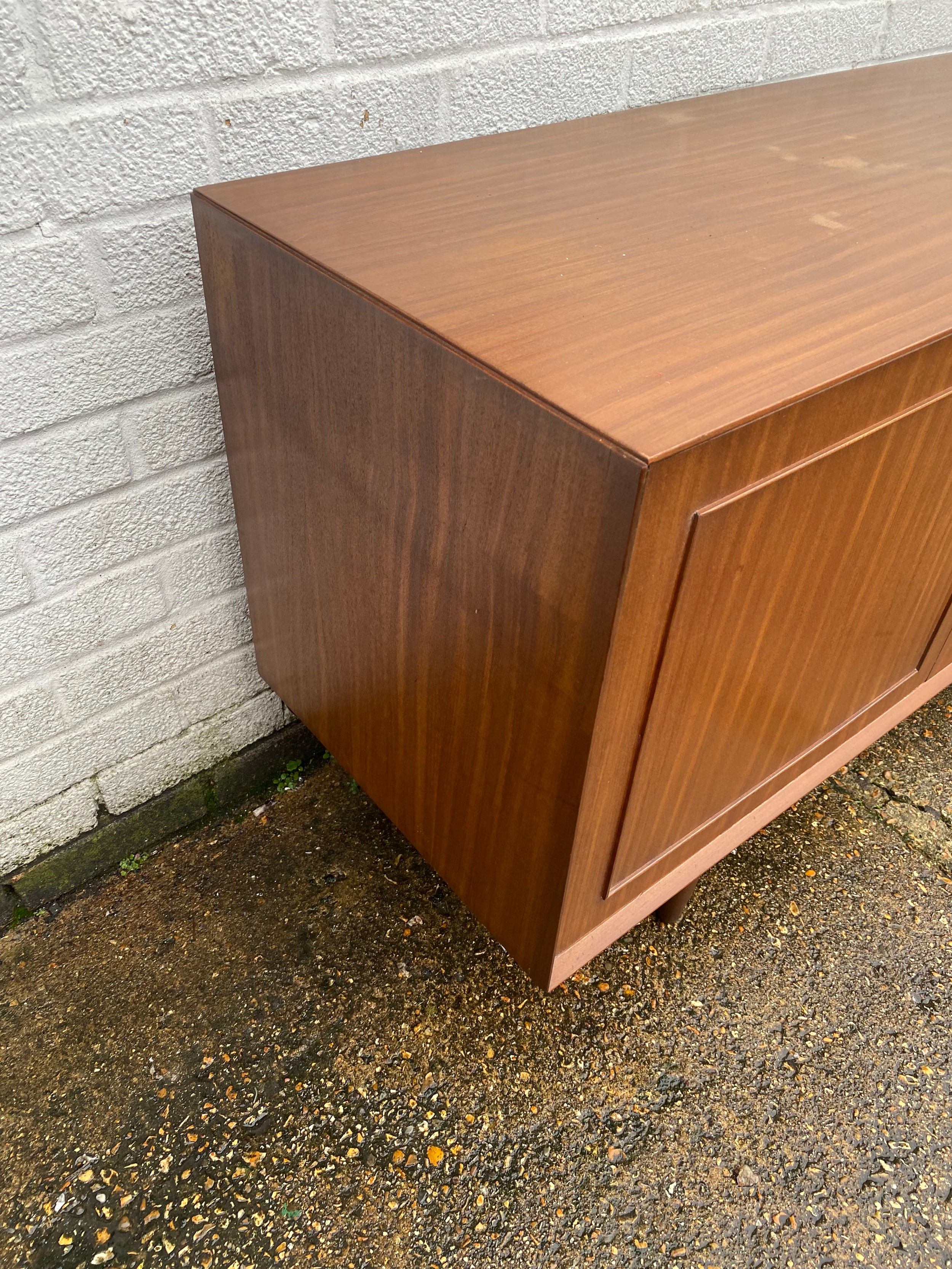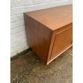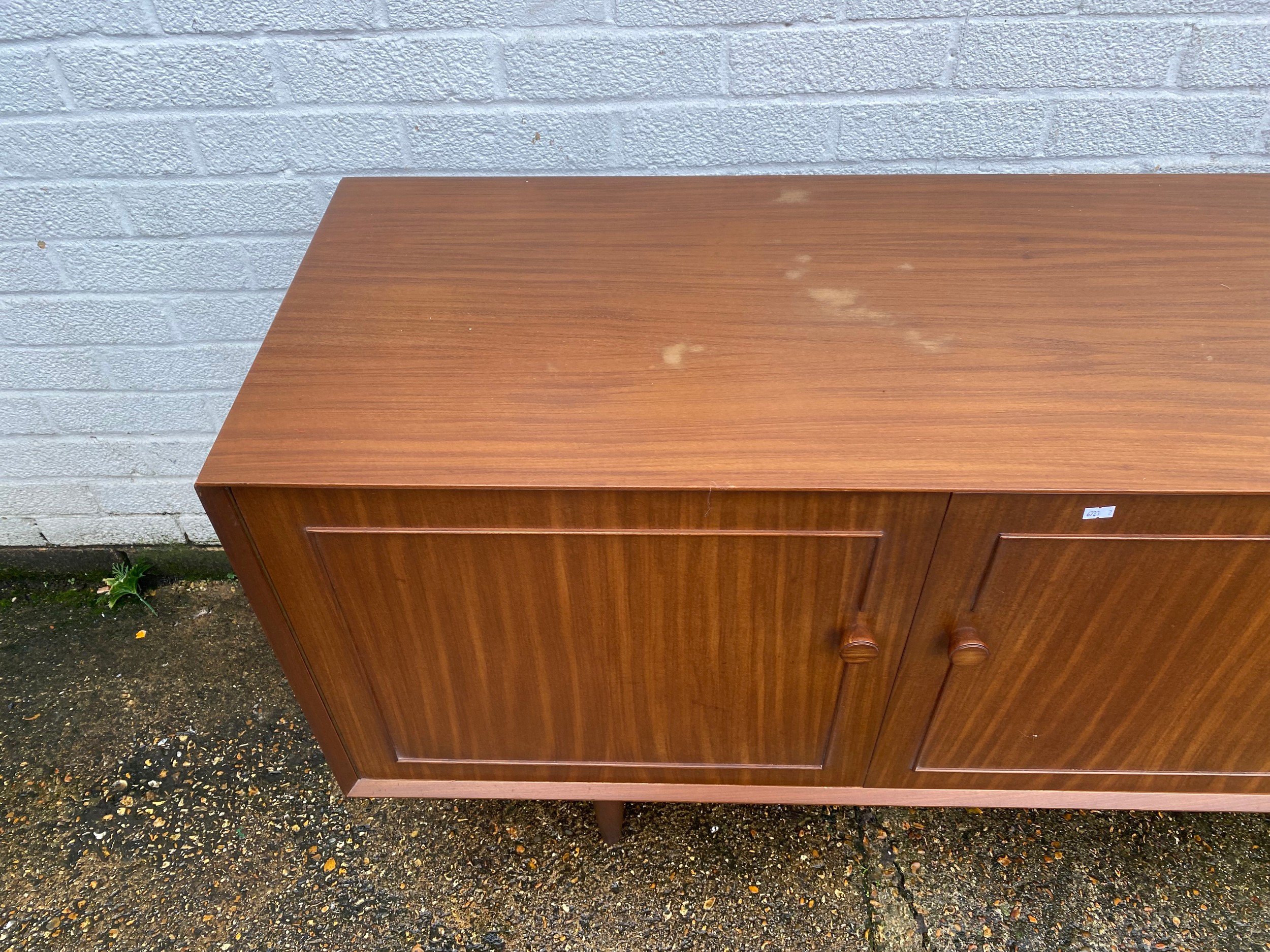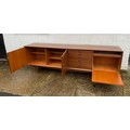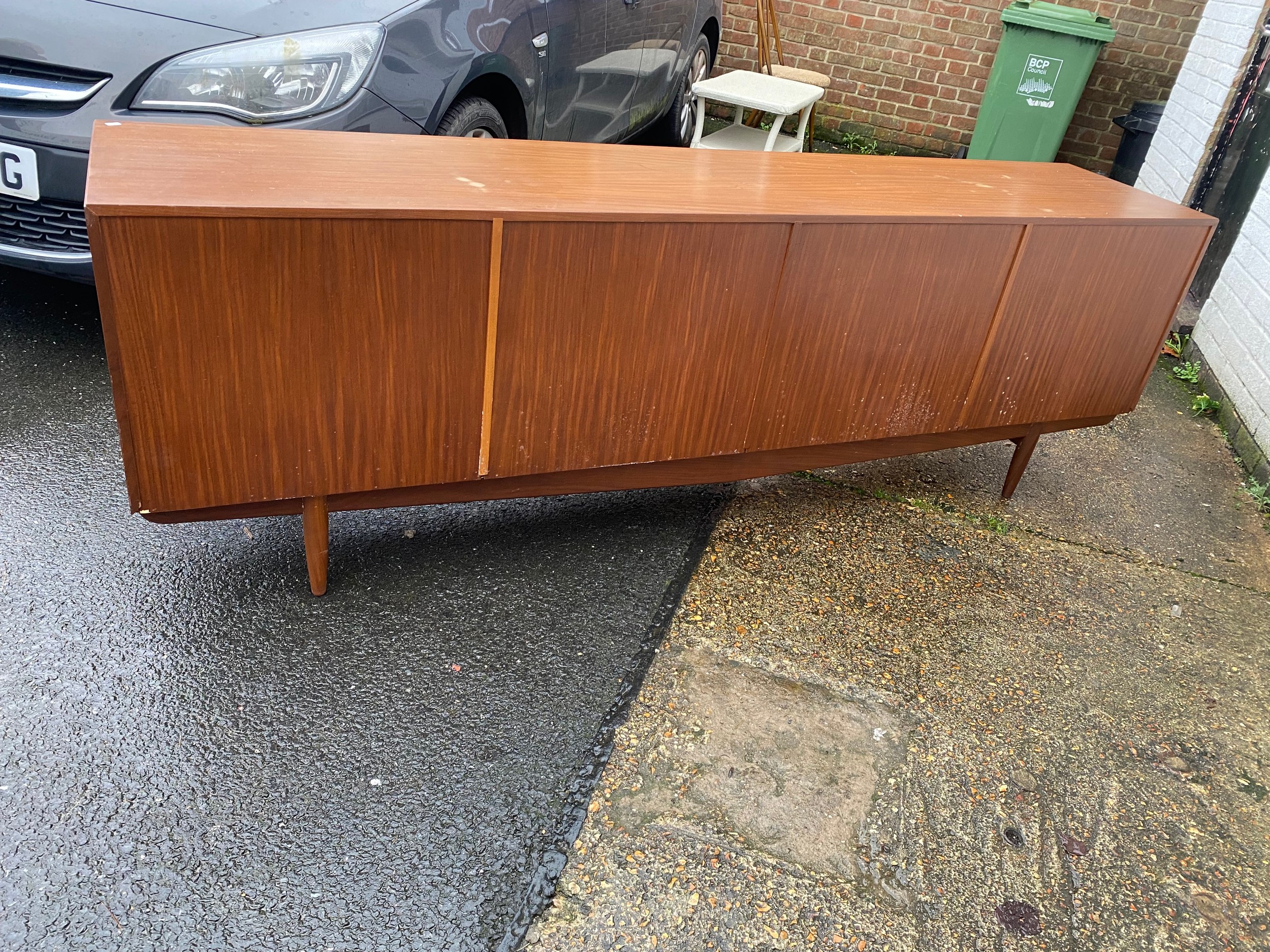 A vintage teak sideboard, fitted with a pair of cupboard doors, five graduated drawers and a pull down door, on short legs -