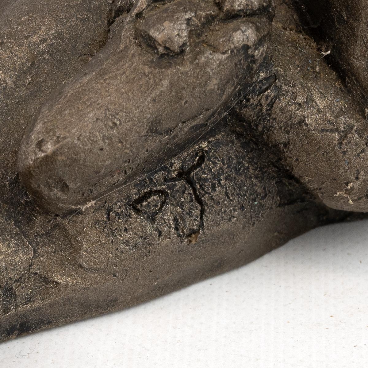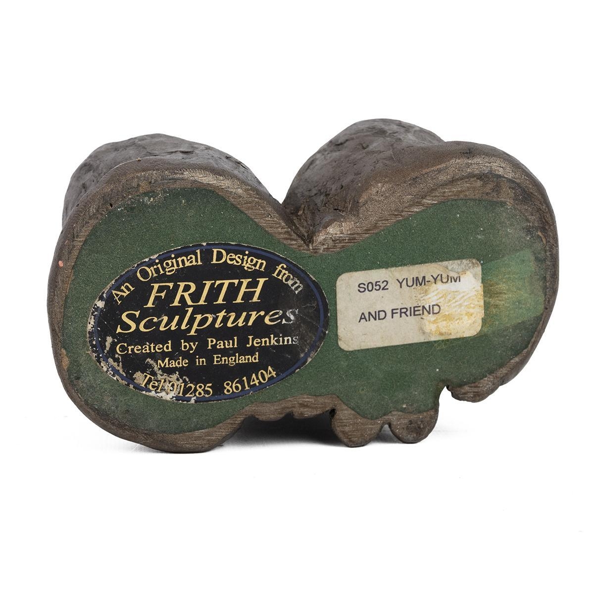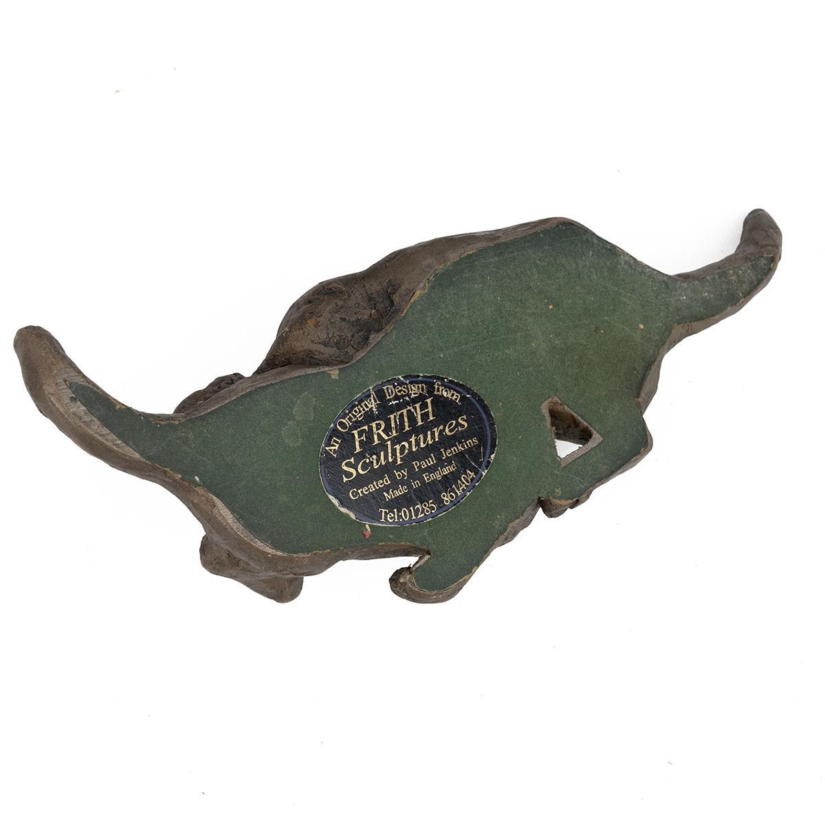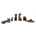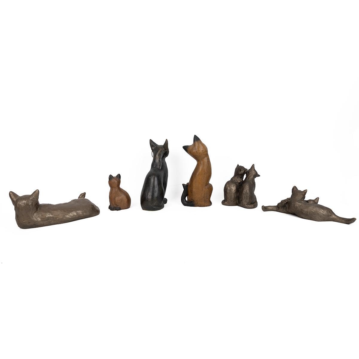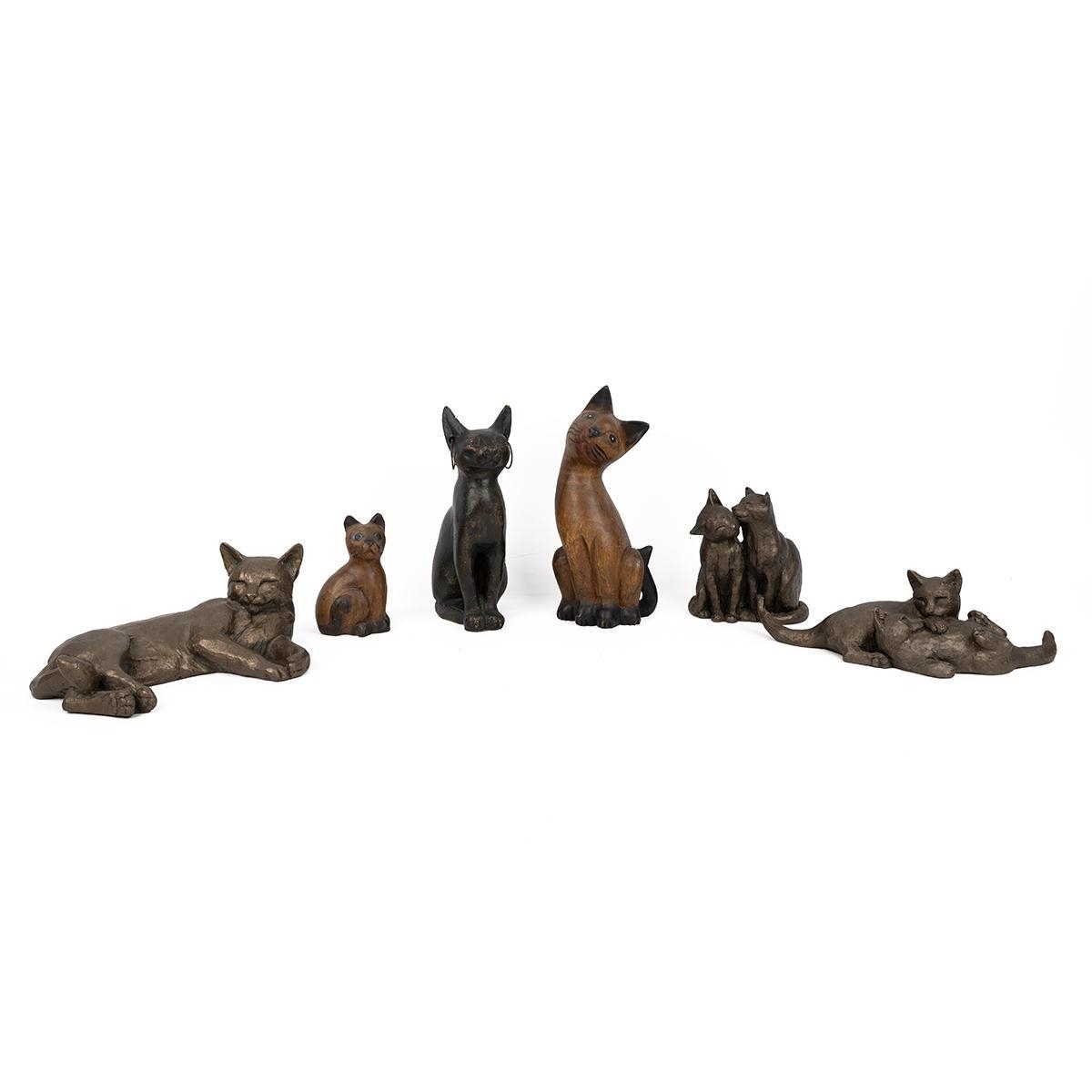 Paul Jenkins for Frith Sculptures - three resin cast cat figurines, together with two carved wood cats and a plaster cat figurine with hoop earrings. Tallest 25cm. (6)