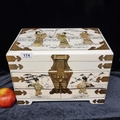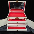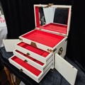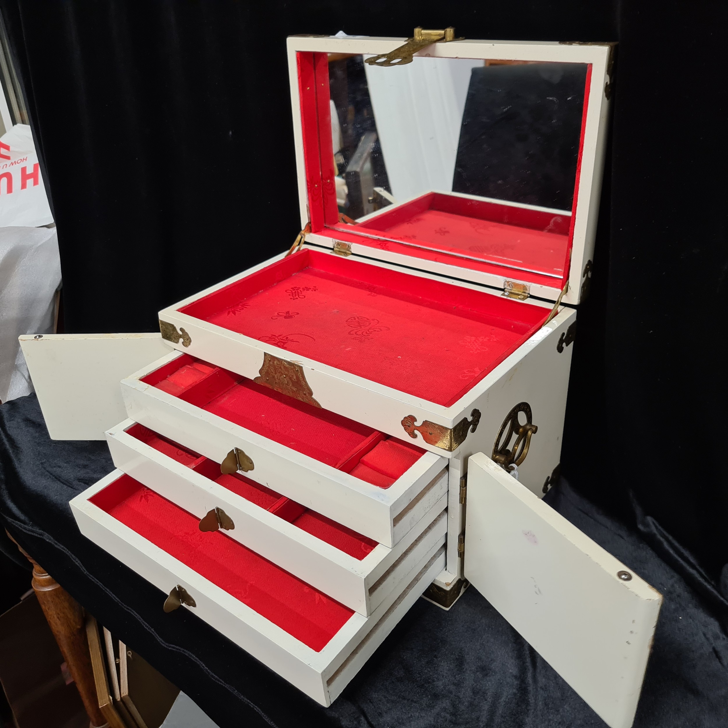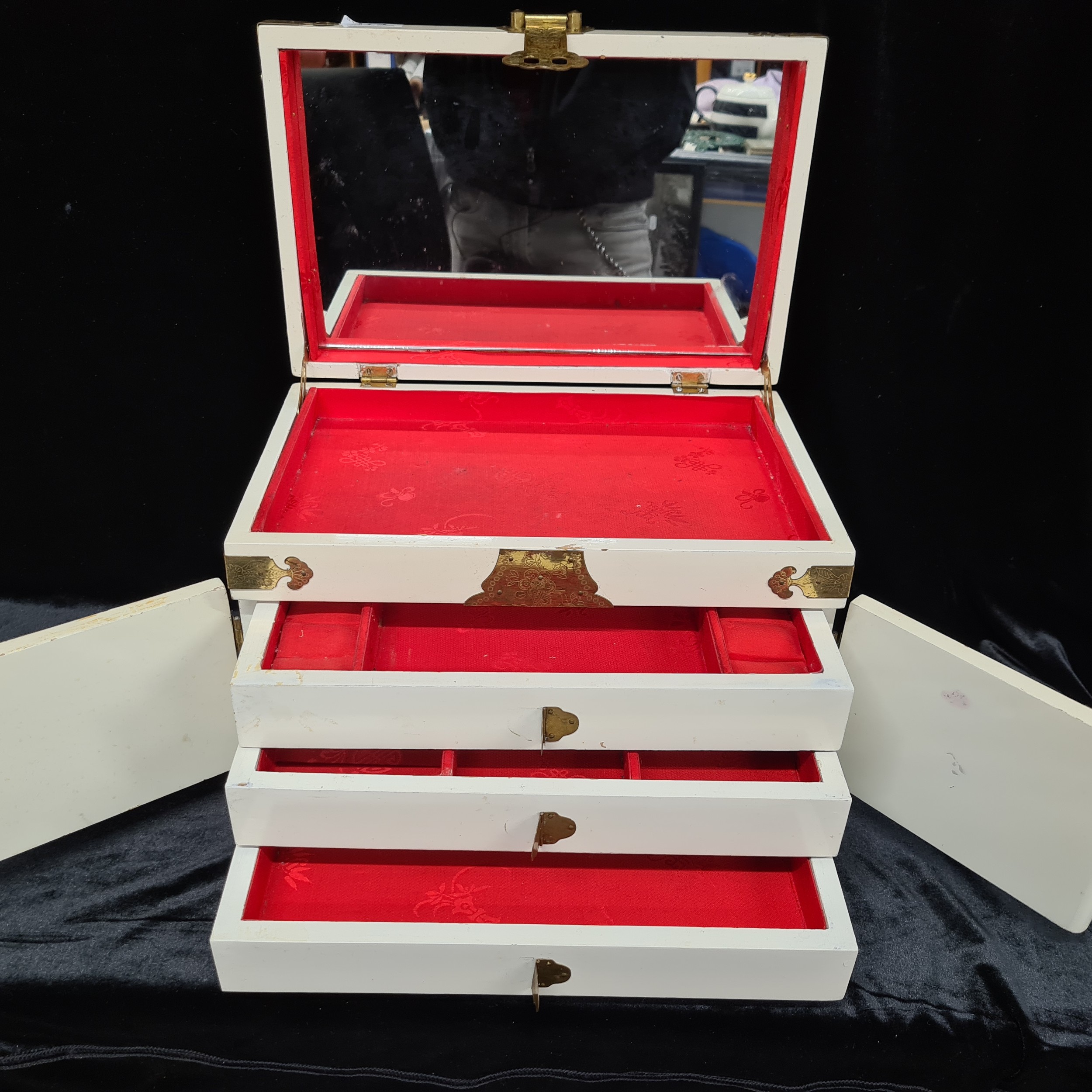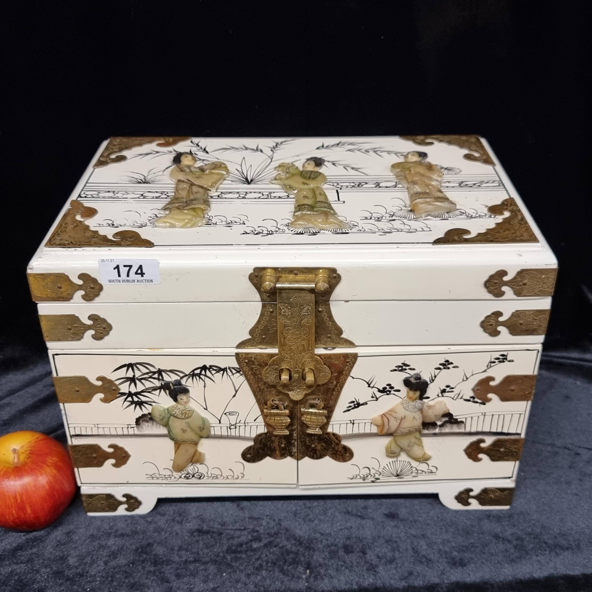A beautiful, vintage Japanese Jewellery Box. Profusely decorated with engraved brass fittings and relief shell carvings of traditional Japanese women. With hinged fold-out mirror and three internal drawers. A really stunning example.
