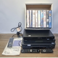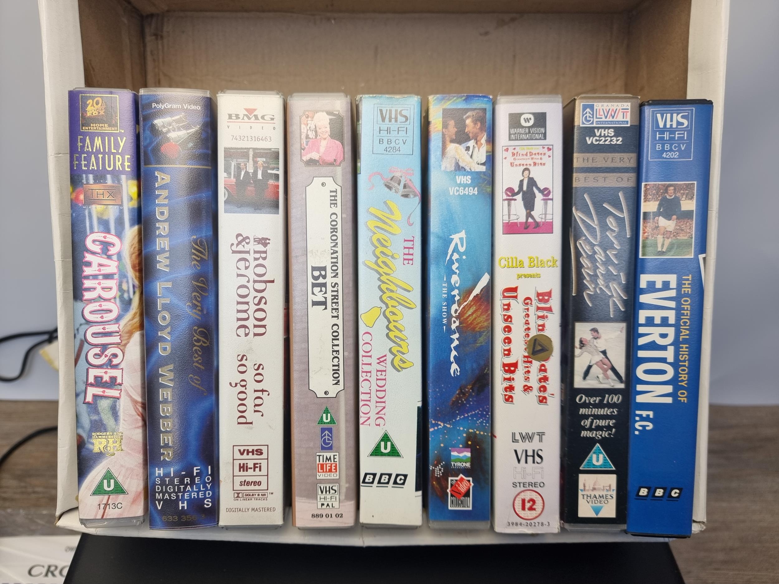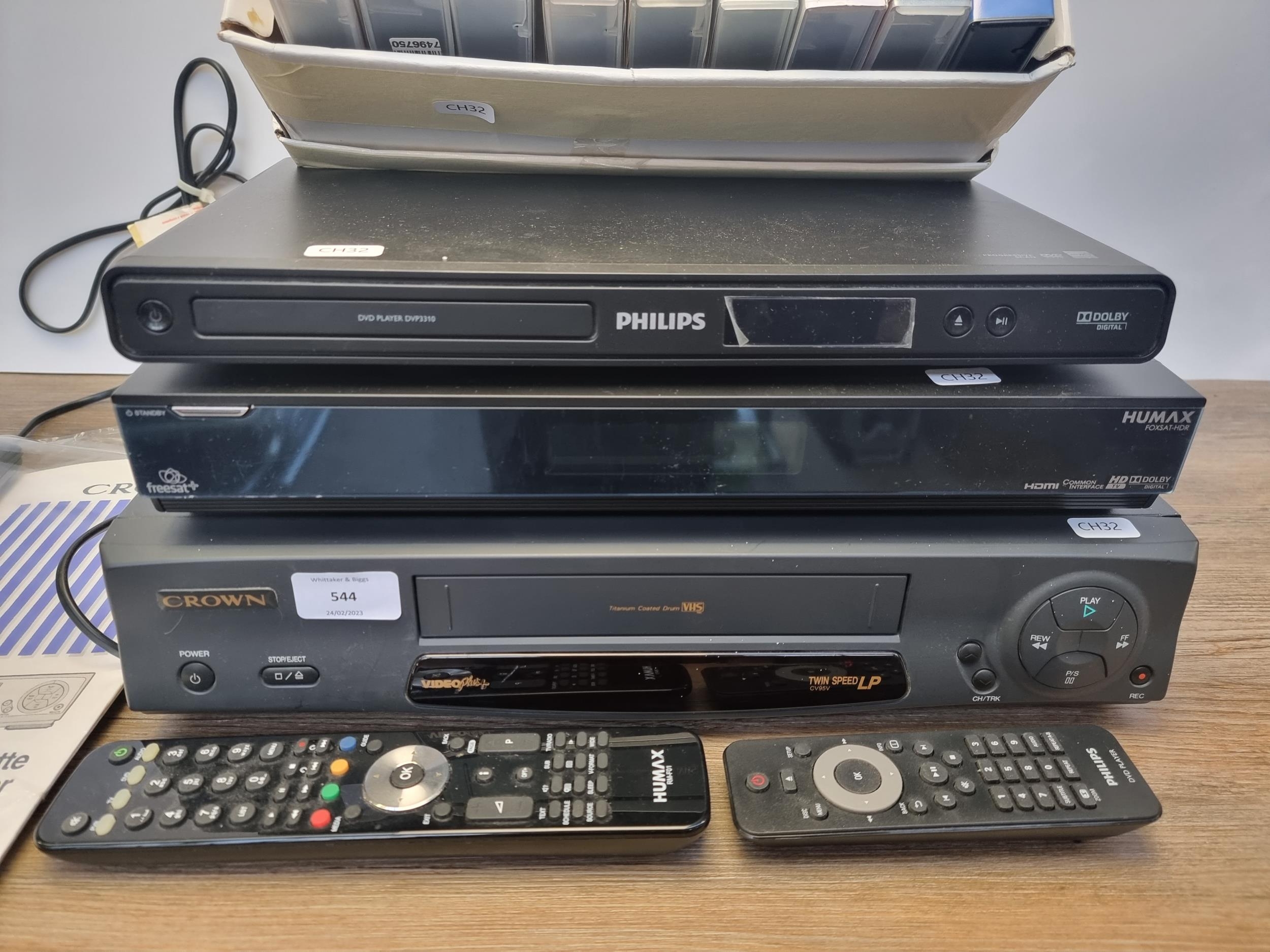 Four items, one Crown VCR, one HUMAX Freesat+ set top box, one Phillips DVD player and one box containing VHS video tapes