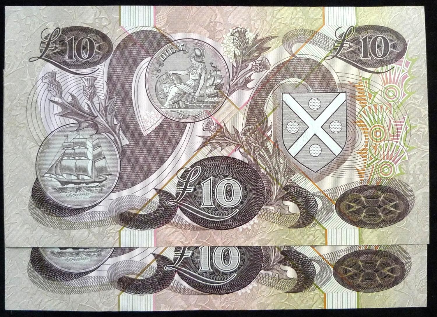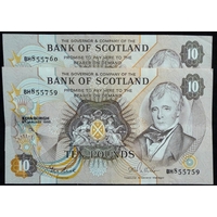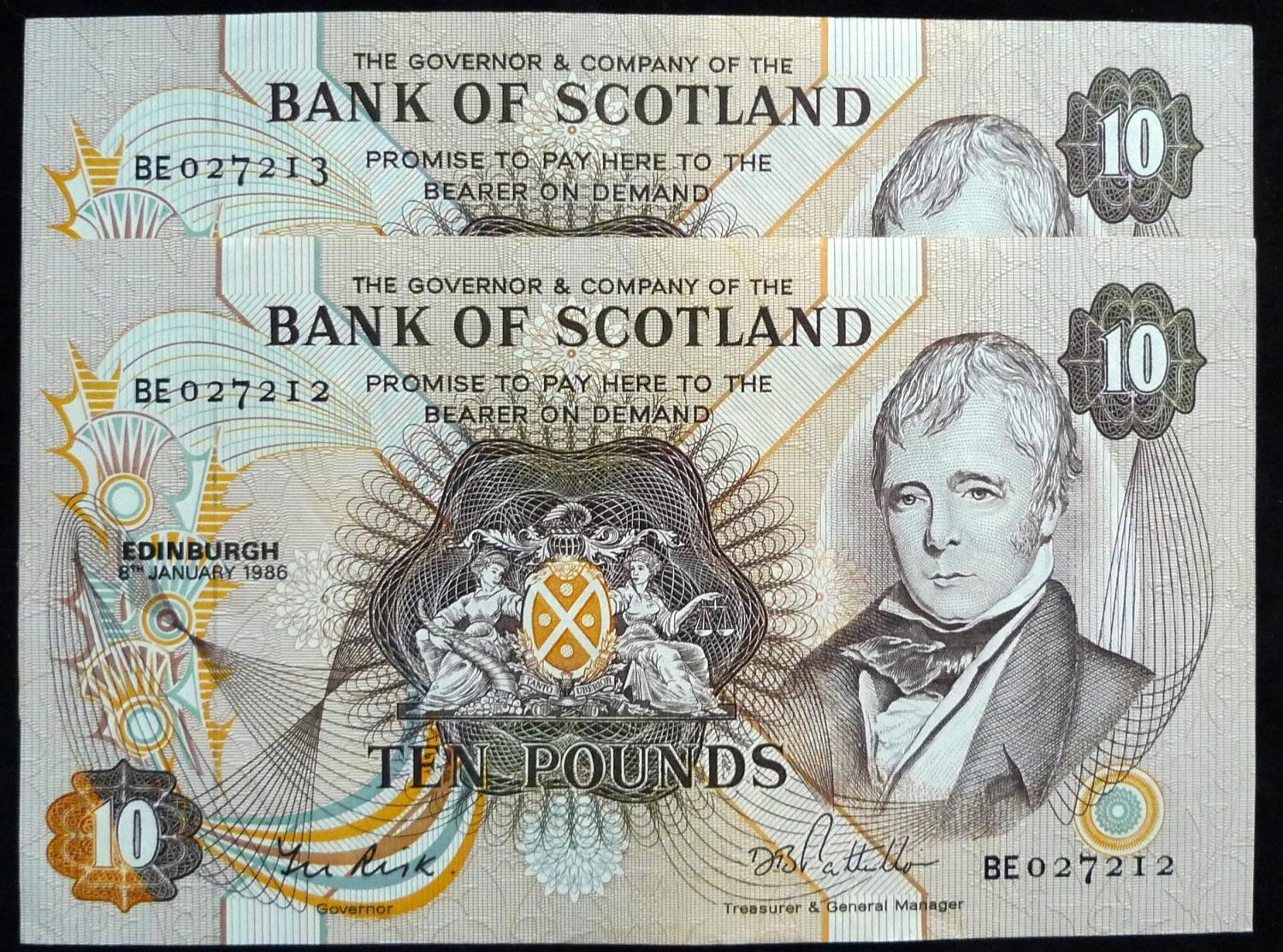 Bank of Scotland. £10. (2) SC134c 08.01.86. BE027212 - 213 consecutive. GEF.
