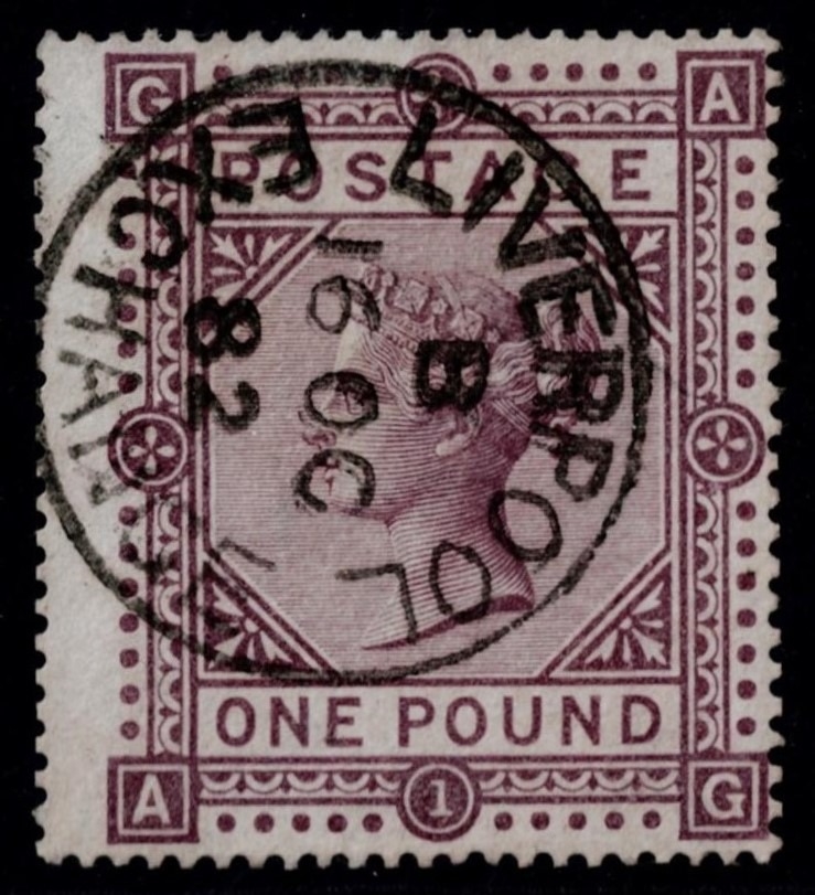 GB 1878 £1 brown-lilac AG stunning deep shade superb used Liverpool CDS 16.10.82 sg129 rare so fine Cat.£3500+