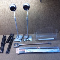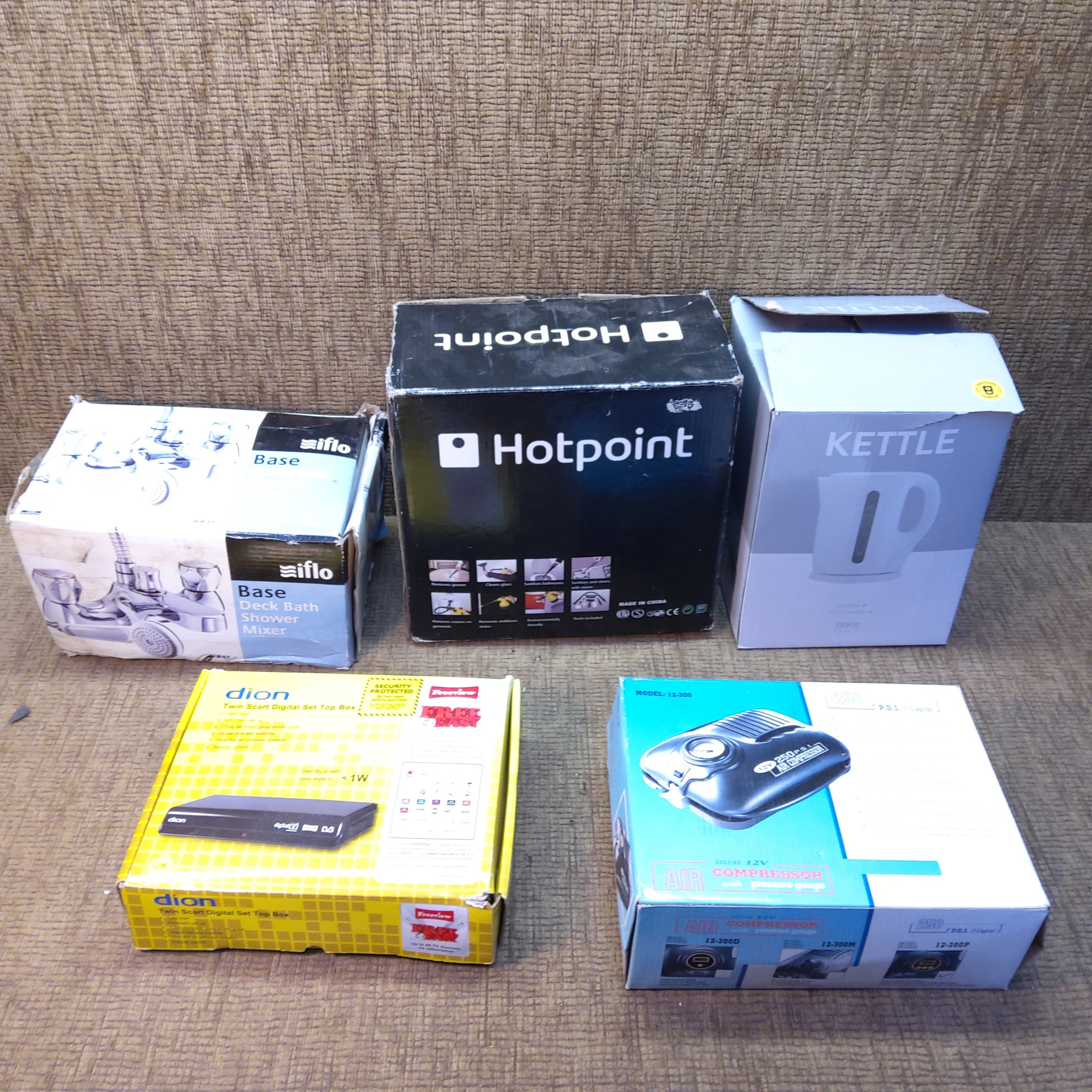 Mixed boxed items including a Hotpoint steam cleaner, an air compressor and a new twin set of taps.