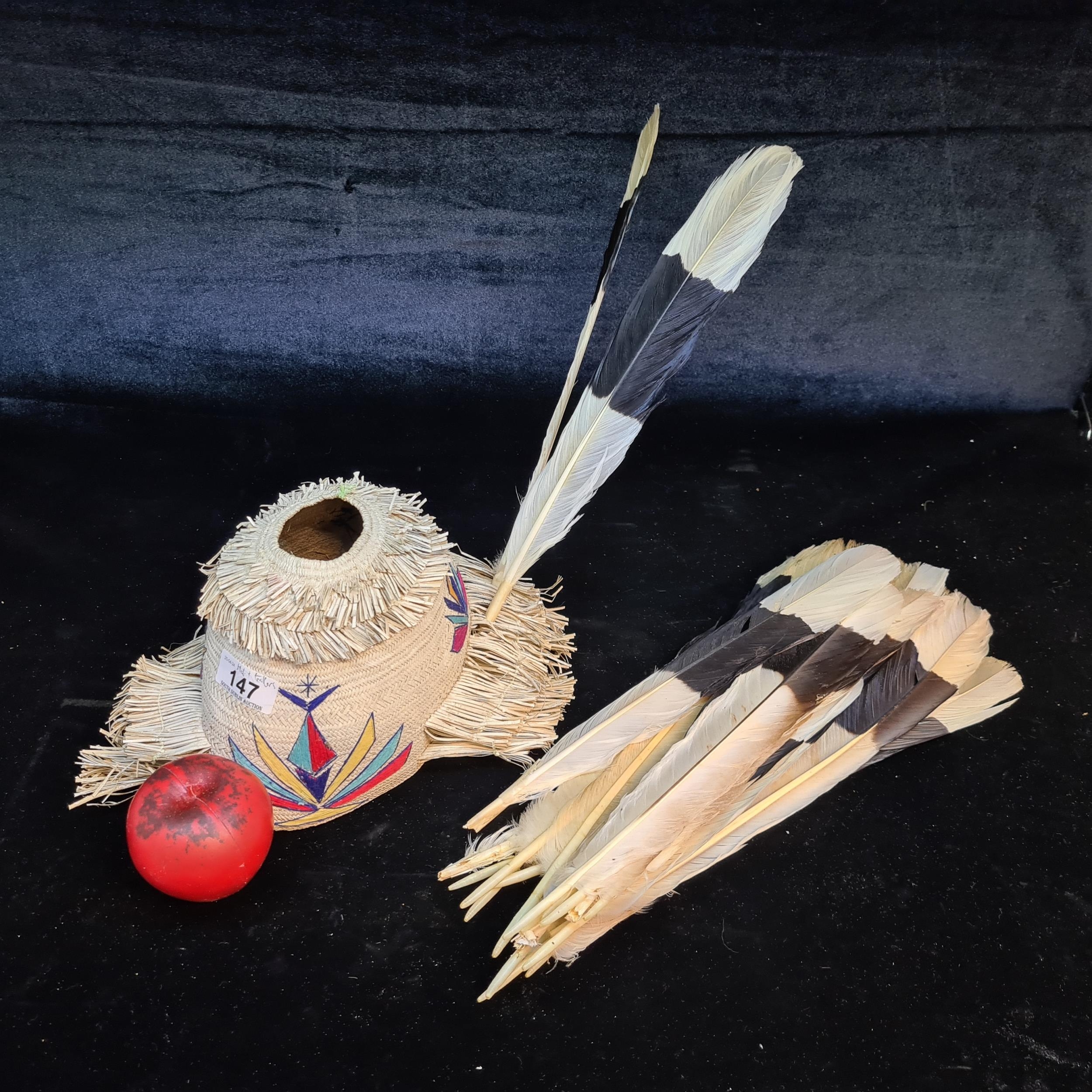 A fantastic Borneo Dayak ceremonial hat along with Hornbill feathers. This comes with a bag of Black Hornbill feathers.