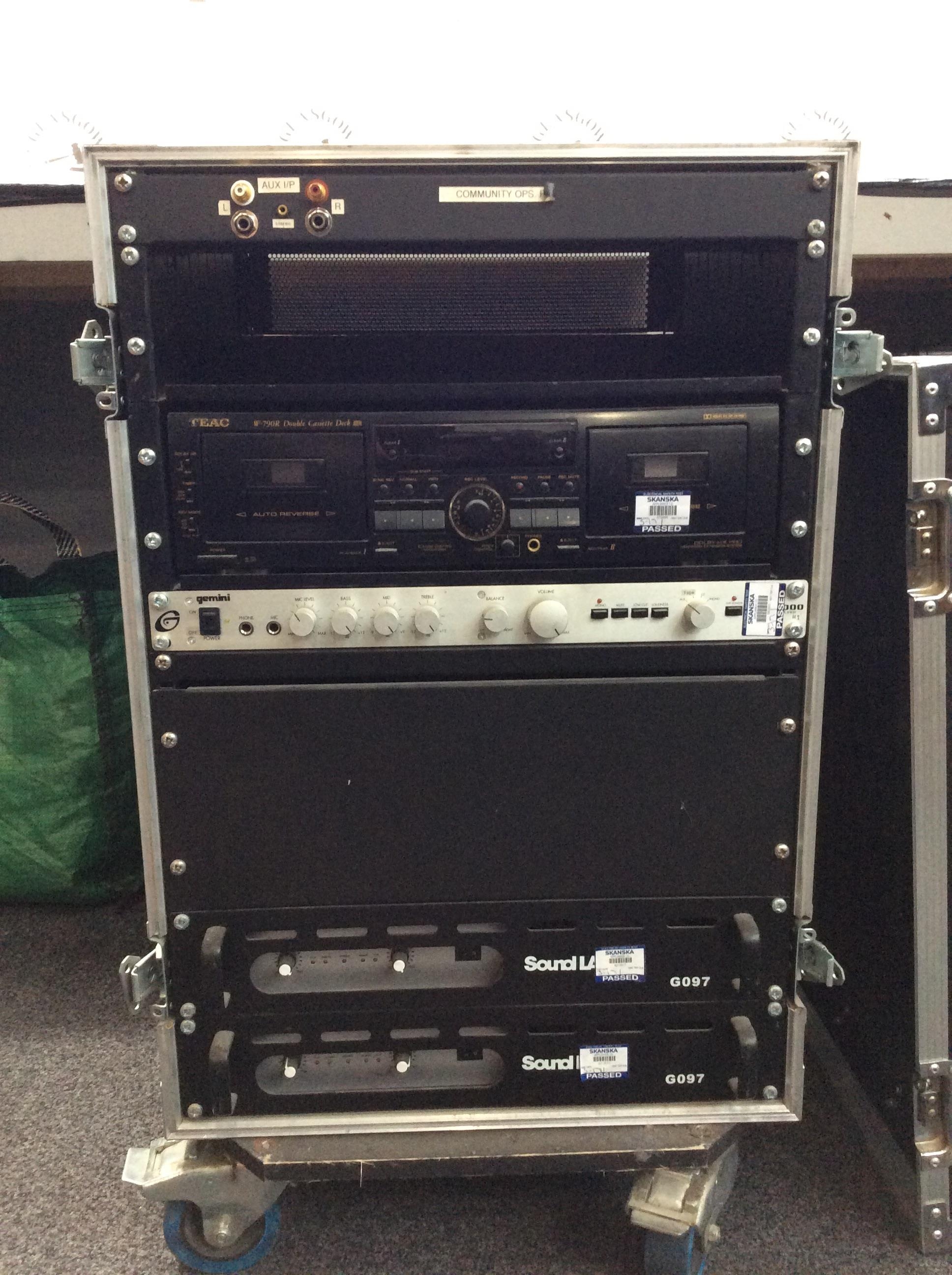 Mobile AudioRack Containing Teac V-790R Double Cassette Deck, Gemini Amplifier / Mixer & Two