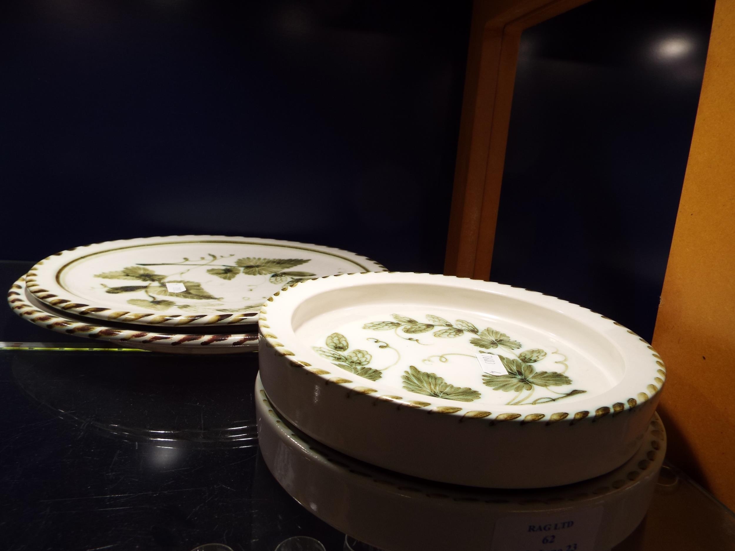 Two Rye pottery dinner plates and two shallow bowls with hop and vine decoration
