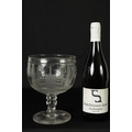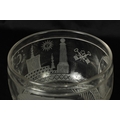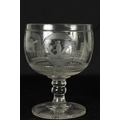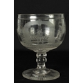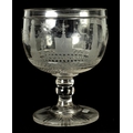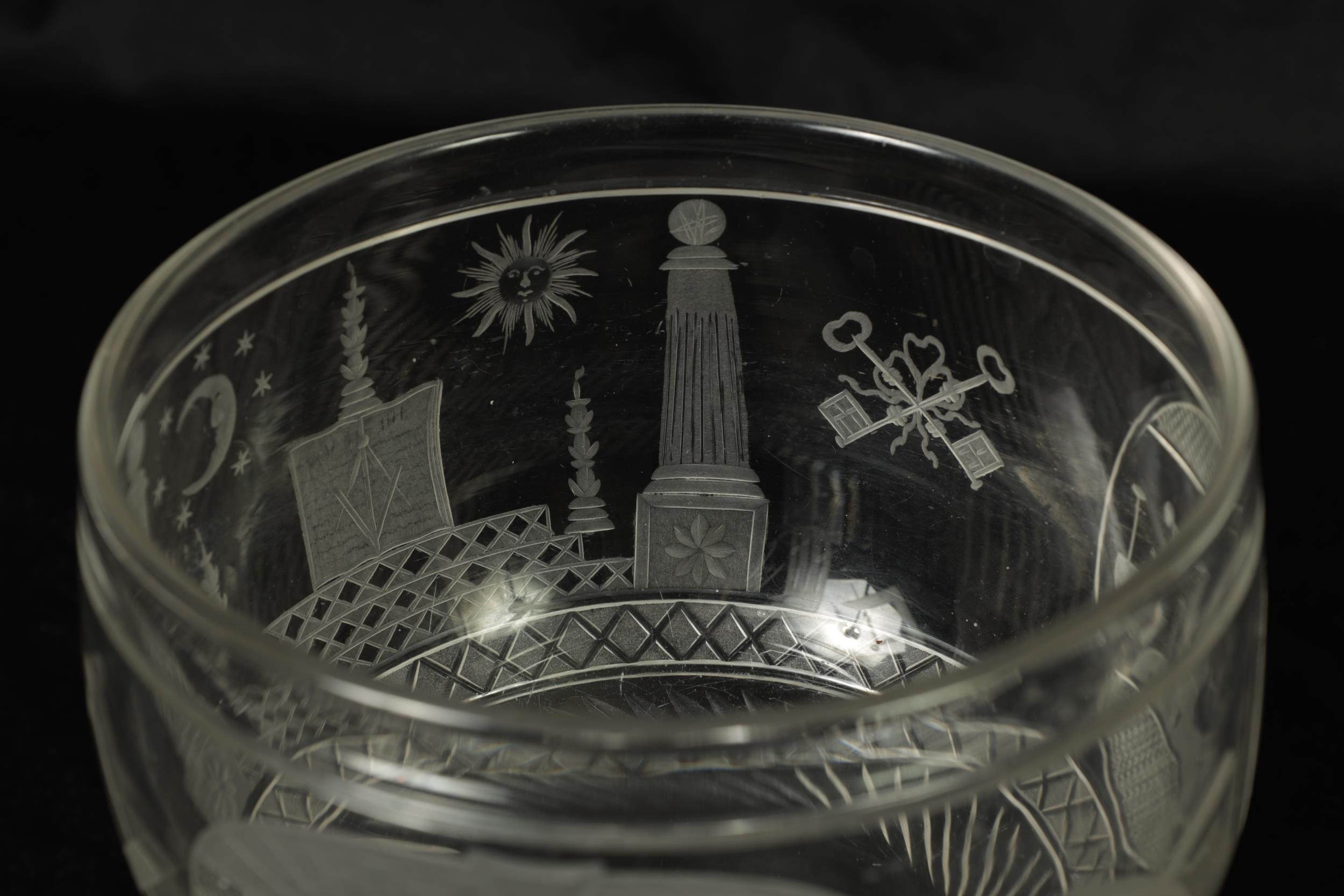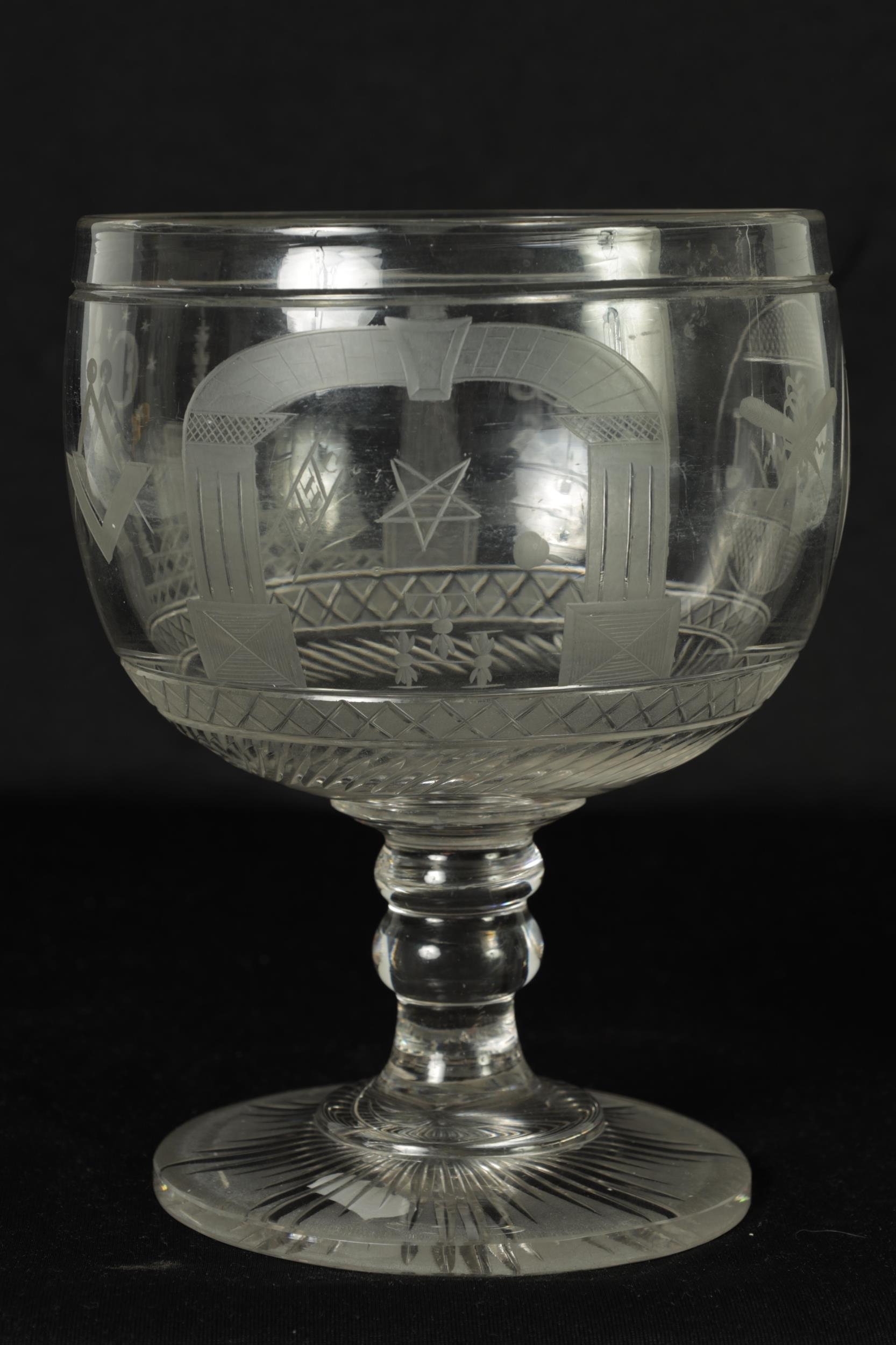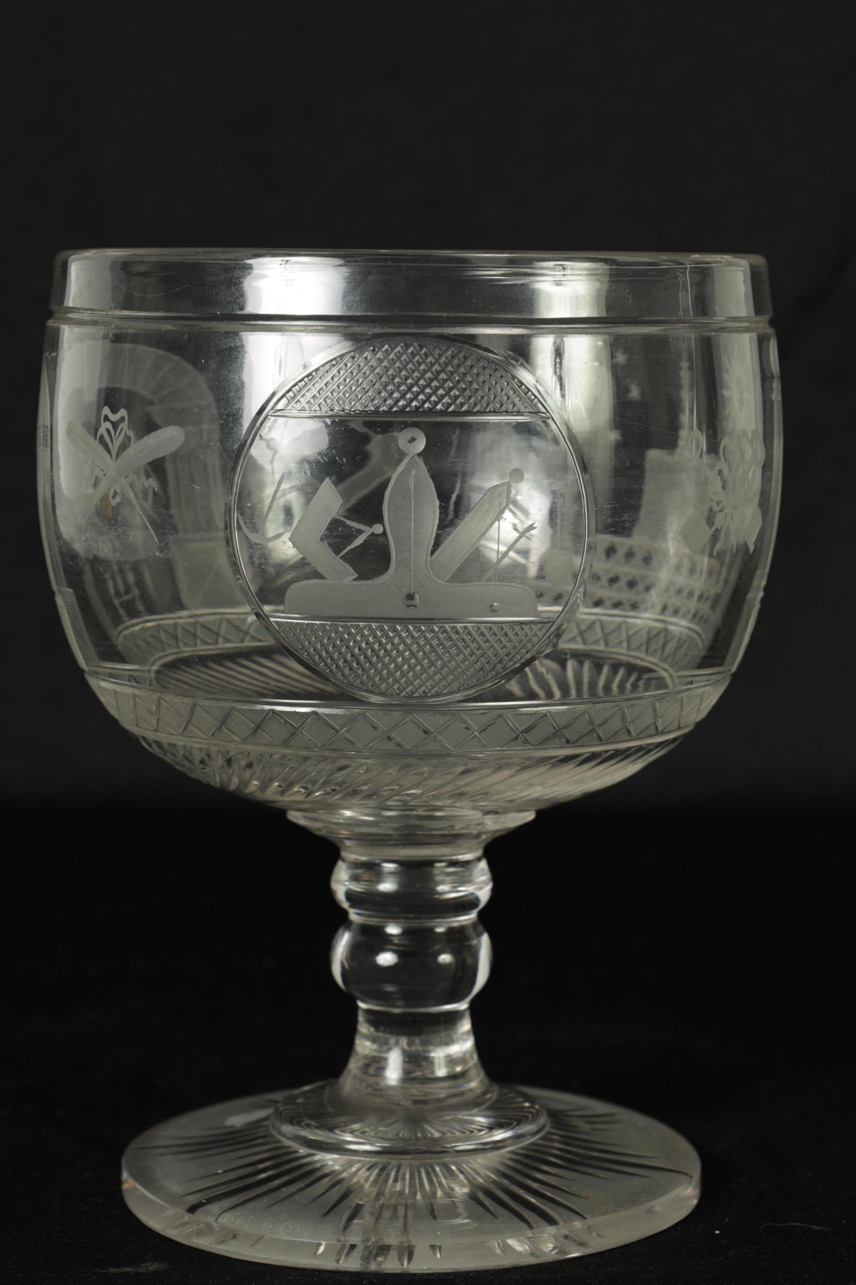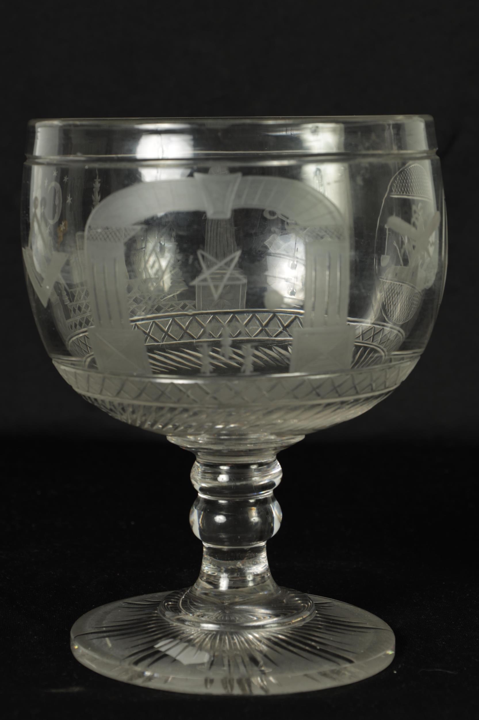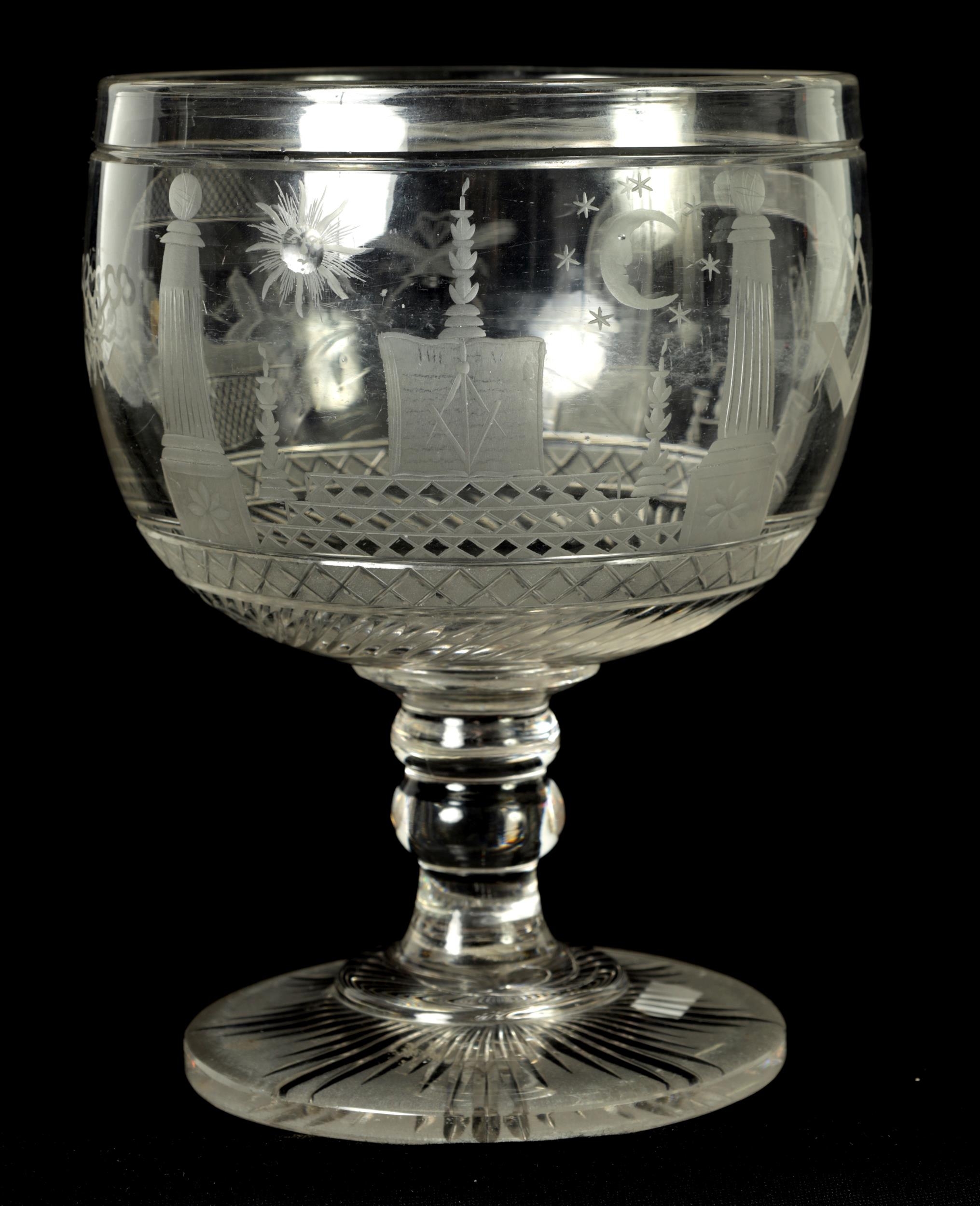 A LATE GEORGIAN MASONIC GLASS GOBLET frosted and cut engraved with various motifs and symbols above a star banded swirl cut lower body, double knopped short stem and spreading flat star cut base. (20cm high)
