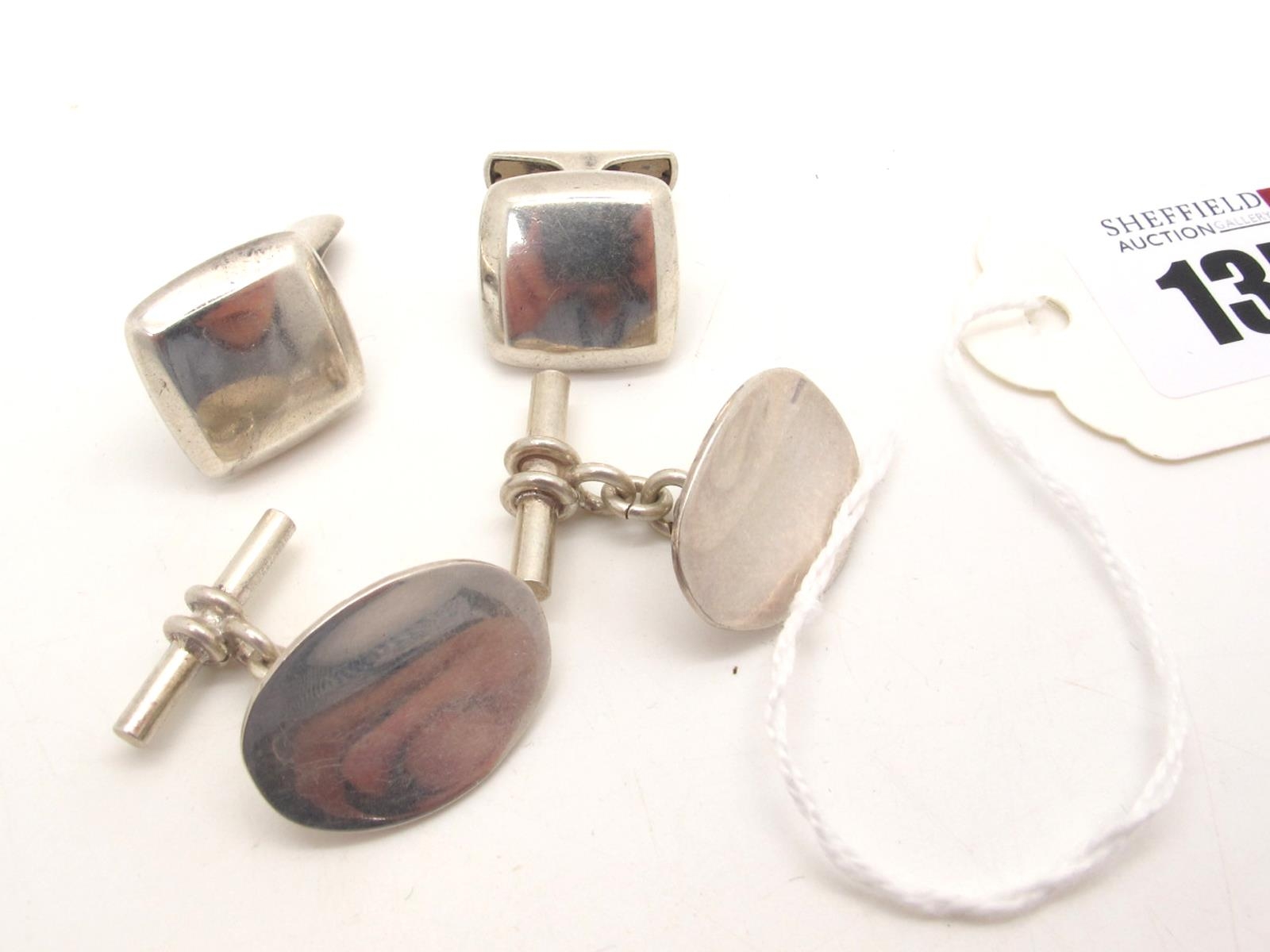 A Pair of Finnish Cufflinks, of plain cushion shape with swivel bar back, stamped "Finland" "925S"; Together with A Pair of Modern Oval Cufflinks, stamped "925". (2)