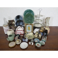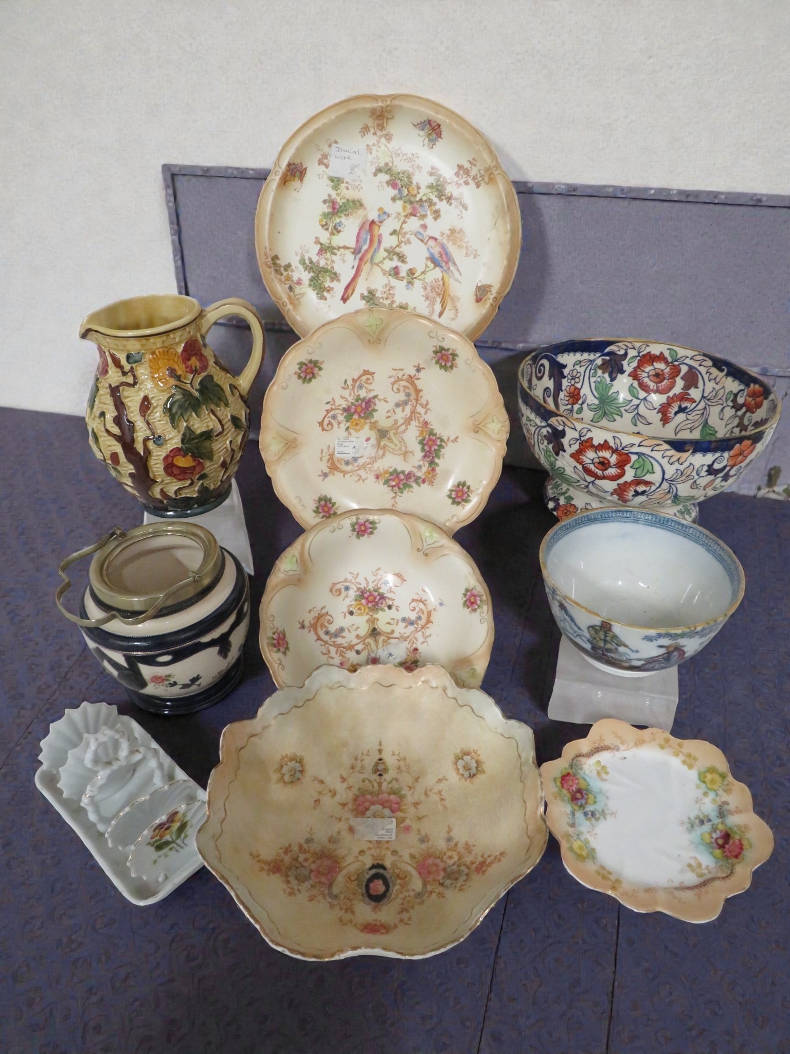 Collection of decorative porcelain including Ducal, Haywood, and Oriental-style pieces. Mixed lot comprising three matching cream dishes with exotic bird decoration (parrots or macaws) and gilt fan-shaped borders in rococo style, ornate majolica-style jug with relief vine leaves and grapes in autumnal glazes, pair of decorative bowls including Imari palette example with iron red, cobalt blue and gilt floral decoration, plus Oriental-style bowl with enamel painted figural scene. Additional pieces include small shaped pin dishes with floral sprays. Varied styles from continental and English production. Largest piece approximately 10 inches diameter. Attractive decorative ceramics spanning Victorian to 20th century.