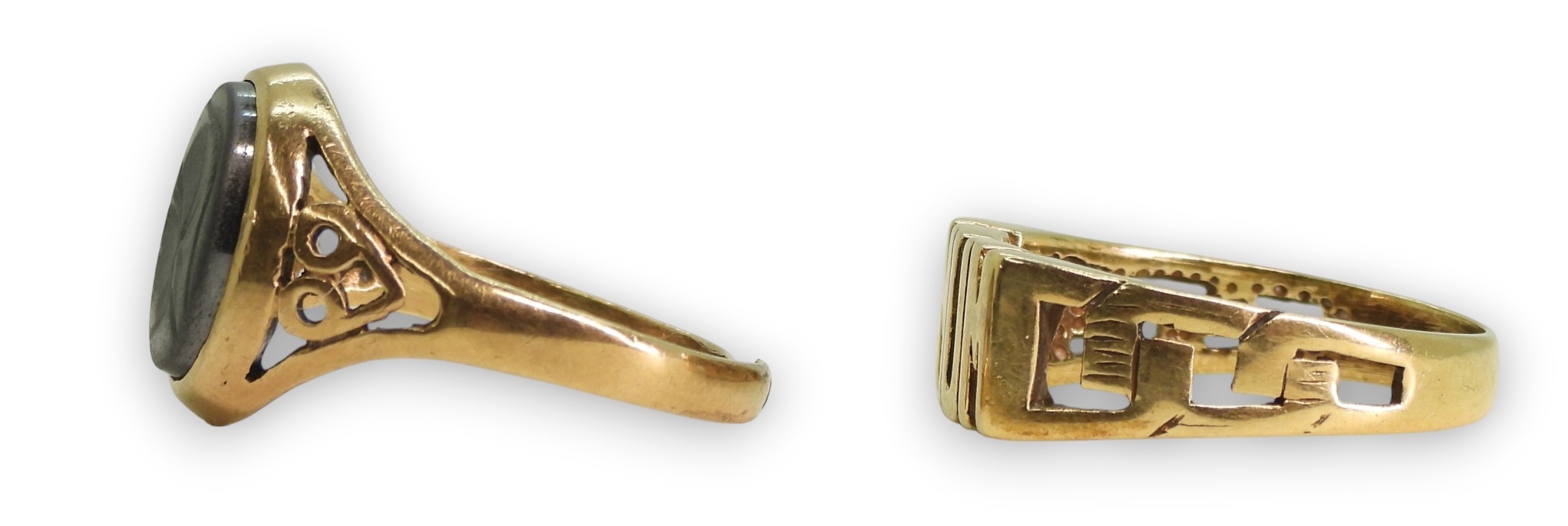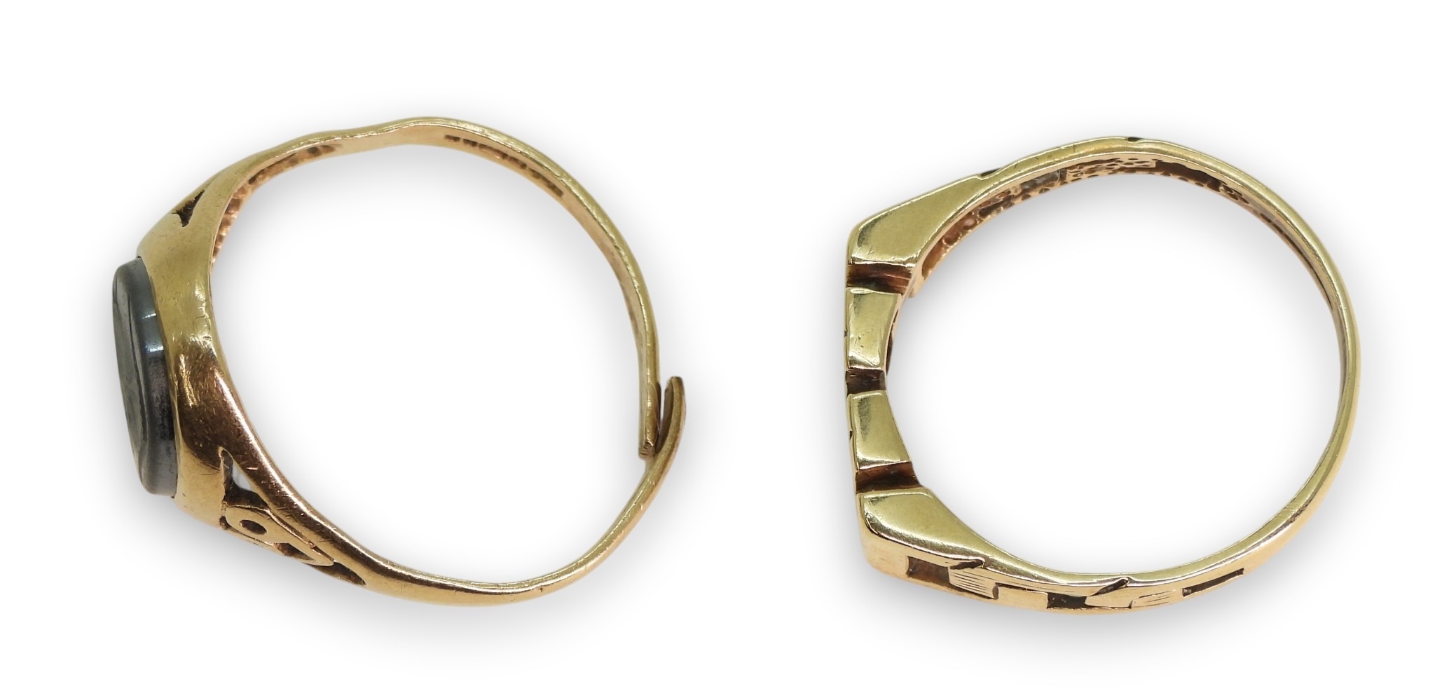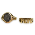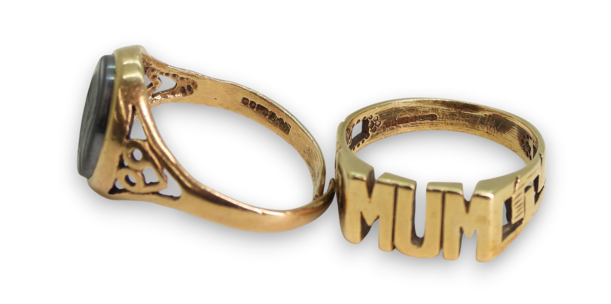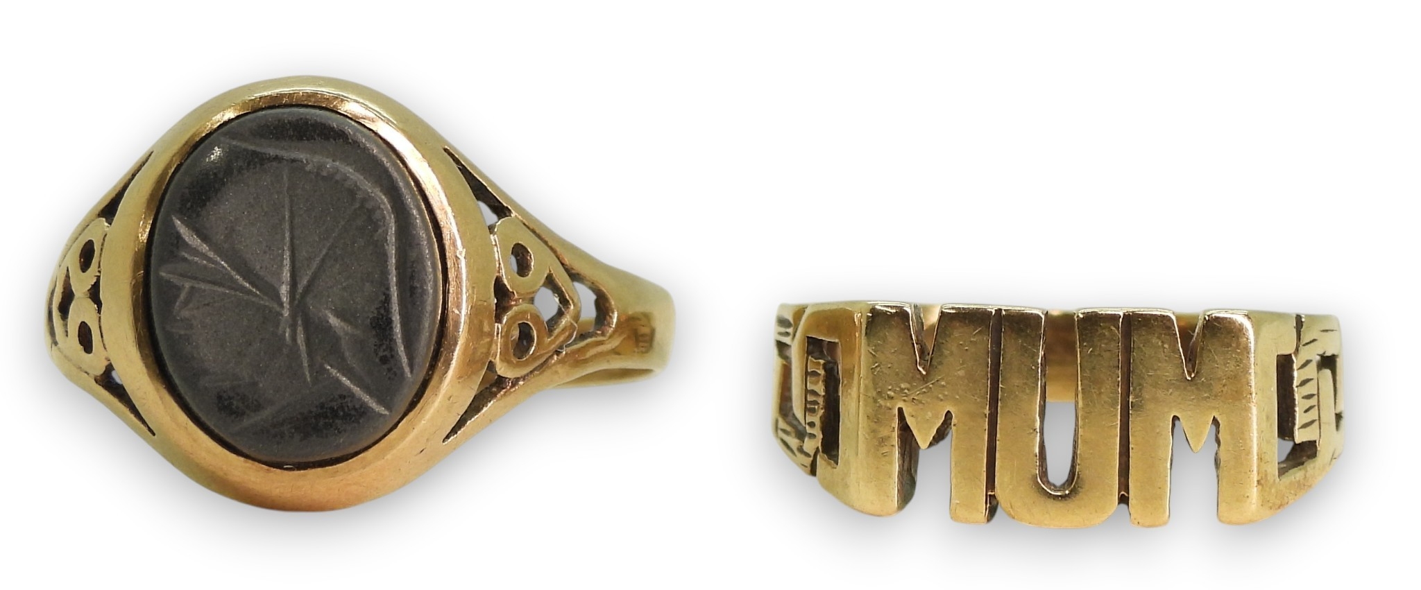 A 9ct gold MUM ring size P1/2, a 9ct gold centurion ring, size approx W (shank snapped) weight combined 6.8gms