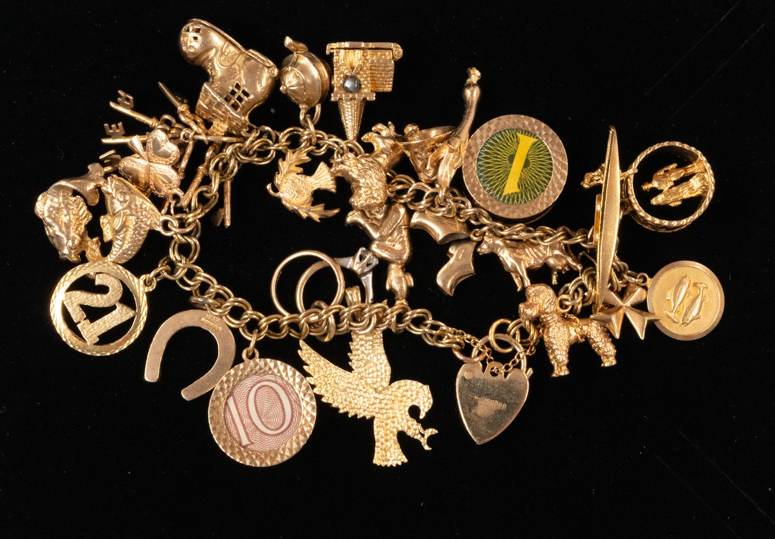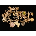 Jewellery: a 9ct gold bracelet with heart shaped clasp, suspended with at least 24 charms including boots, keys, a stanhope set church, etc., mostly 9ct gold but also a 14ct gold eagle. Gross weight 68.3g.