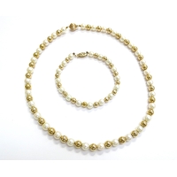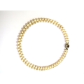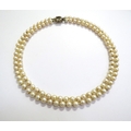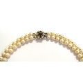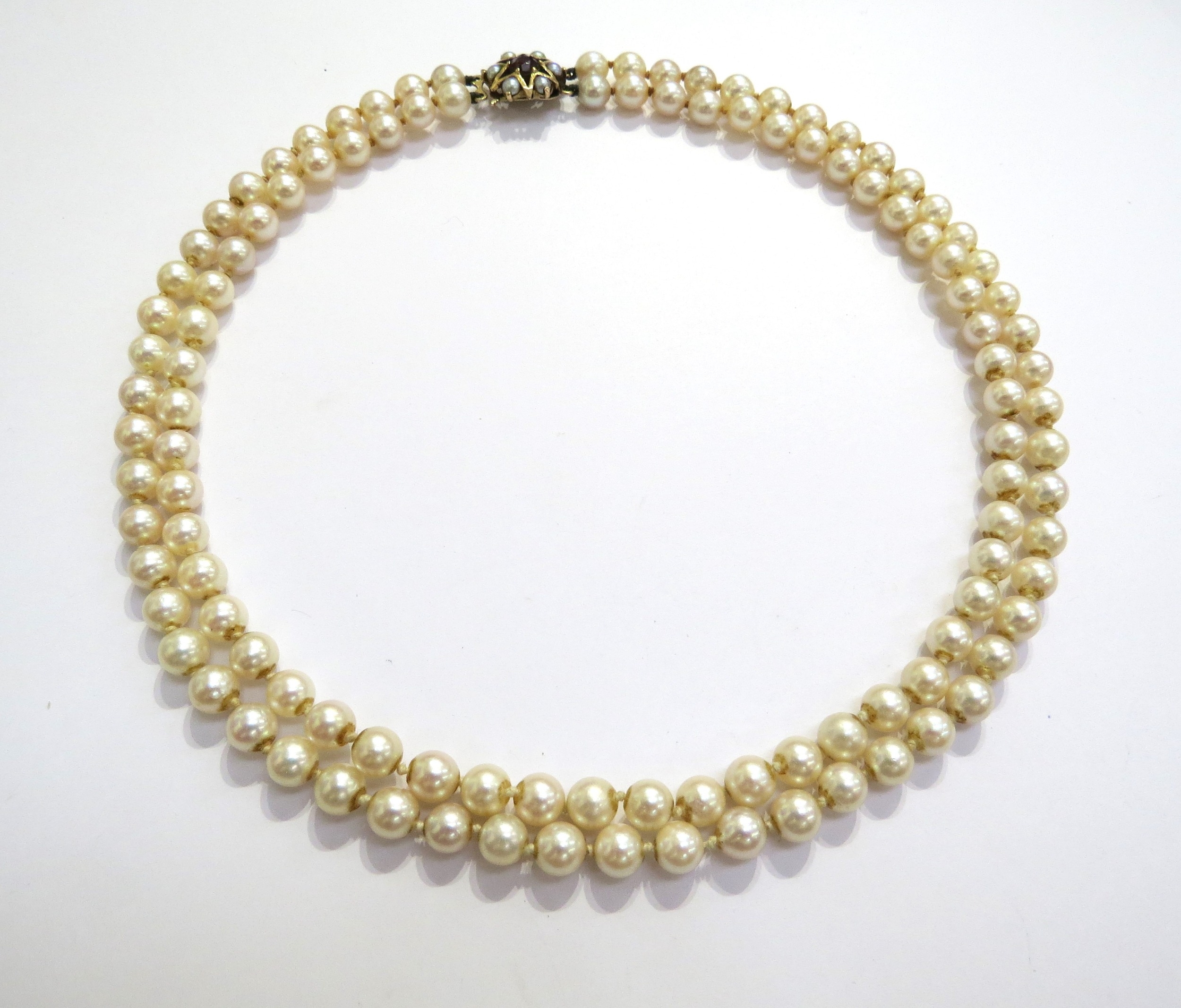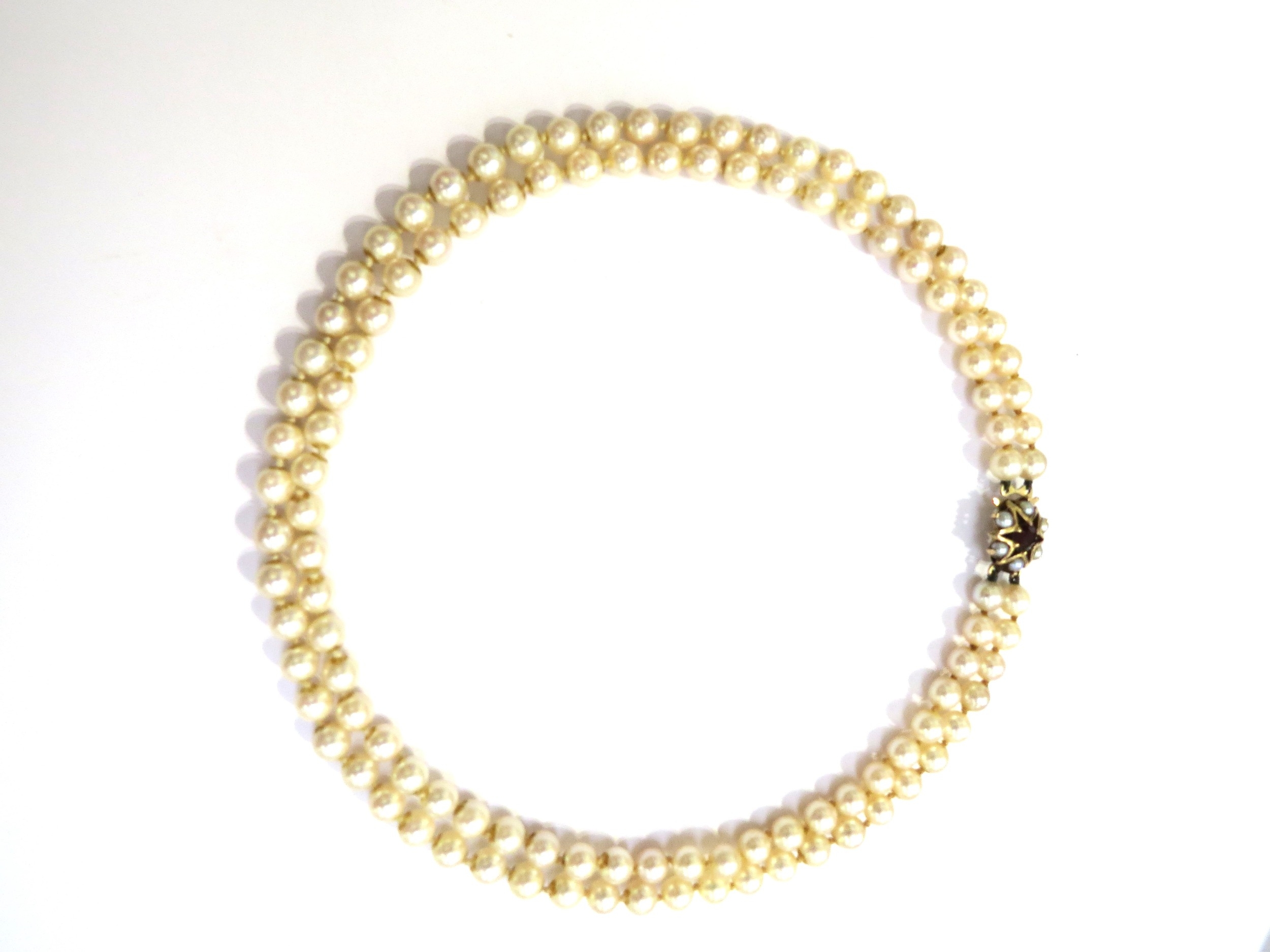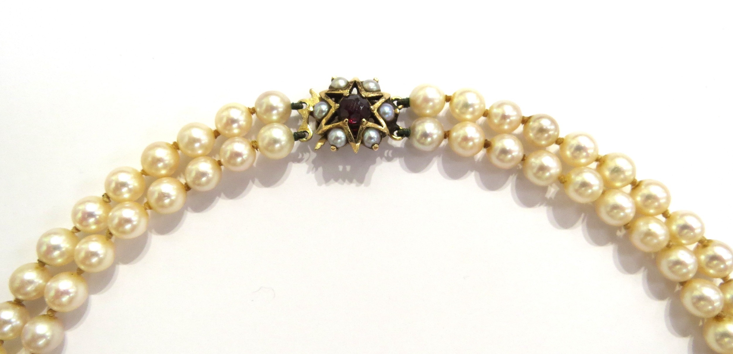 A double strand pearl necklace with a 9ct gold garnet and pearl star shaped clasp, 41cm long