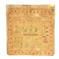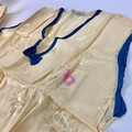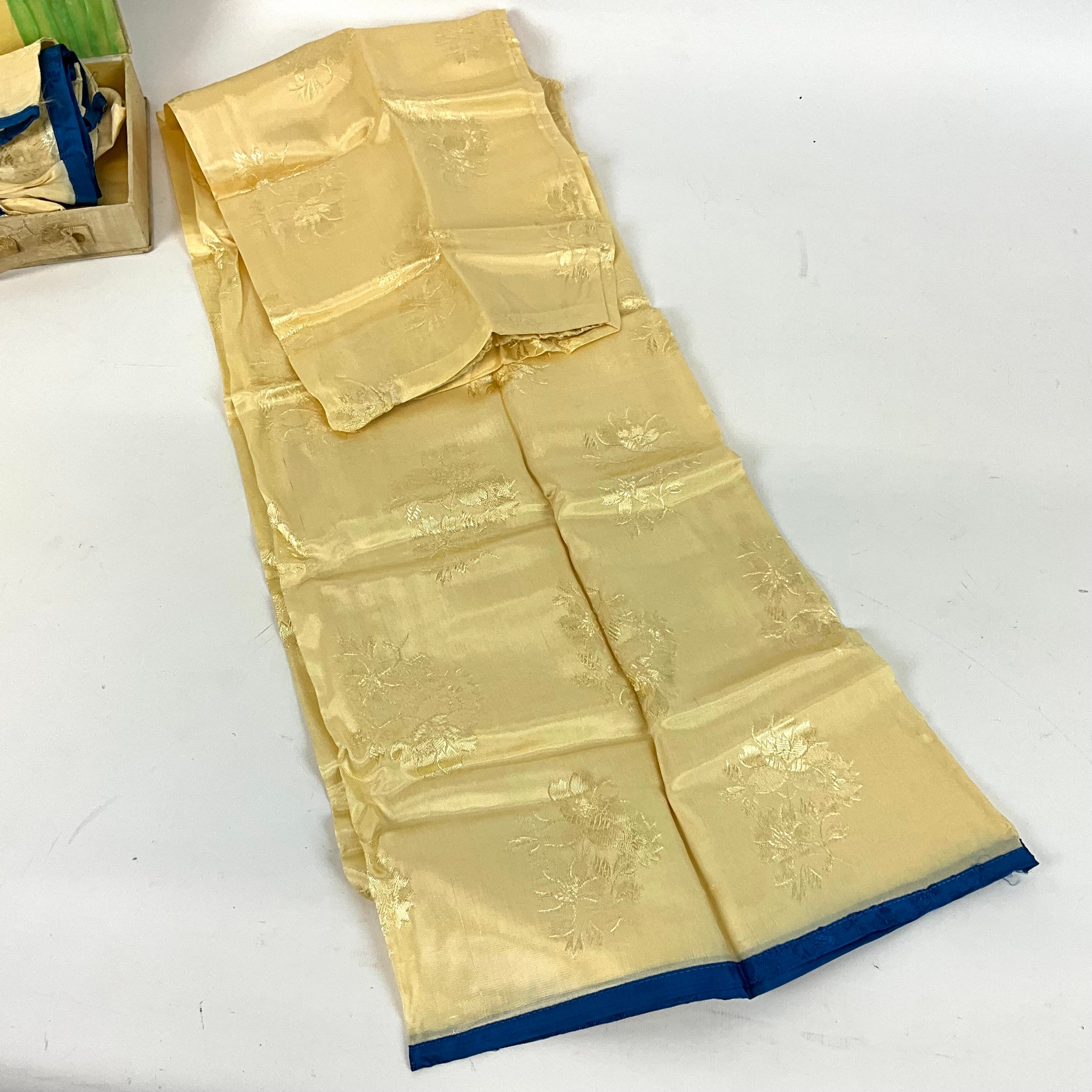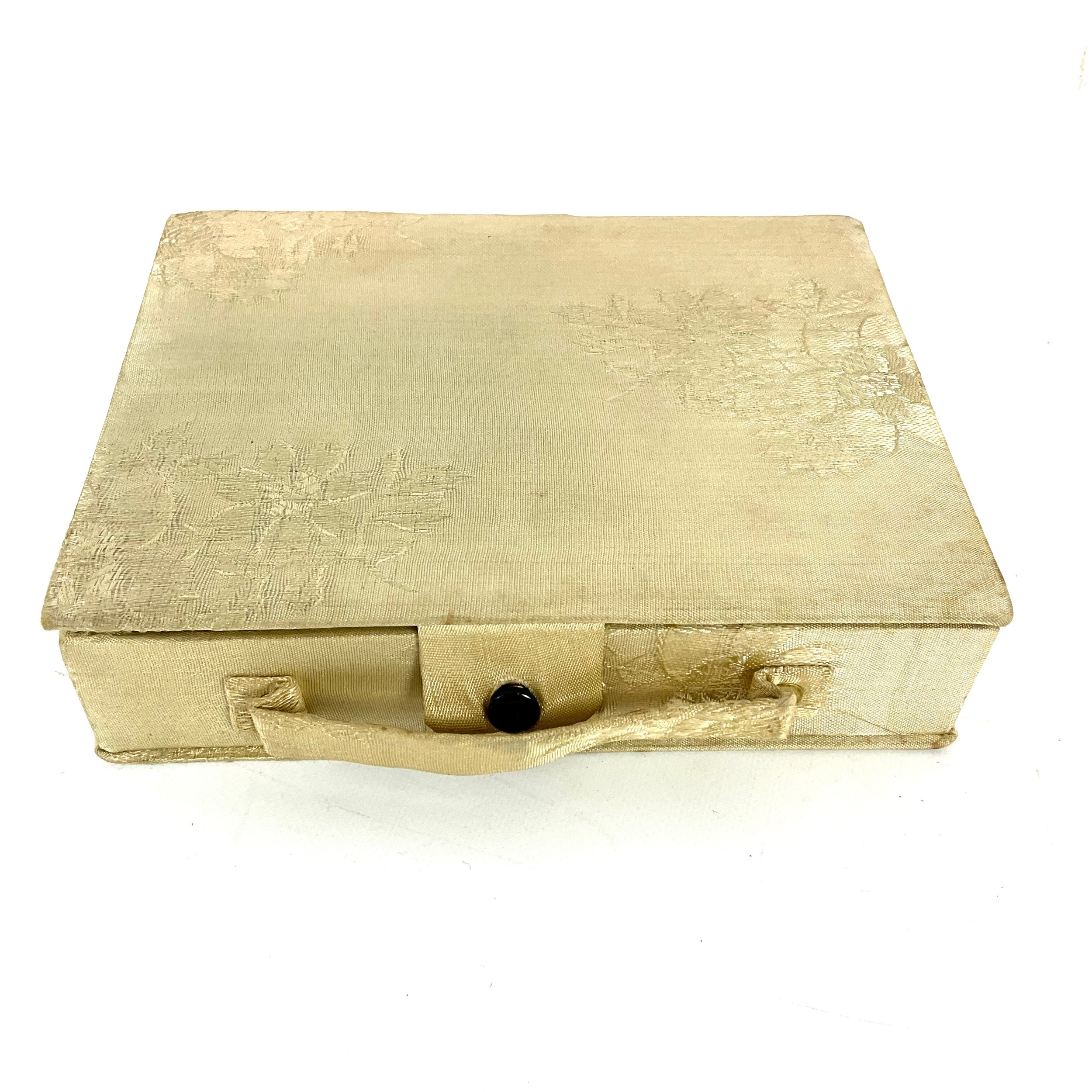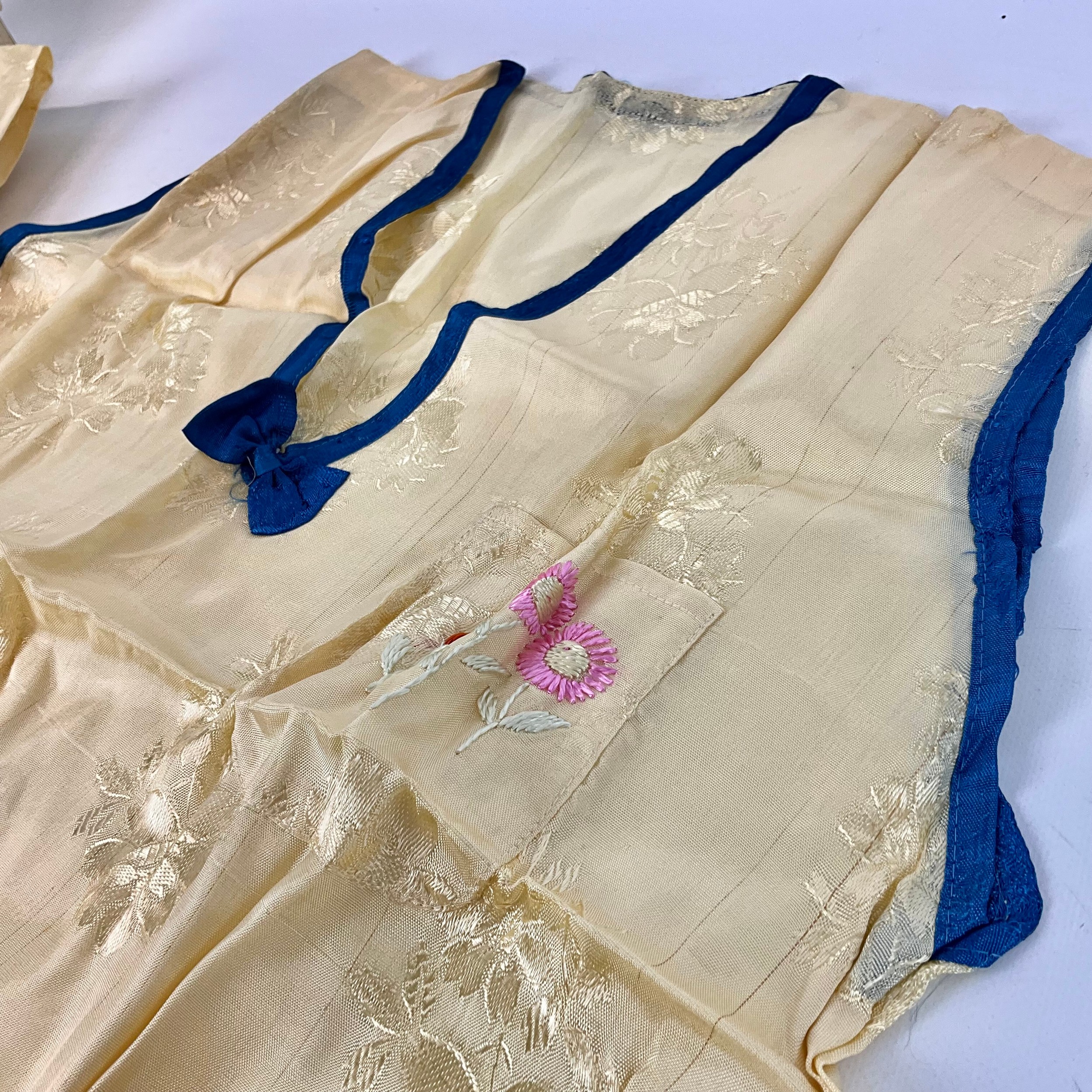 Late 19th early 20th-century child's silk embroidered pyjamas with matching silk-covered travelling case in cream, with internal mirror and pocket, H4cm x W18.5cm x D14cm.