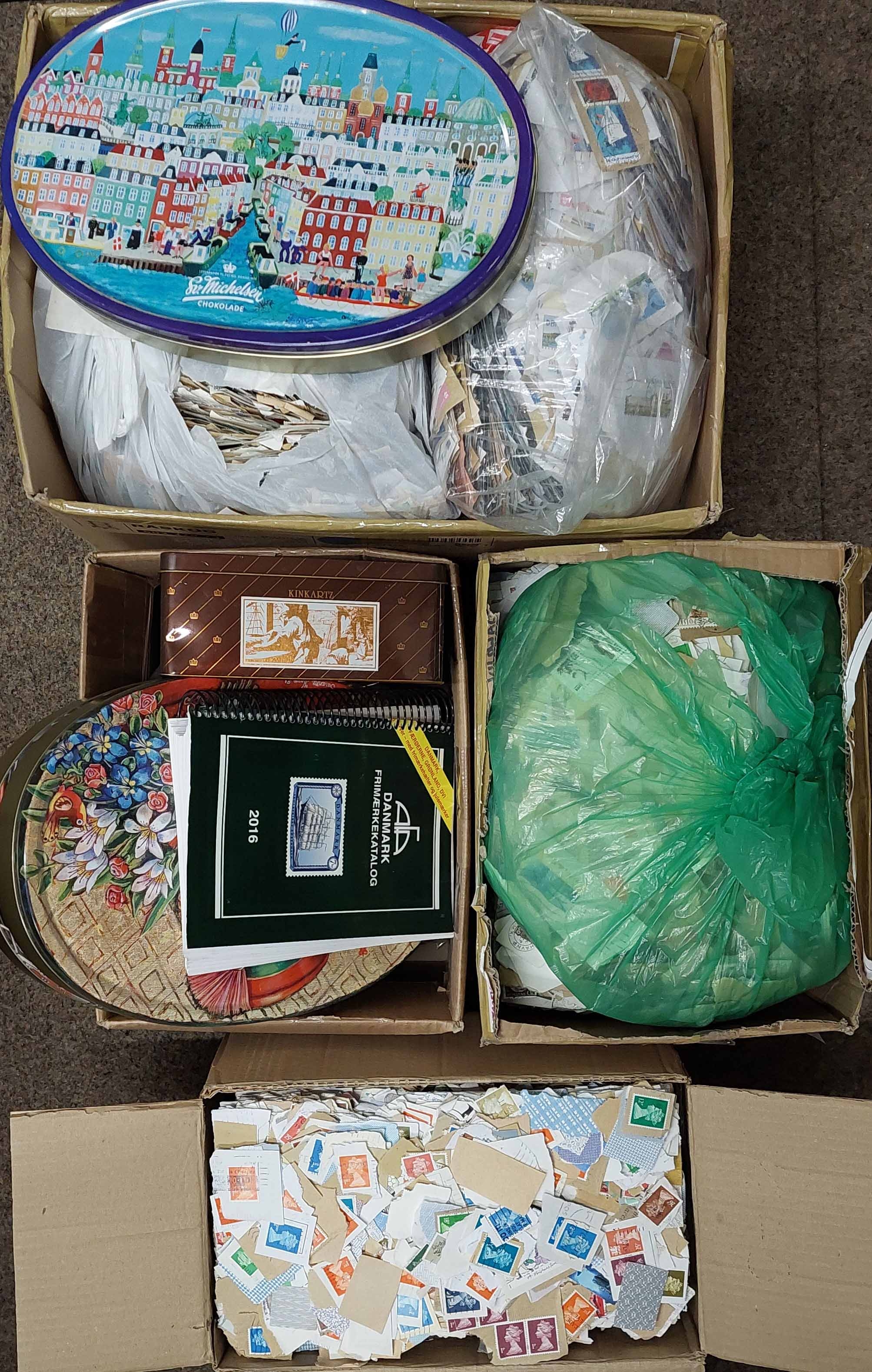 WORLDWIDE KILOWARE: Five cartons containing mainly modern Scandinavia, plus some German and GB material. Virtually all on piece. Much Denmark. (many 1,000s) Cross Reference: DENMARK, GERMANY, GREAT BRITAIN, SCANDINAVIA