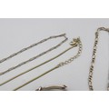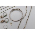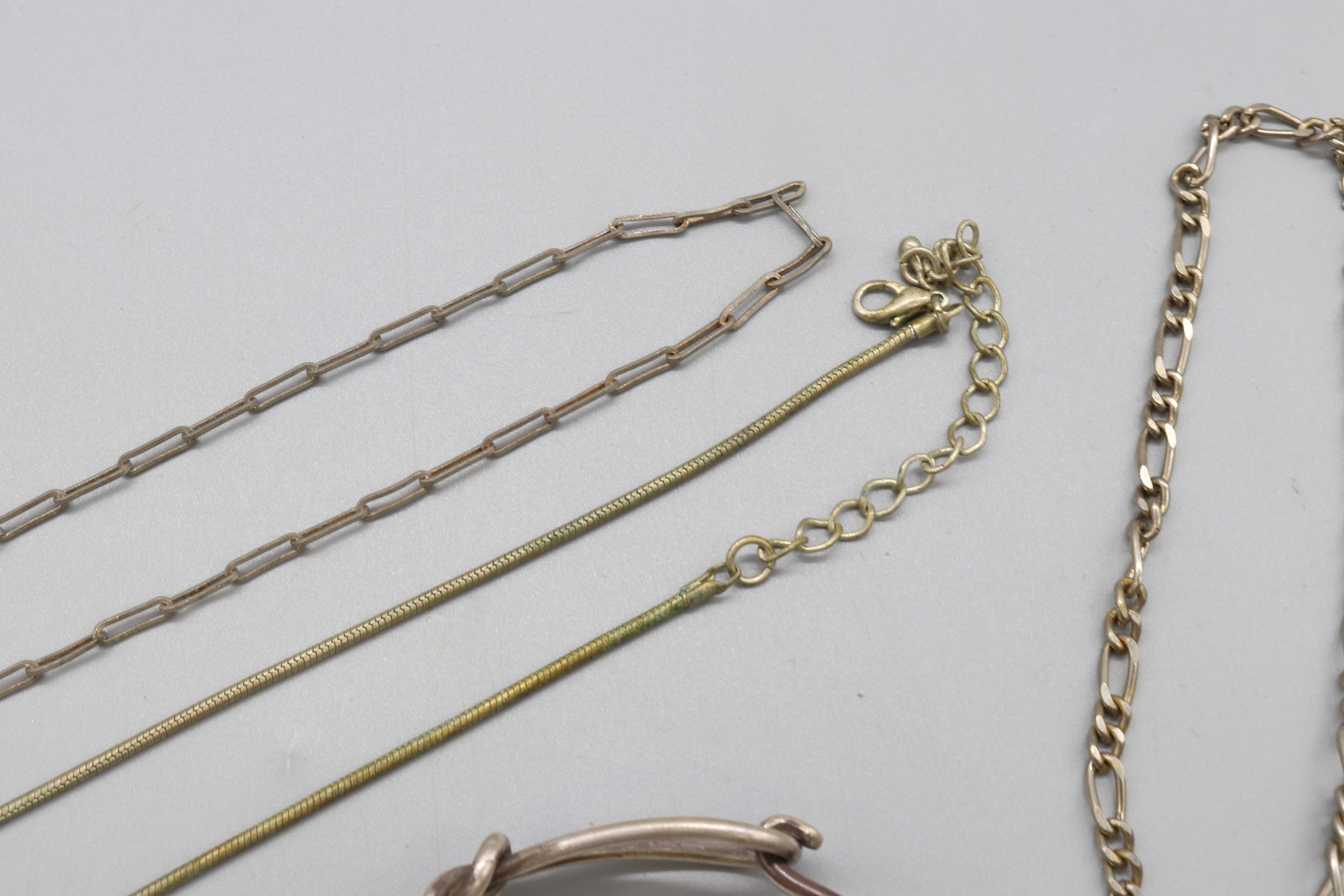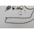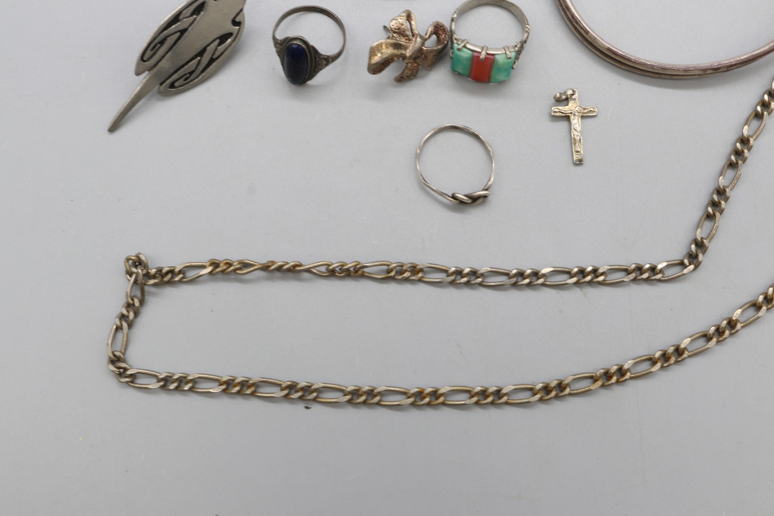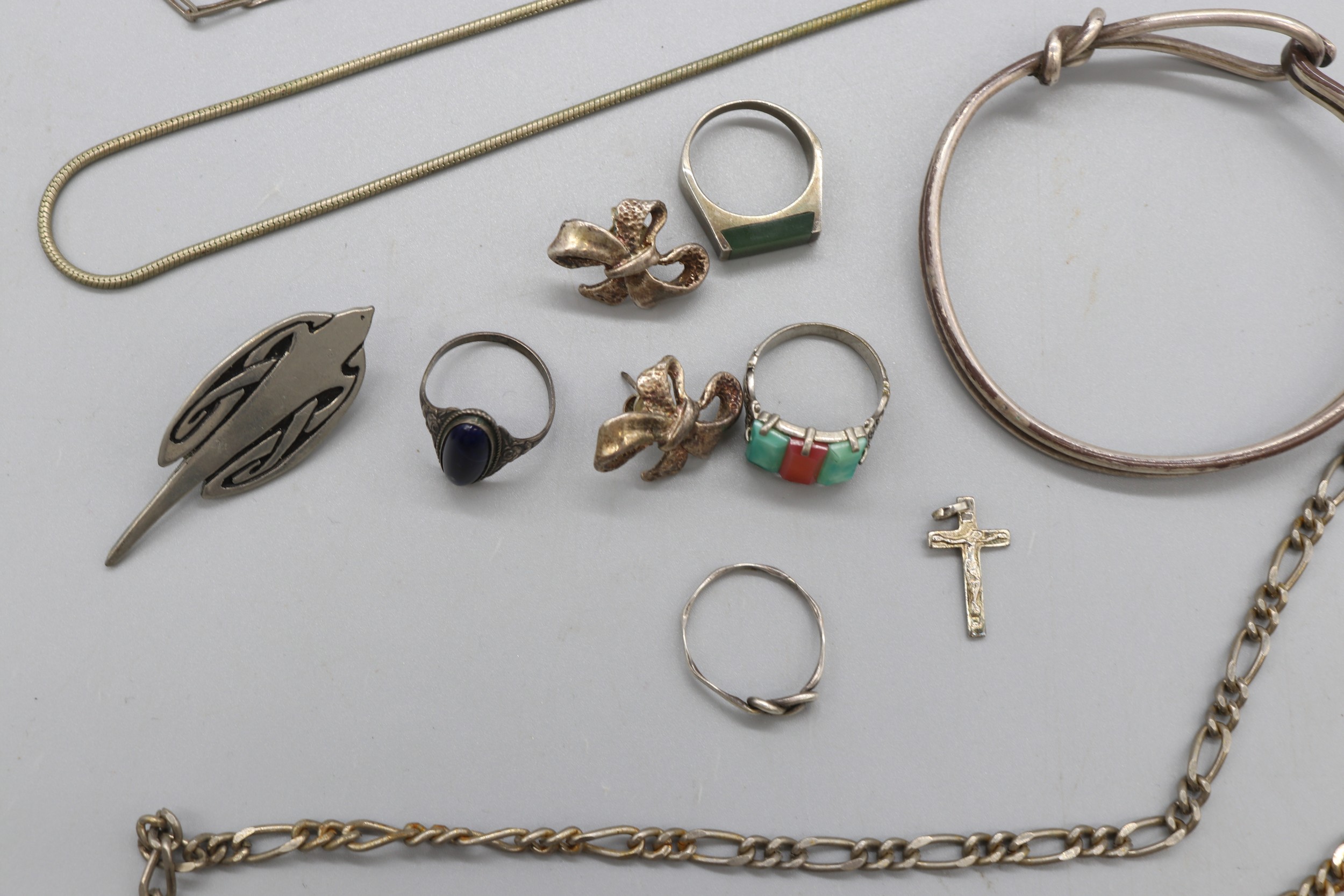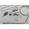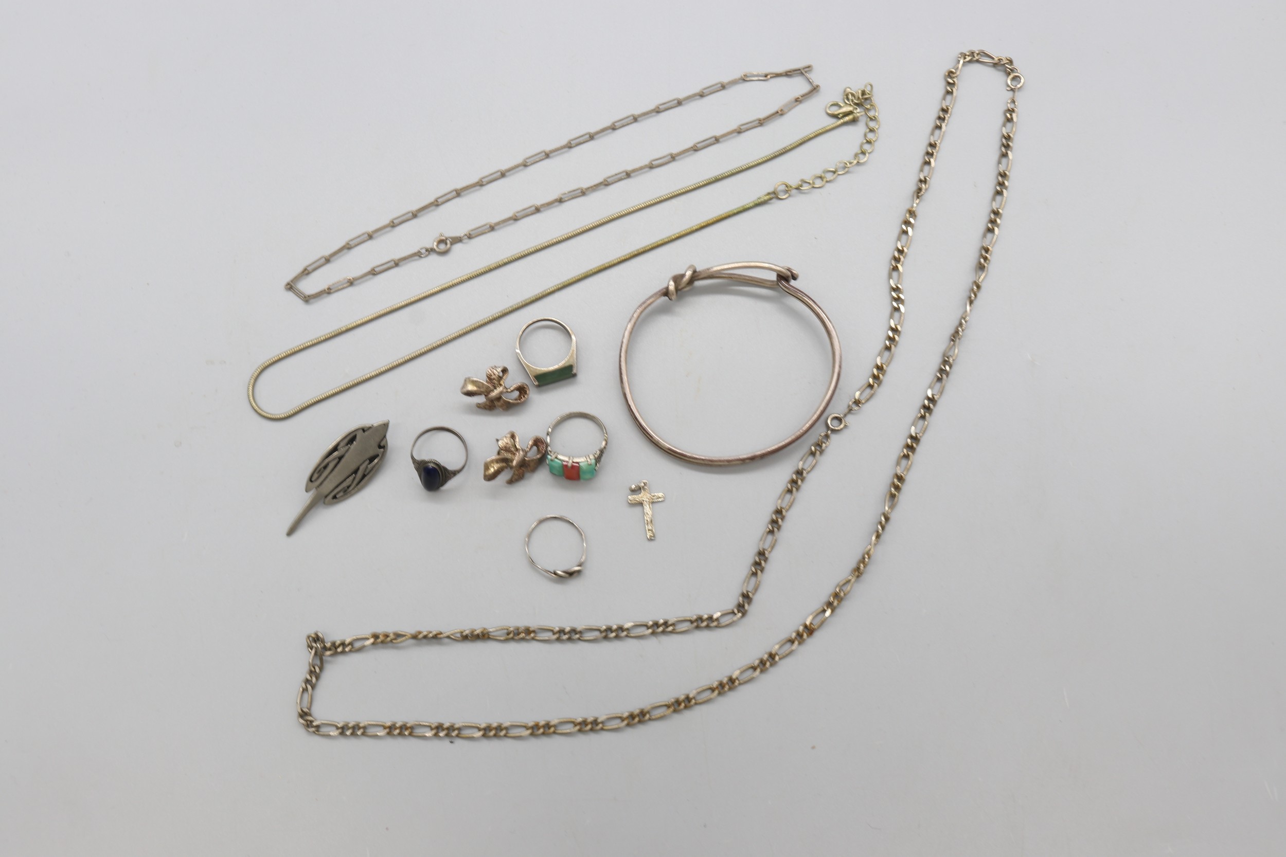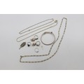 Lot of mixed white metal jewellery comprised of three chains earrings 4 rings, a pin badge and cross pendant, total weight 89g