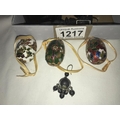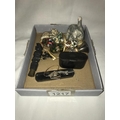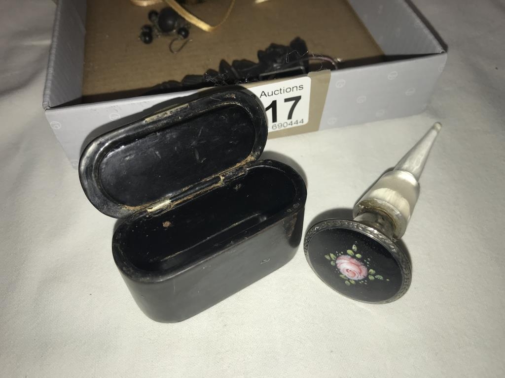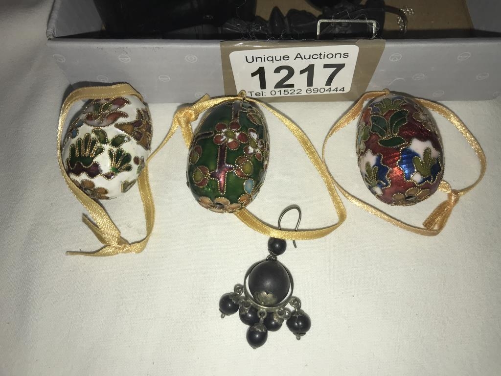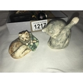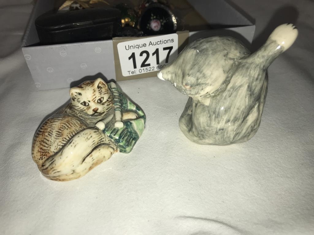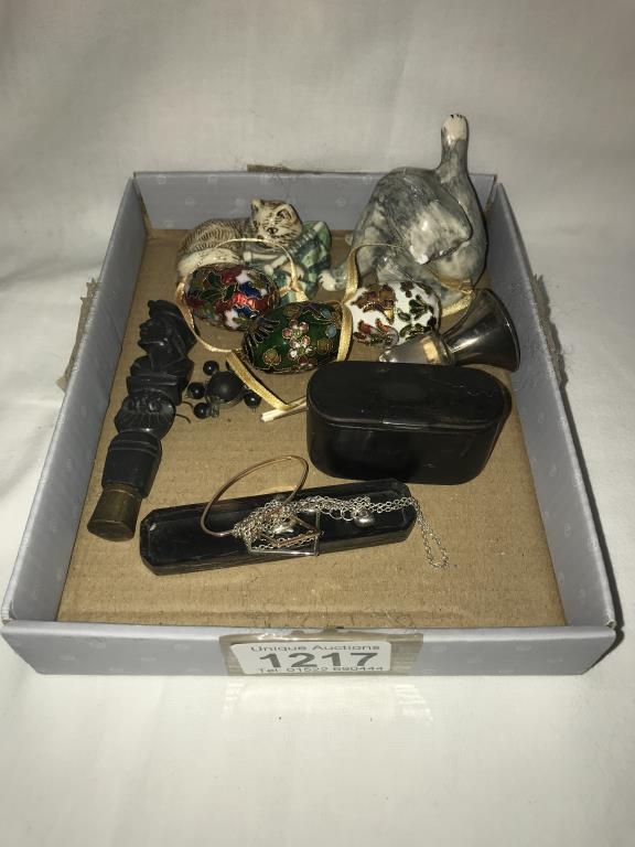 A silver topped perfume bottle stopper, 3 decorative eggs, 2 cats & snuff box etc.