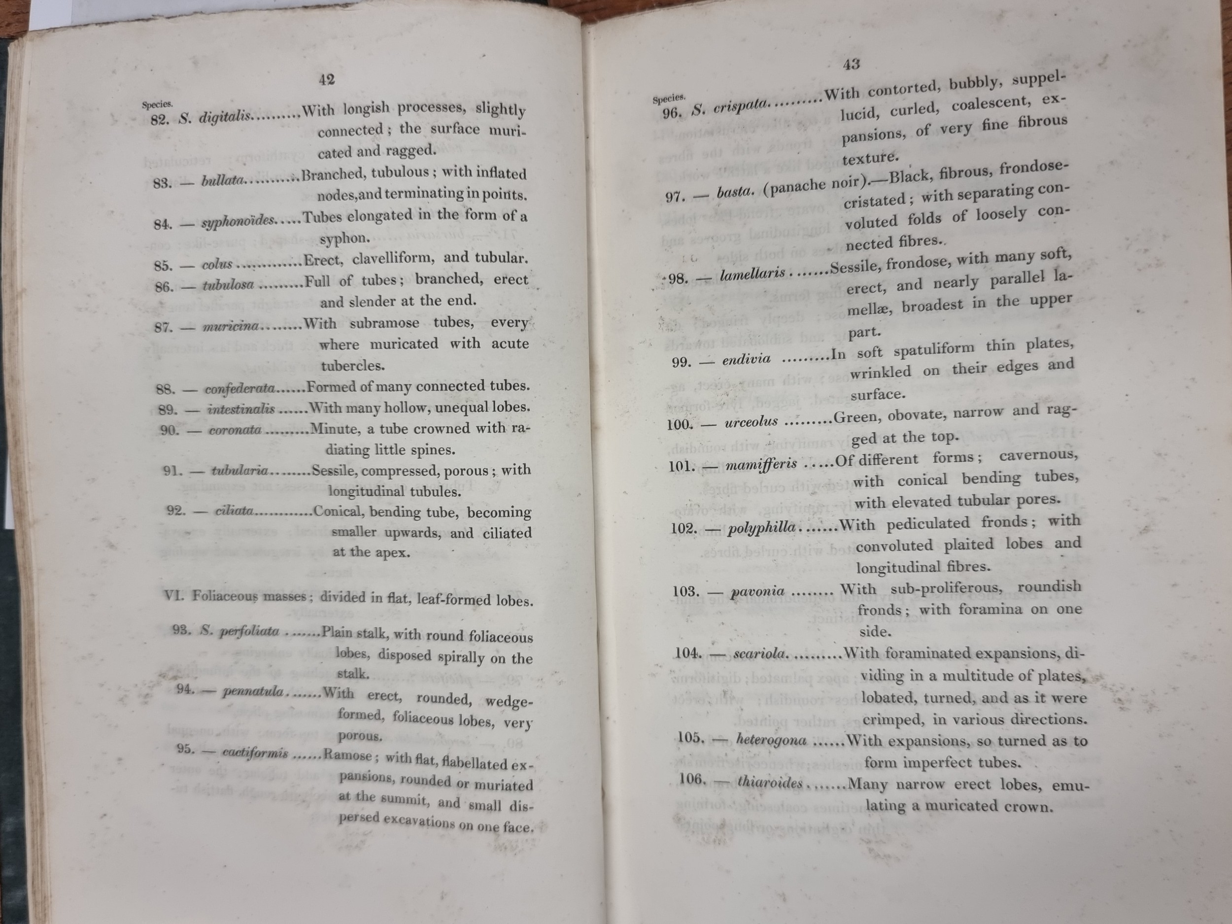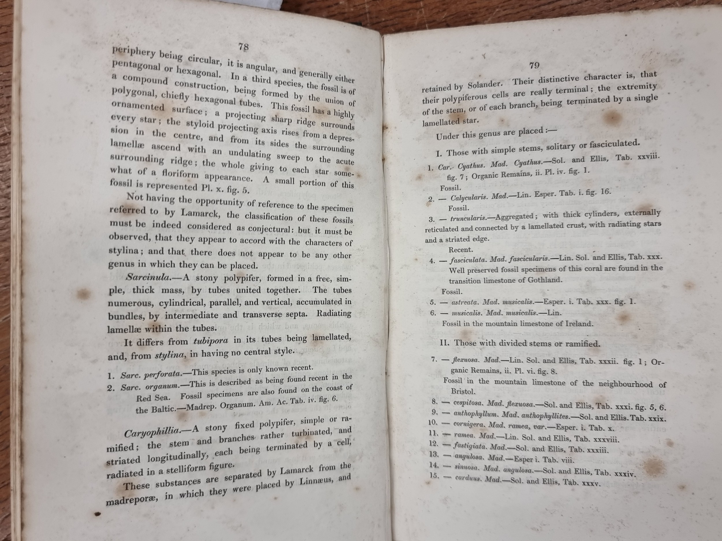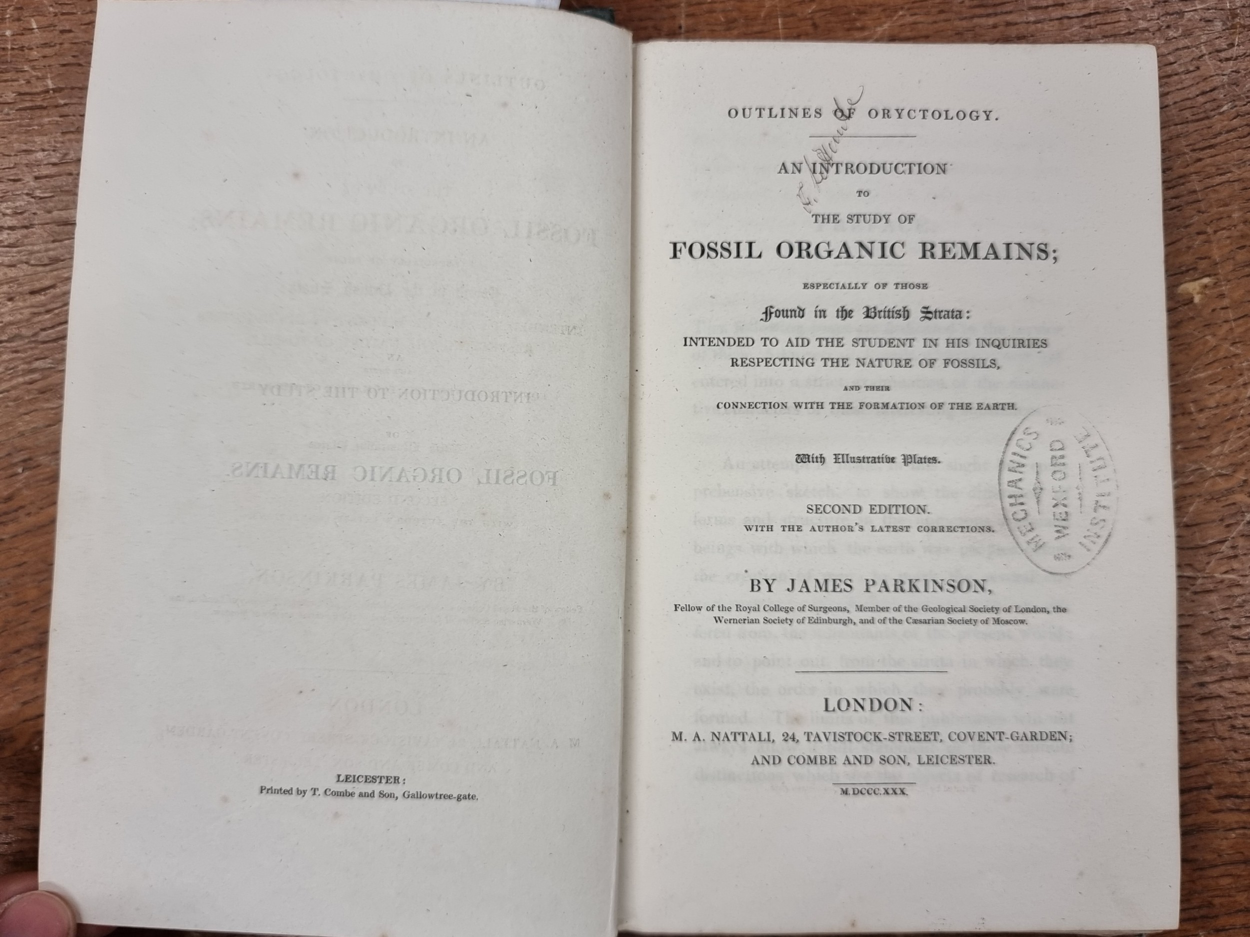 An antique hardback book titled 'An Introduction to the Study of Fossil Organic Remains' by James Parkinson. Published by Combe and Son in 1830. A similar edition internet comps for $221.70 on abebooks.com. Very early book ion Fossils with lots of Illustrations.