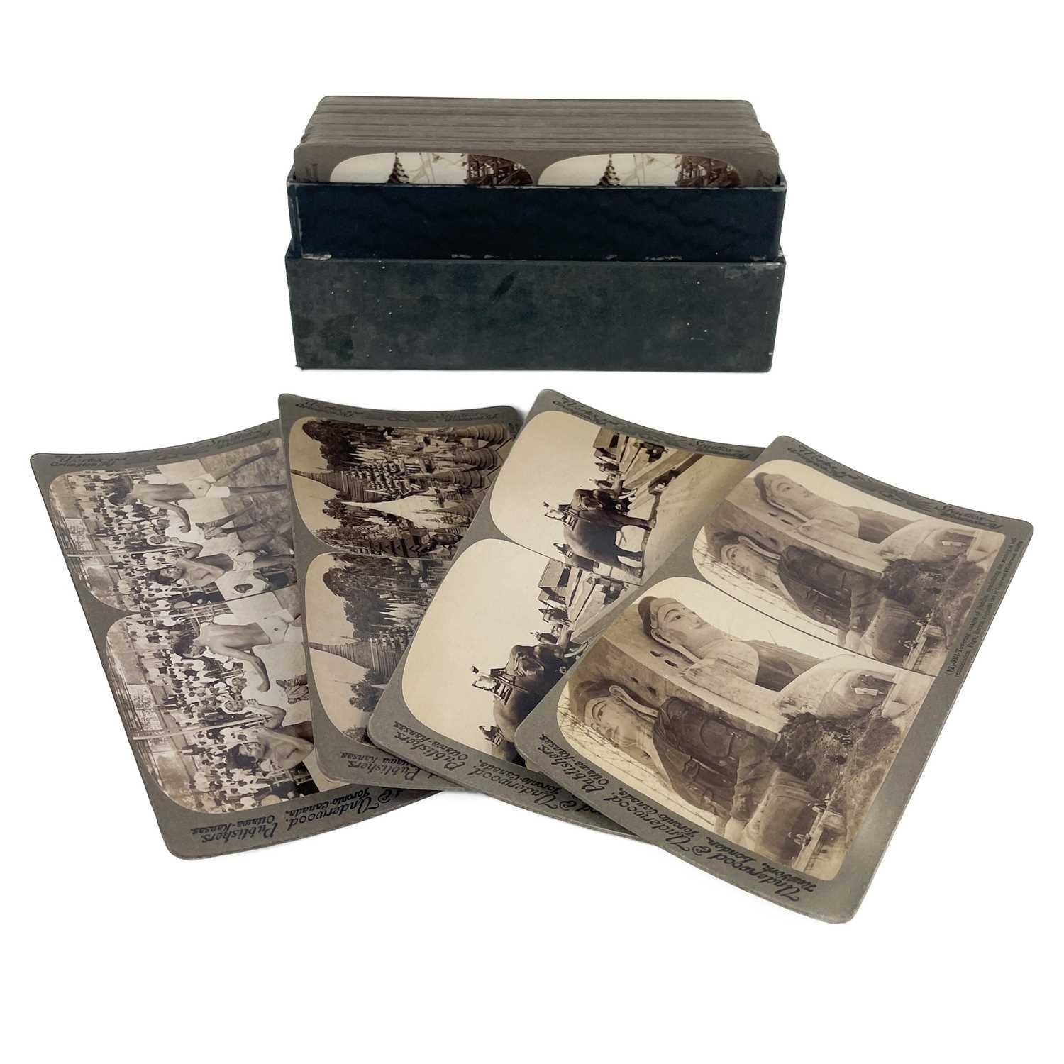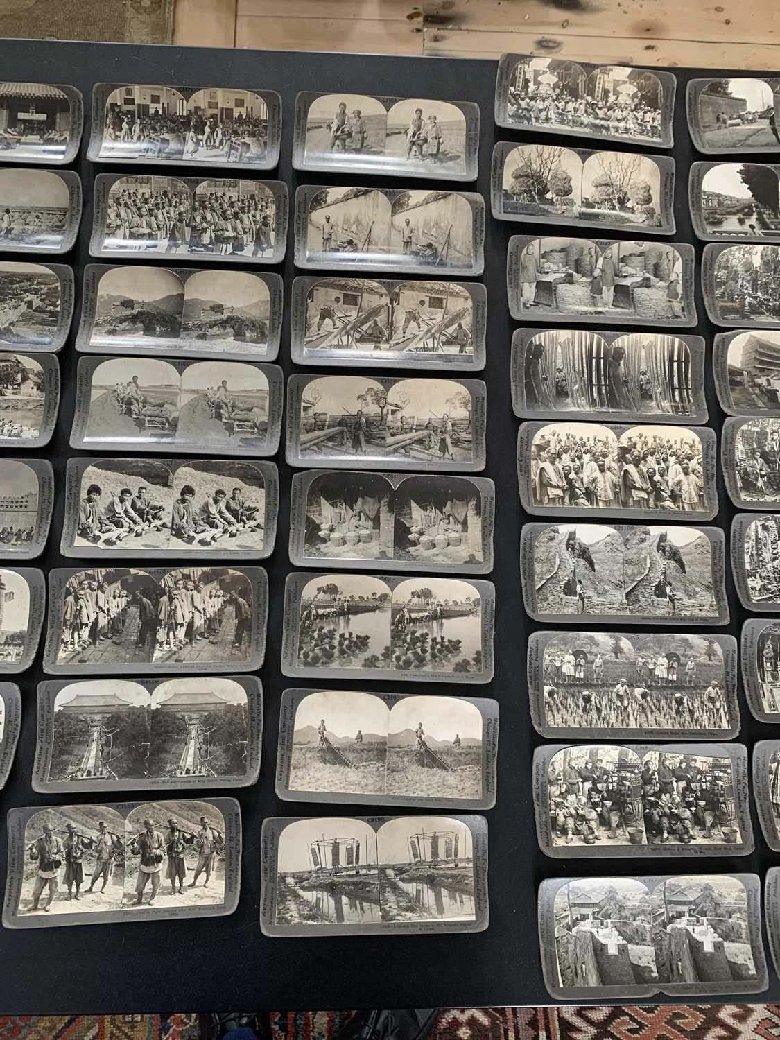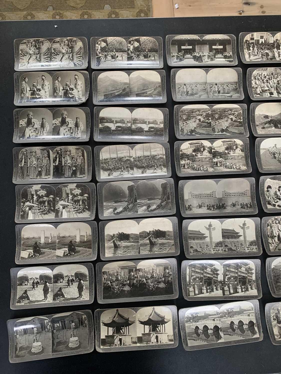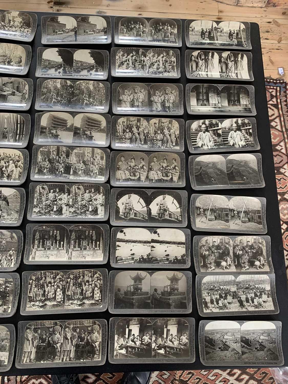 Seventy six stereoviews relating to China, circa 1900-1910. Together with an Underwood & Underwood stereoscope, length 32cm and original stereoviews receipt, bought in Paris for 2300 euros. (78) some losses to cards but mainly good. Extra images of every card now on our website www.davidlay.co.uk