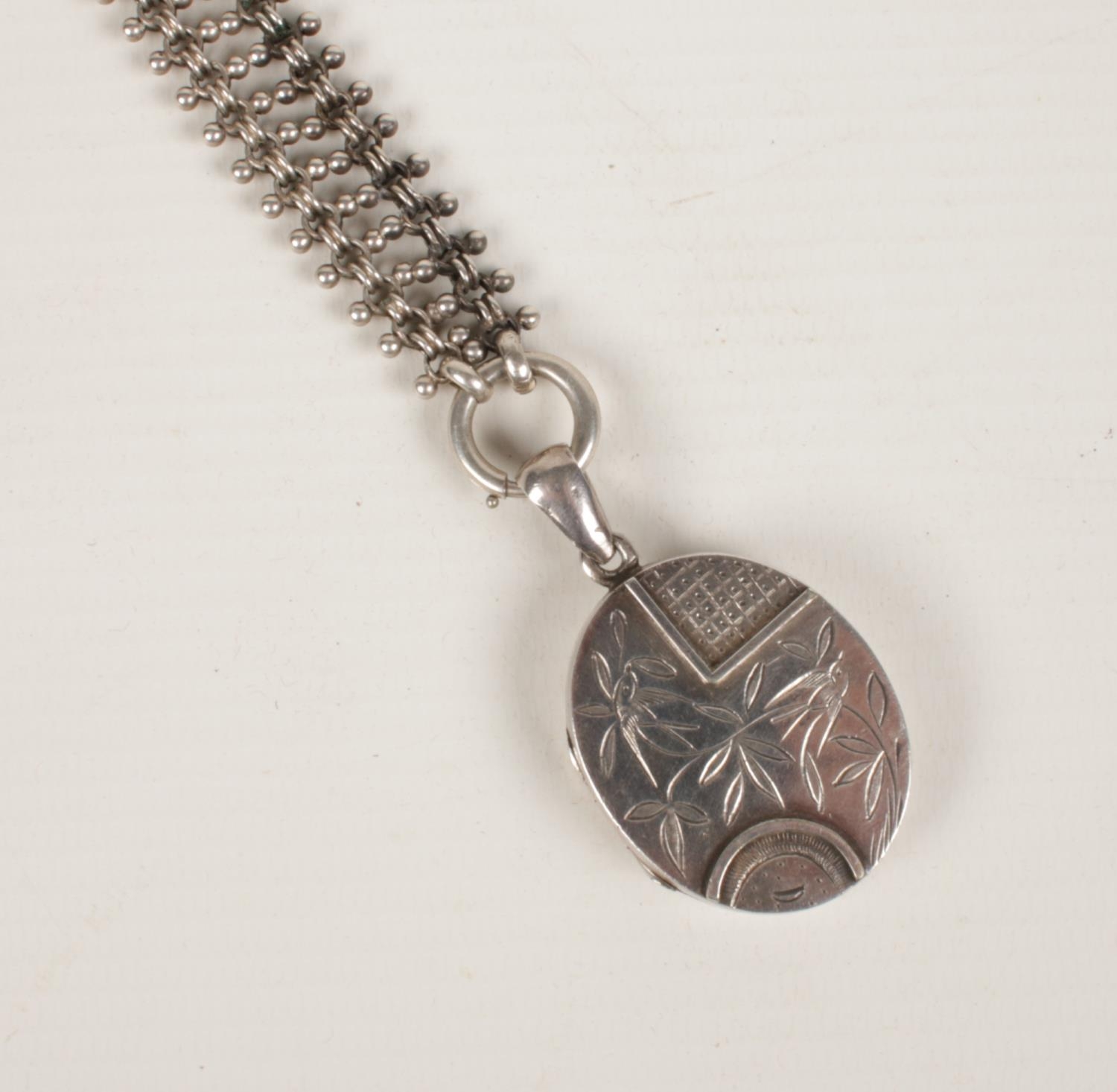 A Victorian white metal locket and chain.