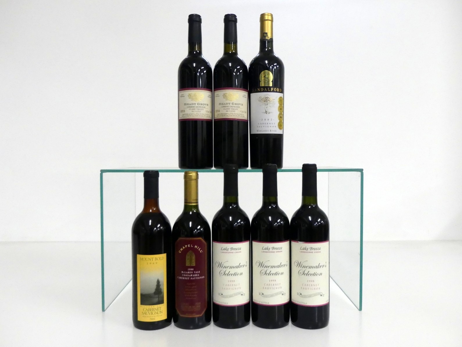 1 bt Mount Bold Cabernet Sauvignon 1989 McLaren Vale us 1 bt Chapel Hill Cabernet Sauvignon 1996 McLaren Vale, Coonawarra ts 3 bts Lake Breeze Winemakers Selection Cabernet Sauvignon 1998 2 i.n, 1 vts 2 bts Shady Grove Cabernet Sauvignon 2000 Clare Valley i.n, vts 1 bt Sandalford Cabernet Sauvignon 2002 Margaret River i.n Above 8 bottles