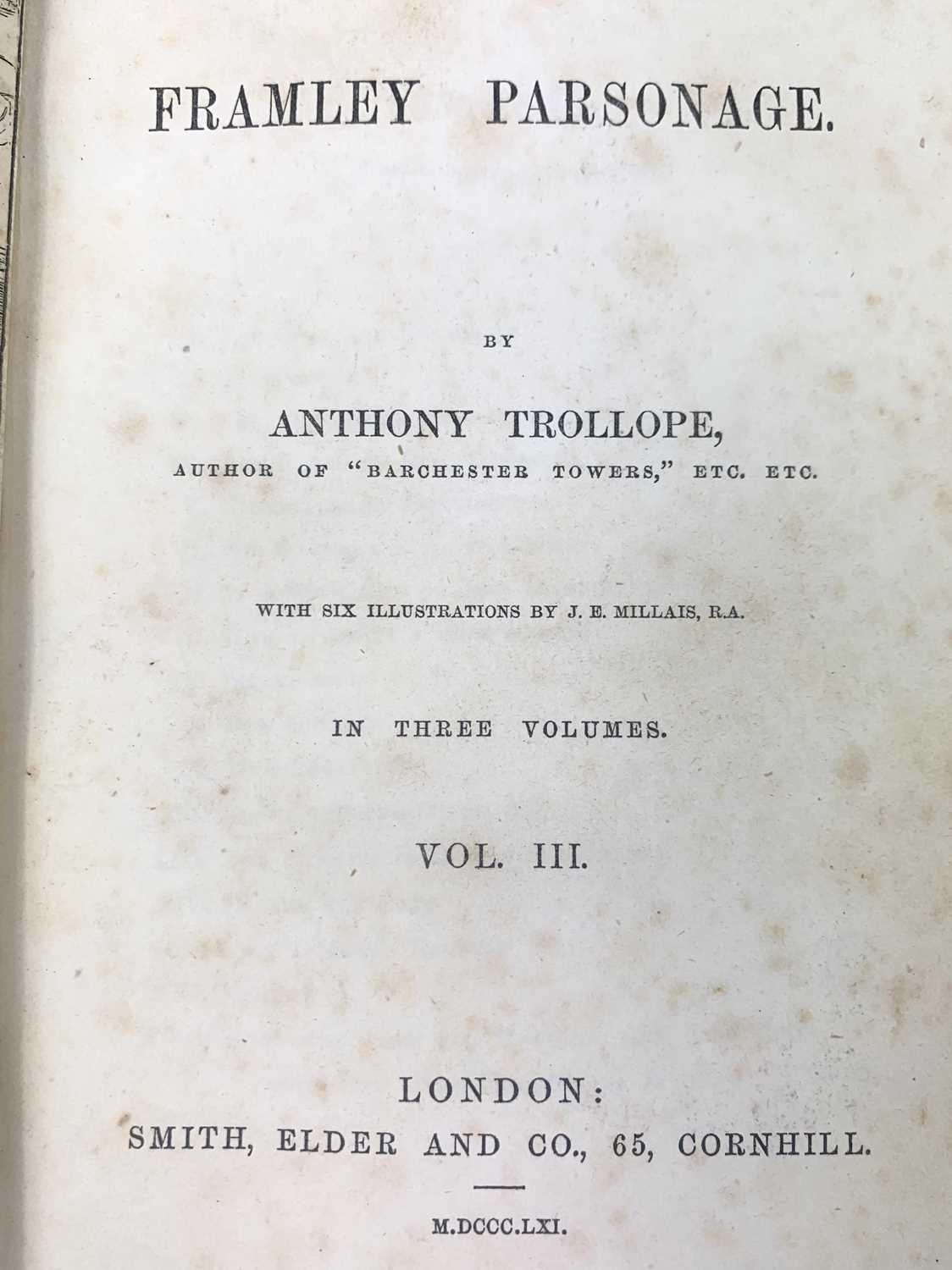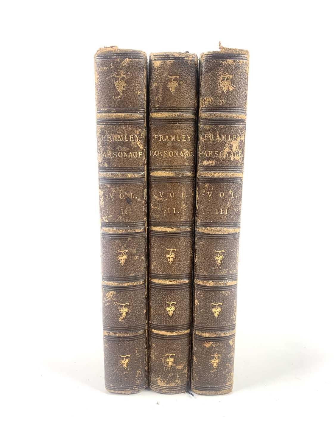 ANTHONY TROLLOPE. 'Framley Parsonage,' first edition, triple decker (three vols), half leather, rubbed and bumped, frontis engraving, Smith, Elder and Co, London, 1861. (3)