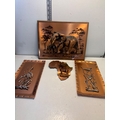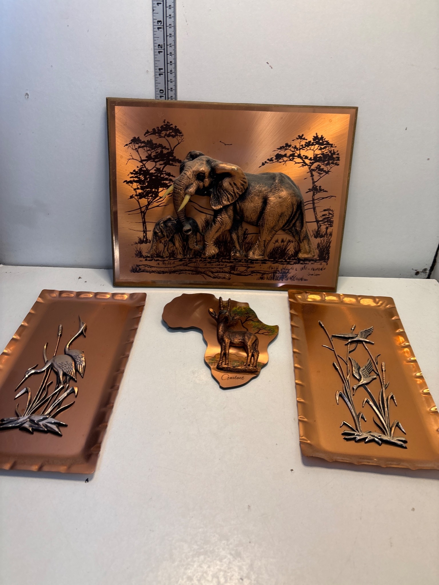 Copper wall plaques featuring embossed designs, including elephants, cranes, and Africa-themed imagery. Variety in shapes and embossed themes. Condition appears used, with some wear visible.